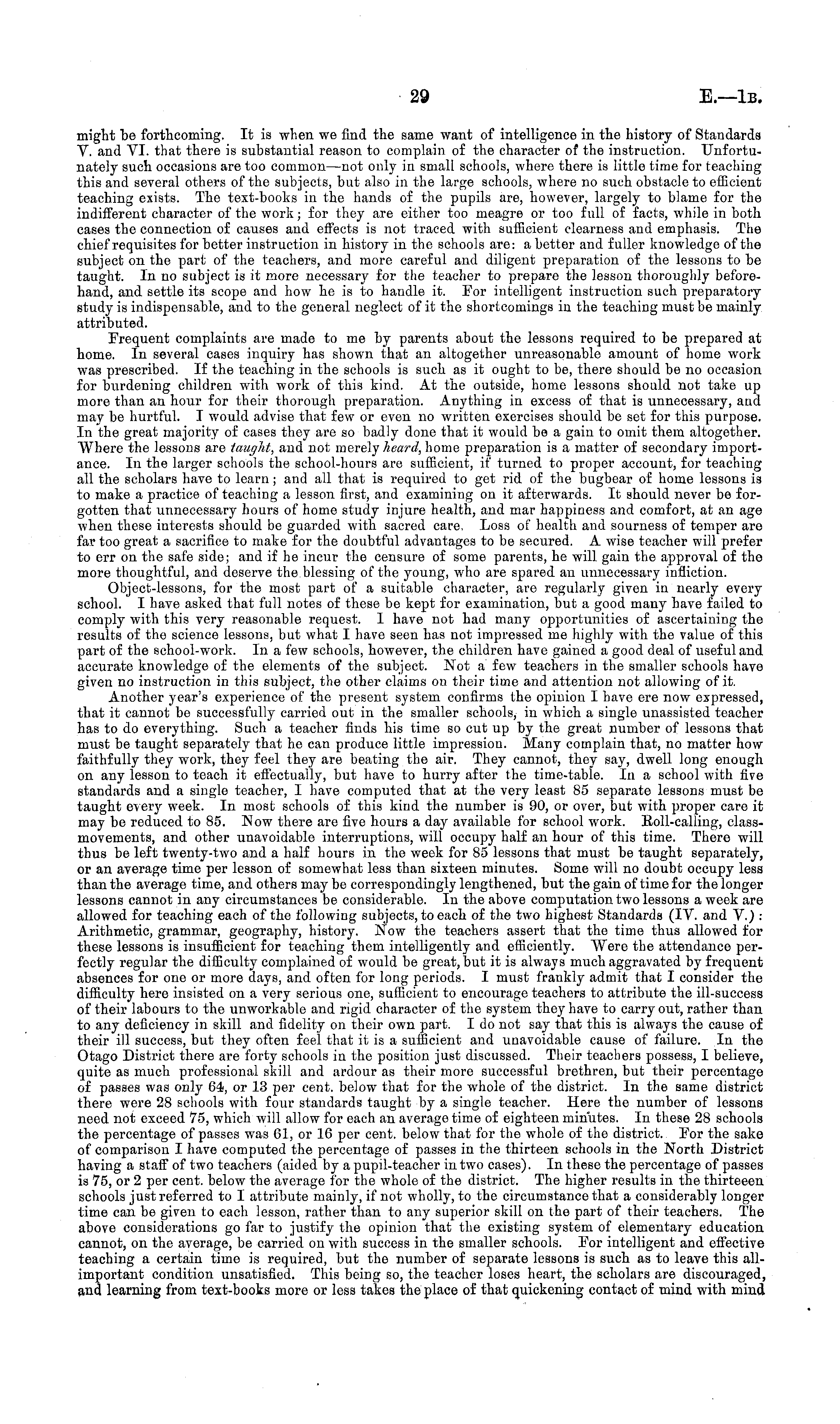 might be forthcoming. It is when we find the same want of intelligence in the history of Standards V. and VI. that there is substantial reason to complain of the character of the instruction. Unfortunately such occasions are too common —not only in small schools, where there is little time for teaching this and several others of the subjects, but also in the large schools, where no such obstacle to efficient teaching exists. The text-books in the hands of the pupils are, however, largely to blame for the indifferent character of the work; for they are either too meagre or too full of facts, while in both cases the connection of causes and effects is not traced with sufficient clearness and emphasis. The chief requisites for better instruction in history in the schools are: a better and fuller knowledge of the subject on the part of the teachers, and more careful and diligent preparation of the lessons to be taught. In no subject is it more necessary for the teacher to prepare the lesson thoroughly beforehand, and settle its scope and how he is to handle it. For intelligent instruction such preparatory study is indispensable, and to the general neglect of it the shortcomings in the teaching must be mainly attributed. Frequent complaints are made to me by parents about the lessons required to be prepared at home. In several cases inquiry has shown that an altogether unreasonable amount of home work was prescribed. If the teaching in the schools is such as it ought to be, there should be no occasion for burdening children with work of this kind. At the outside, home lessons should not take up more than an hour for their thorough preparation. Anything in excess of that is unnecessary, and may be hurtful. I would advise that few or even no written exercises should be set for this purpose. In the great majority of cases they are so badly done that it would be a gain to omit them altogether. Where the lessons are taught, and not merely heard, home preparation is a matter of secondary importance. In the larger schools the school-hours are sufficient, if turned to proper account, for teaching all the scholars have to learn; and all that is required to get rid of the bugbear of home lessons is to make a practice of teaching a lesson first, and examining on it afterwards. It should never be forgotten that unnecessary hours of home study injure health, and mar happiness and comfort, at an age when these interests should be guarded with sacred care, Loss of health and sourness of temper are far too great a sacrifice to make for the doubtful advantages to be secured. A wise teacher will prefer to err on the safe side; and if he incur the censure of some parents, he will gain the approval of the more thoughtful, and deserve the blessing of the young, who are spared an unnecessary infliction. Object-lessons, for the most part of a suitable character, are regularly given in nearly every school. I have asked that full notes of these be kept for examination, but a good many have failed to comply with this very reasonable request. I have not had many opportunities of ascertaining the results of the science lessons, but what I have seen has not impressed me highly with the value of this part of the school-work. In a few schools, however, the children have gained a good deal of useful and accurate knowledge of the elements of the subject. Not a few teachers in the smaller schools have given no instruction in this subject, the other claims on their time and attention not allowing of it. Another year's experience of the present system confirms the opinion I have ere now expressed, that it cannot be successfully carried out in the smaller schools, in which a single unassisted teacher has to do everything. Such a teacher finds his time so cut up by the great number of lessons that must be taught separately that he can produce little impression. Many complain that, no matter how faithfully they work, they feel they are beating the air. They cannot, they say, dwell long enough on any lesson to teach it effectually, but have to hurry after the time-table. Iv a school with five standards and a single teacher, I have computed that at the very least 85 separate lessons must be taught every week. In most schools of this kind the number is 90, or over, but with proper care it may be reduced to 85. Now there are five hours a day available for school work. 8011-calling, classmovements, and other unavoidable interruptions, will occupy half an hour of this time. There will thus be left twenty-two and a half hours in the week for 85 lessons that must be taught separately, or an average time per lesson of somewhat less than sixteen minutes. Some will no doubt occupy less than the average time, and others may be correspondingly lengthened, but the gain of time for the longer lessons cannot in any circumstances be considerable. In the above computation two lessons a week are allowed for teaching each of the following subjects, to each of the two highest Standards (IV. and V.) : Arithmetic, grammar, geography, history. Now the teachers assert that the time thus allowed for these lessons is insufficient for teaching them intelligently and efficiently. Were the attendance perfectly regular the difficulty complained of would be great, but it is always much aggravated by frequent absences for one or more days, and often for long periods. I must frankly admit that I consider the difficulty here insisted on a very serious one, sufficient to encourage teachers to attribute the ill-success of their labours to the unworkable and rigid character of the system they have to carry out, rather than to any deficiency in skill and fidelity on their own part. Ido not say that this is always the cause of their ill success, but they often feel that it is a sufficient and unavoidable cause of failure. In the Otago District there are forty schools in the position just discussed. Their teachers possess, I believe, quite as much professional skill an