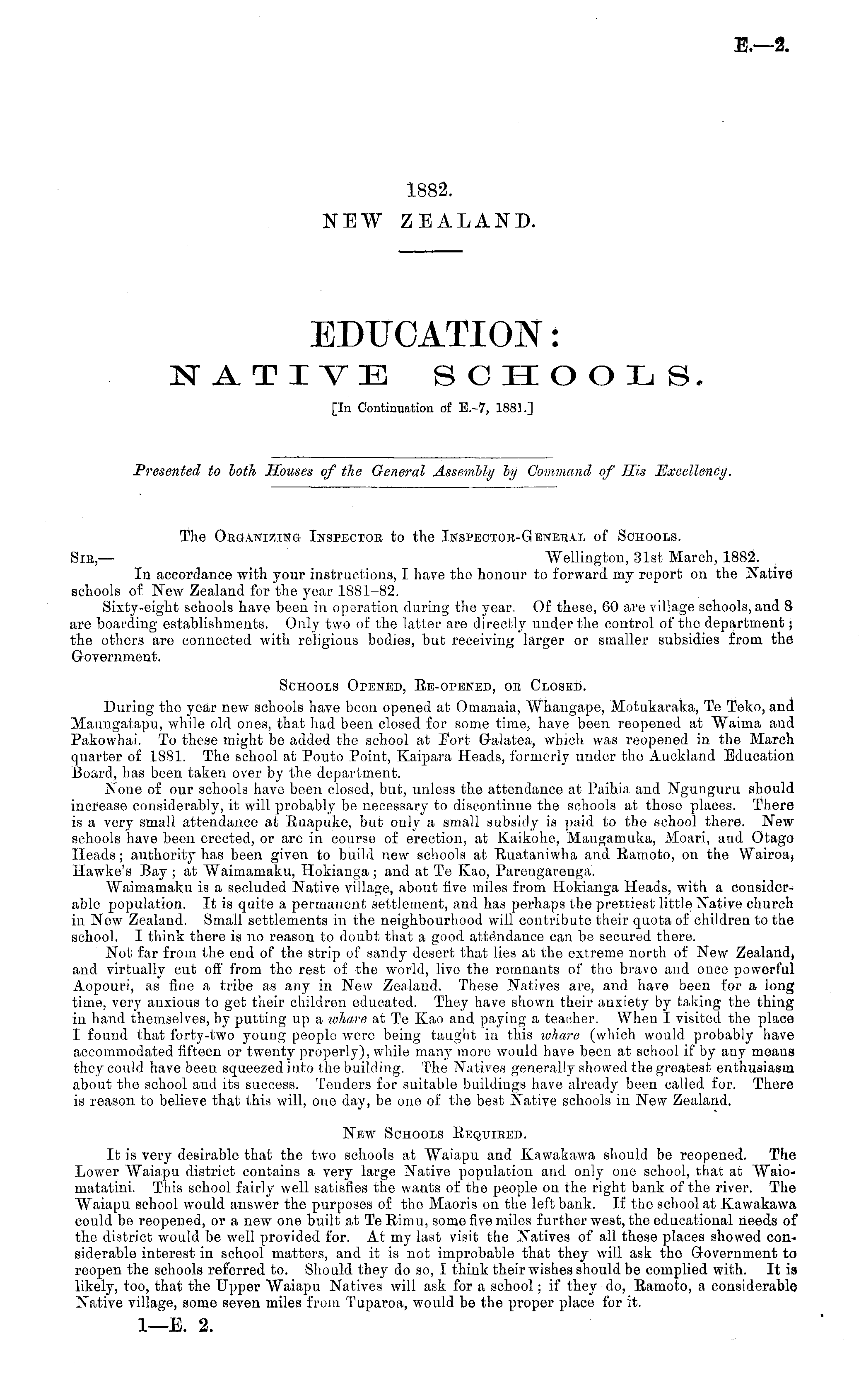 The Oeganizin& Inspector to the Inspectoe-Geneeal of Schools. Sib,— "Wellington, 31st March, 1882. In accordance with your instructions, I have the honour to forward my report on the Native schools of New Zealand for the year 1881-82. Sixty-eight schools have been in operation during the year, Of these, 60 are village schools, and 8 are boarding establishments. Only two of the latter are directly under the control of the department; the others are connected with religious bodies, but receiving larger or smaller subsidies from the Government. Schools Opened, Re-opened, ob Closed. During the year new schools have been opened at Omanaia, Whangape, Motukaraka, Te Teko, and Maungatapu, while old ones, that had been closed for some time, have been reopened at Waima and Pakowhai. To these might be added the school at Fort Galatea, which was reopened in the March quarter of 1881. The school at Pouto Point, Kaipara Heads, formerly under the Auckland Education Board, has been taken over by the department. None of our schools have been closed, but, unless the attendance at Paihia and Ngunguru should increase considerably, it will probably be necessary to discontinue the schools at those places. There is a very small attendance at Ruapuke, but only a small subsidy is paid to the school there. New schools have been erected, or are in course of erection, at Kaikohe, Maugamuka, Moari, and Otago Heads; authority has been given to build new schools at Ruataniwha and Ramoto, on the Wairoa, Hawke's Bay ; at Waimamaku, Hokianga ; and at Te Kao, Parengarenga". Waimamaku is a secluded Native village, about five miles from Hokianga Heads, with a considerable population. It is quite a permanent settlement, and has perhaps the prettiest little Native church in New Zealand. Small settlements in the neighbourhood will contribute their quota of children to the school. I think there is no reason to doubt that a good attendance can be secured there. Not far from the end of the strip of sandy desert that lies at the extreme north of New Zealand, and virtually cut off from the rest of the world, live the remnants of the brave and once powerful Aopouri, as fine a tribe as any in New Zealand. These Natives are, and have been for a long time, very anxious to get their children educated. They have shown their anxiety by taking the thing in hand themselves, by putting up a whare at Te Kao and paying a teauher. When 1 visited the place I found that forty-two young people were being taught in this whare (which would probably have accommodated fifteen or twenty properly), while many more would have been at school if by any meana they could have been squeezed into the building. The Natives generally showed the greatest enthusiasm about the school and its success. Tenders for suitable buildings have already been called for. There is reason to believe that this will, one day, be one of the best Native schools in New Zealand. New Schools Requibed. It is very desirable that the two schools at Waiapu and Kawakawa should be reopened. The Lower Waiapu district contains a very large Native population and only one school, that at Waiomatatini. This school fairly well satisfies the wants of the people on the right bank of the river. The Waiapu school would answer the purposes of the Maoris on the left bank. If the school at Kawakawa could be reopened, or a new one built at Te Rimu, some five miles further west, the educational needs of the district would be well provided for. At my last visit the Natives of all these places showed considerable interest in school matters, and it is not improbable that they will ask the Government to reopen the schools referred to. Should they do so, I think their wishes should be complied with. It is likely, too, that the Upper Waiapu Natives will ask for a school; if they do, Ramoto, a considerable Native village, some seven miles from Tuparoa, would be the proper place for it. I—E. 2.