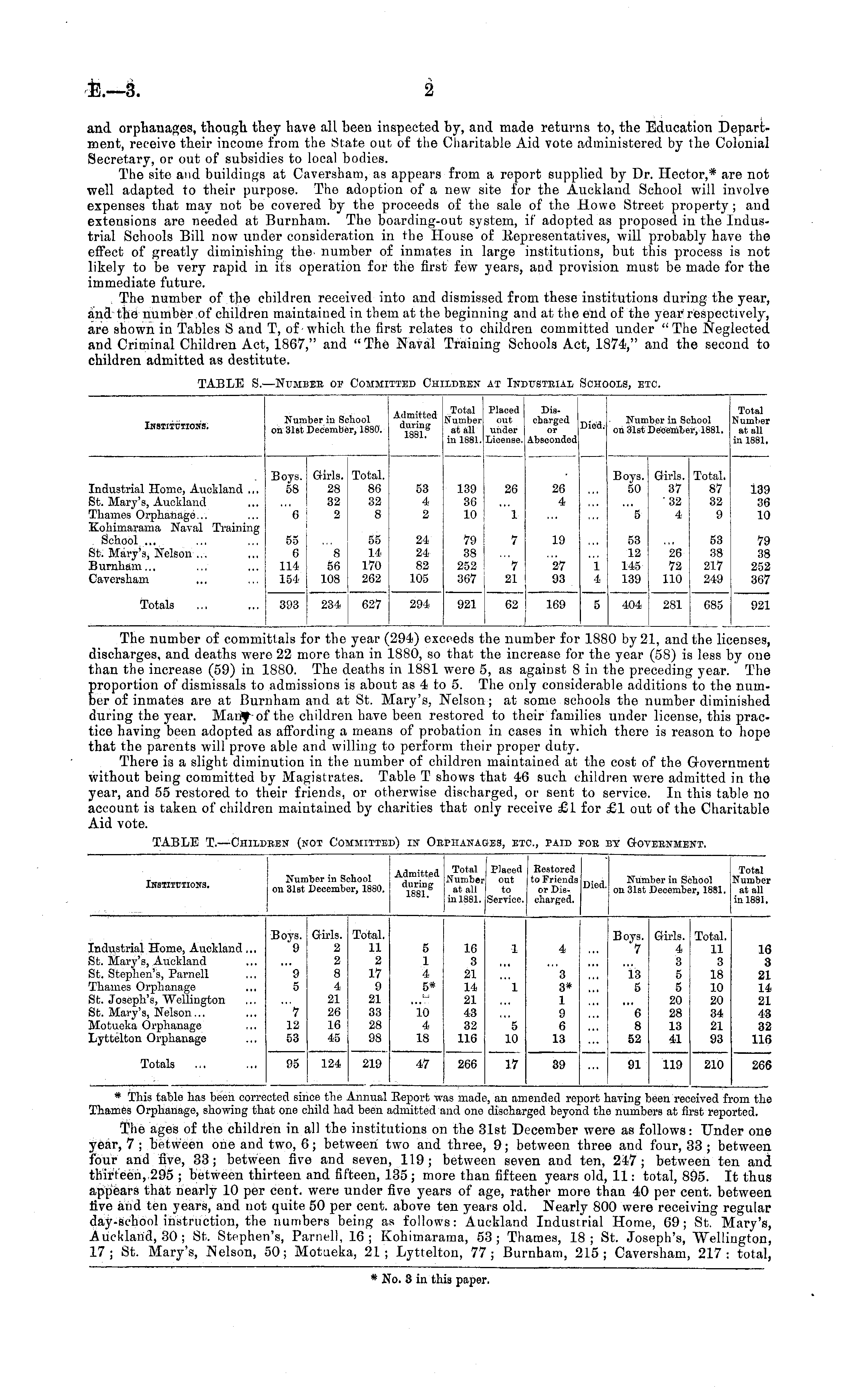 and orphanages, though they have all been inspected by, and made returns to, the Education Department, receive their income from the State out of the Charitable Aid vote administered by the Colonial Secretary, or out of subsidies to local bodies. The site and buildings at Caversham, as appears from a report supplied by Dr. Hector,* are not well adapted to their purpose. The adoption of a new site for the Auckland School will involve expenses that may not be covered by the proceeds of the sale of the Howe Street property; and extensions are needed at Burnham. The boarding-out system, if adopted as proposed in the Industrial Schools Bill now under consideration in the House of Eepresentatives, will probably have the effect of greatly diminishing the. number of inmates in large institutions, but this process is not likely to be very rapid in its operation for the first few years, and provision must be made for the immediate future. The number of the children received into and dismissed from these institutions during the year, and the number of children maintained in them at the beginning and at the end of the year respectively, are shown in Tables S and T, of which the first relates to children committed under " The Neglected and Criminal Children Act, 1867," and " The Naval Training Schools Act, 1874," and the second to children admitted as destitute.