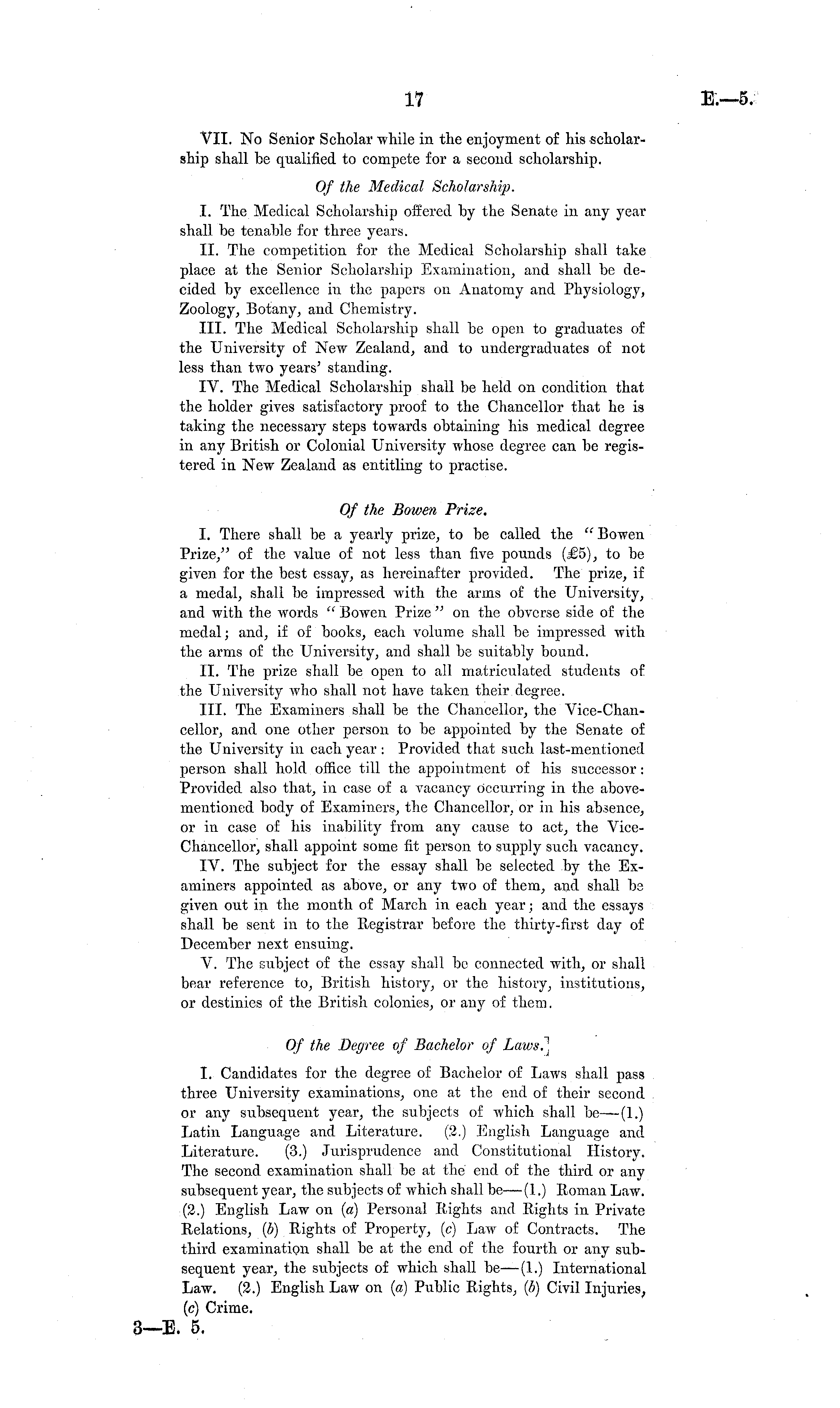 VII. No Senior Scholar while in the enjoyment of his scholarship shall be qualified to compete for a second scholarship. Of the Medical Scholarship. I. The Medical Scholarship offered by the Senate in any year shall be tenable for three years. 11. The competition for the Medical Scholarship shall take place at the Senior Scholarship Examination, and shall be decided by excellence in the papers on Anatomy and Physiology, Zoology, Botany, and Chemistry. 111. The Medical Scholarship shall be open to graduates of the University of New Zealand, and to undergraduates of not less than two years' standing. IV. The Medical Scholarship shall be held on condition that the holder gives satisfactory proof to the Chancellor that he is taking the necessary steps towards obtaining his medical degree in any British or Colonial University whose degree can be registered in New Zealand as entitling to practise. Of the Bowen Prize. I. There shall be a yearly prize, to be called the "Bowen Prize," of the value of not less than five pounds (£5), to be given for the best essay, as hereinafter provided. The prize, if a medal, shall be impressed with the arms of the University, and with the words " Bowen Prize " on the obverse side of the medal; and, if of books, each volume shall be impressed with the arms of the University, and shall be suitably bound. 11. The prize shall be open to all matriculated students of the University who shall not have taken their degree. 111. The Examiners shall be the Chancellor, the Vice-Chan-cellor, and one other person to be appointed by the Senate of the University in each year : Provided that such last-mentioned person shall hold office till the appointment of his successor: Provided also that, in case of a vacancy occurring in the abovementioned body of Examiners, the Chancellor, or in his absence, or in case of his inability from any cause to act, the ViceChancellor, shall appoint some fit person to supply such vacancy. IV. The subject for the essay shall be selected by the Examiners appointed as above, or any two of them, and shall be given out in the month of March in each year; and the essays shall be sent in to the Registrar before the thirty-first day of December next ensuing. V. The subject of the essay shall be connected with, or shall bear reference to, British history, or the history, institutions, or destinies of the British colonies, or any of them. Of the Degree of Bachelor of Laws?. I. Candidates for the degree of Bachelor of Laws shall pass three University examinations, one at the end of their second or any subsequent year, the subjects of which shall be—(l.) Latin Language and Literature. (2.) English Language and Literature. (3.) Jurisprudence and Constitutional History. The second examination shall be at the end of the third or any subsequent year, the subjects of which shall be—(l.) Roman Law. (2.) English Law on (a) Personal Rights and Rights in Private Relations, (b) Rights of Property, (c) Law of Contracts. The third examination shall be at the end of the fourth or any subsequent year, the subjects of which shall be—(l.) International Law. (2.) English Law on (a) Public Rights, (b) Civil Injuries, (c) Crime.