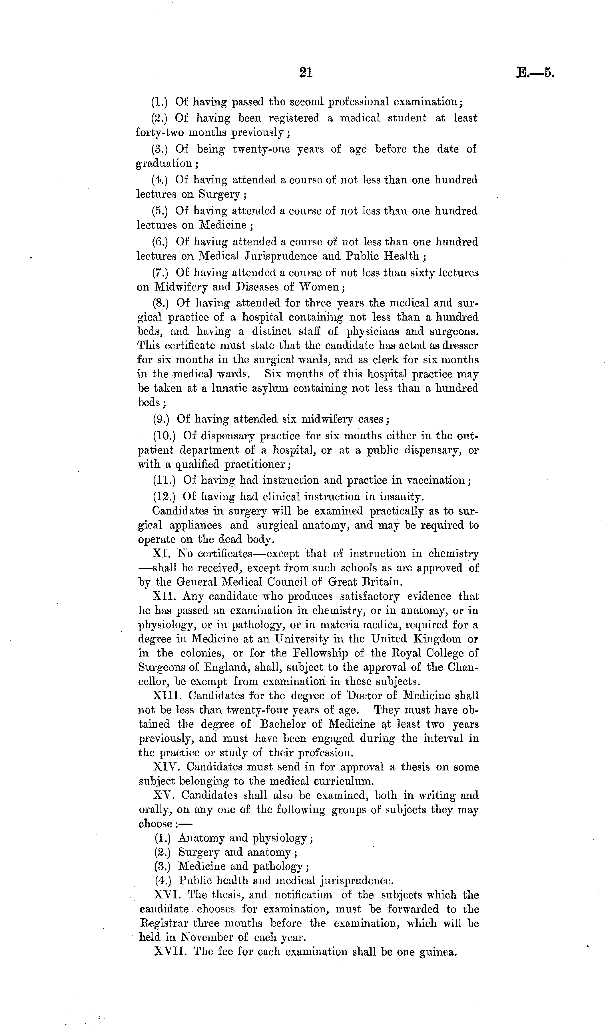 (1.) Of having passed the second professional examination; (2.) Of having been registered a medical student at least forty-two months previously; (3.) Of being twenty-one years of age before the date of graduation; (4.) Of having attended a course of not less than one hundred lectures on Surgery; (5.) Of having attended a course of not less than one hundred lectures on Medicine; (6.) Of having attended a course of not less than one hundred lectures on Medical Jurisprudence and Public Health; (7.) Of having attended a course of not less than sixty lectures on Midwifery and Diseases of Women; (8.) Of having attended for three years the medical and surgical practice of a hospital containing not less than a hundred beds, and having a distinct staff of physicians and surgeons. This certificate must state that the candidate has acted as dresser for six months in the surgical wards, and as clerk for six months in the medical wards. Six months of this hospital practice may be taken at a lunatic asylum containing not less than a hundred beds; (9.) Of having attended six midwifery cases; (10.) Of dispensary practice for six months either in the outpatient department of a hospital, or at a public dispensary, or with a qualified practitioner; (11.) Of having had instruction and practice in vaccination; (12.) Of having had clinical instruction in insanity. Candidates in surgery will be examined practically as to surgical appliances and surgical anatomy, and may be required to operate on the dead body. XI. No certificates—except that of instruction in chemistry —shall be received, except from such schools as are approved of by the General Medical Council of Great Britain. XII. Any candidate who produces satisfactory evidence that he has passed an examination in chemistry, or in anatomy, or in physiology, or in pathology, or in materia medica, required for a degree in Medicine at an University in the United Kingdom or in the colonies, or for the Fellowship of the Royal College of Surgeons of England, shall, subject to the approval of the Chancellor, be exempt from examination in these subjects. XIII. Candidates for the degree of Doctor of Medicine shall not be less than twenty-four years of age. They must have obtained the degree of Bachelor of Medicine at least two years previously, and must have been engaged during the interval in the practice or study of their profession. XIV. Candidates must send in for approval a thesis on some subject belonging to the medical curriculum. XV. Candidates shall also be examined, both in writing and orally, on any one of the following groups of subjects they may choose :— (1.) Anatomy and physiology; (2.) Surgery and anatomy; (3.) Medicine and pathology ; (4.) Public health and medical jurisprudence. XVI. The thesis, and notification of the subjects which the candidate chooses for examination, must be forwarded to the Registrar three months before the examination, which will be held in November of each year. XVII. The fee for each examination shall be one guinea.