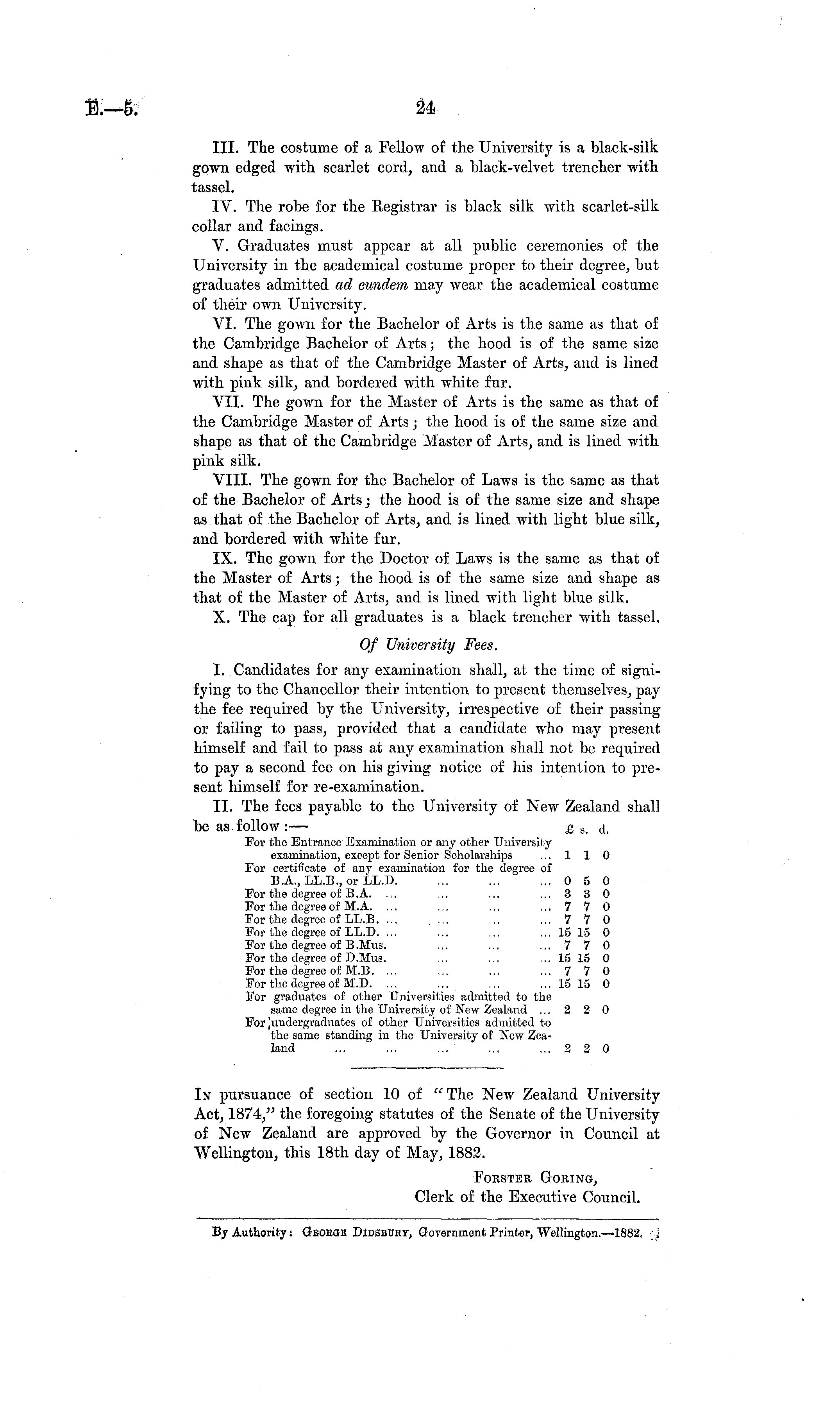In pursuance of section 10 of "The New Zealand University Act, 1874," the foregoing statutes of the Senate of the University of New Zealand are approved by the Governor in Council at Wellington, this 18th day of May, 1882. Forster Goring, Clerk of the Executive Council.