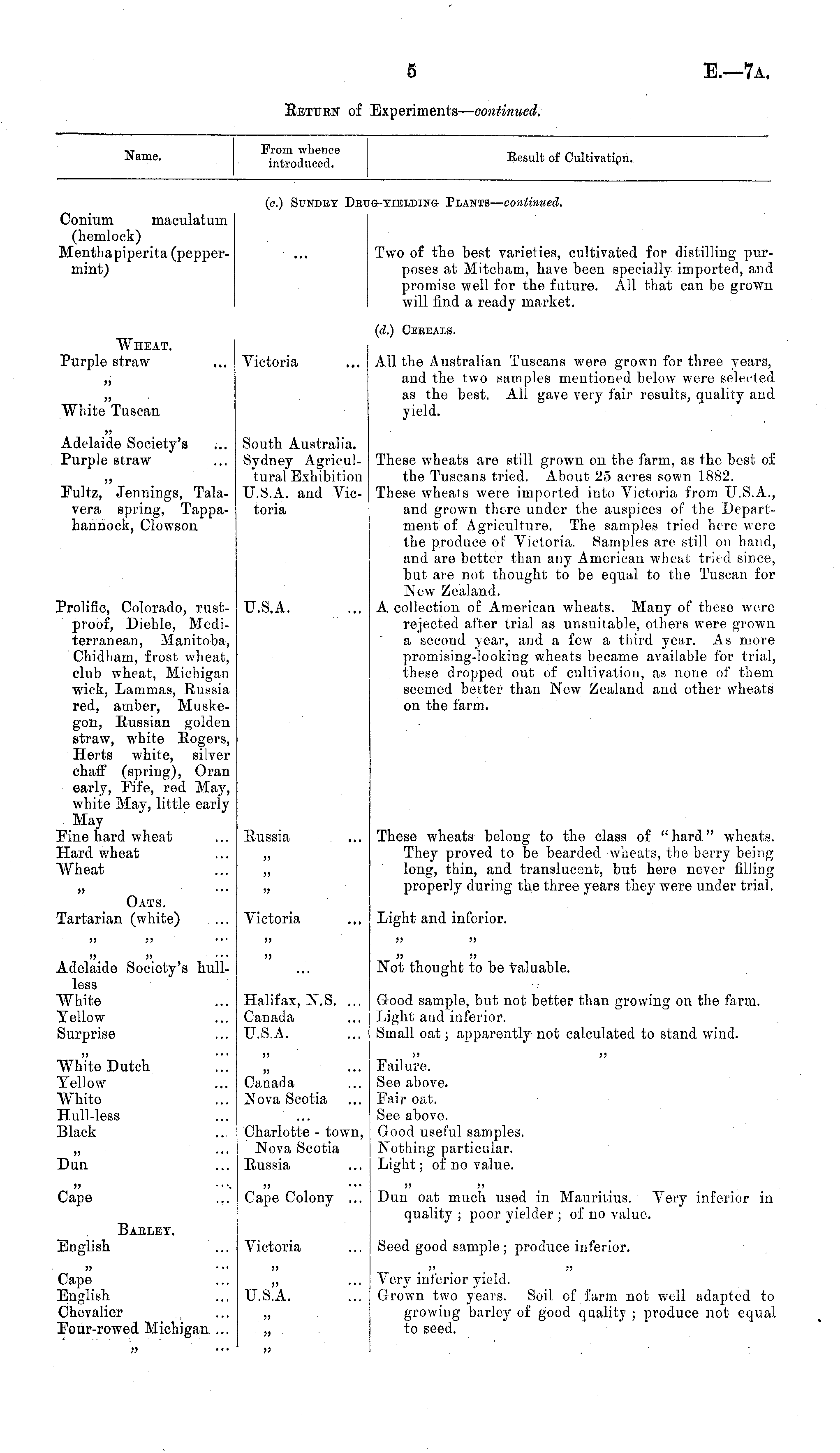 Name. From whence introduced. Eesult of Cultivatipn. (c.) Sundey Dei Q-TIELDINQ- PLANTS — continued. Conium maculatum (hemlock) Menthapiperita (peppermint) Two of the best varieties, cultivated for distilling purposes at Mitcham, have been specially imported, and promise well for the future. All that can be grown will find a ready market. "Wheat. Purple straw Victoria (d.) Ceeeais. All the Australian Tuscans were grown for three years, and the two samples mentioned below were selected as the best. All gave very fair results, quality and yield. >> White Tuscan South Australia. Sydney Agricultural Exhibition U.S.A. and Victoria Adelaide Society's Purple straw These wheats are still grown on the farm, as the best of the Tuscans tried. About 25 acres sown 1882. These wheats were imported into Victoria from U.S.A., and grown there under the auspices of the Department of Agriculture. The samples tried here were the produce of Victoria. Samples are still on hand, and are better than any American wheat tried since, but are not thought to be equal to the Tuscan for New Zealand. A collection of American wheats. Many of these were rejected after trial as unsuitable, others were grown a second year, and a few a third year. As more promising-looking wheats became available for trial, these dropped out of cultivation, as none of them seemed better than New Zealand and other wheats on the farm. Fultz, Jennings, Talavera spring, Tappahannock, Clowson Prolific, Colorado, rustproof, Diehle, Mediterranean, Manitoba, Chidham, frost wheat, club wheat, Michigan wick, Lammas, Russia red, amber, Muskegon, Russian golden straw, white Rogers, Herts white, silver chaff (spring), Oran early, Fife, red May, white May, little early May Fine hard wheat Hard wheat Wheat U.S.A. Russia These wheats belong to the class of " hard" wheats. They proved to be bearded -wheats, the berry being long, thin, and translucent, but here never filling properly during the three years they were under trial. j: )) jj !J Oats. Tartarian (white) Victoria Light and inferior. jj )> jj jj >> Adelaide Society's hullless White Yellow Surprise 5) Not thought to be valuable. Halifax, N.S. ... Canada U.S.A. Good sample, but not better than growing on the farm. Light and inferior. Small oat; apparently not calculated to stand wind. White Dutch Yellow White Hull-less Black 5> ,, ... Canada Nova Scotia Charlotte - town, Nova Scotia Russia Failure. See above. Fair oat. See above. Good useful samples. Nothing particular. Light; of no value. 5) ... Dua Cape ,, ... Cape Colony ... Dun oat much used in Mauritius. Very inferior in quality ; poor yielder ; of no value. Babley. Victoria English Seed good sample; produce inferior. Cape English Chevalier Four-rowed Michigan ... >> Very inferior yield. Grown two years. Soil of farm not well adapted to growing barley of good quality ; produce not equal to seed. TJ.B-A. ... ?; 5> » ))