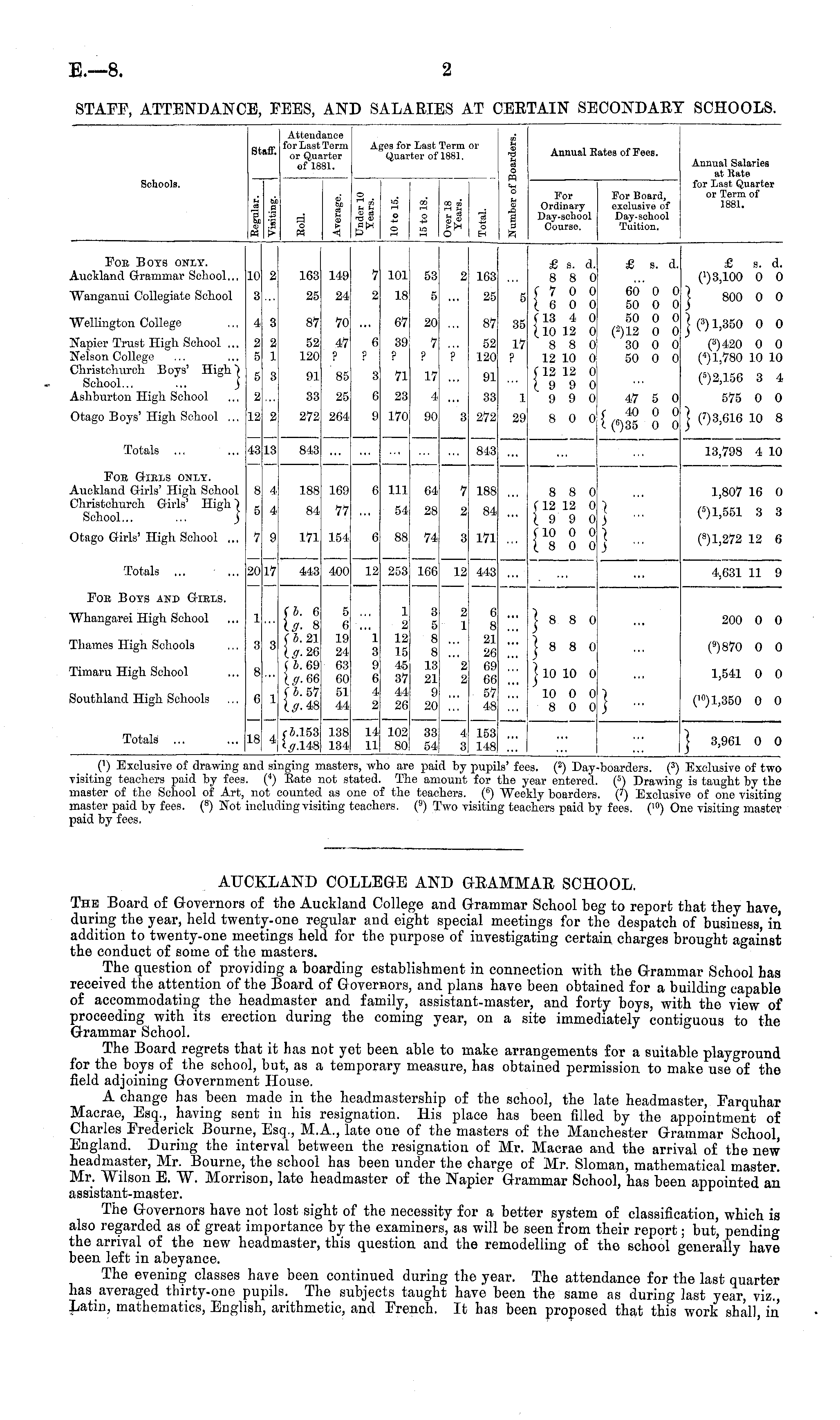 AUCKLAND COLLEGE AND GEAMMAB SCHOOL. The Board of Governors of the Auckland College and Grammar School beg to report that they have, during the year, held twenty-one regular and eight special meetings for the despatch of business, in addition to twenty-one meetings held for the purpose of investigating certain charges brought against the conduct of some of the masters. The question of providing a boarding establishment in connection with the Grammar School has received the attention of the Board of Governors, and plans have been obtained for a building capable of accommodating the headmaster and family, assistant-master, and forty boys, with the view of proceeding with its erection during the coming year, on a site immediately contiguous to the Grammar School. The Board regrets that it has not yet been able to make arrangements for a suitable playground for the boys of the school, but, as a temporary measure, has obtained permission to make use of the field adjoining Government House. A change has been made in the headmastership of the school, the late headmaster, Earquhar Macrae, Esq., having sent in his resignation. His place has been filled by the appointment of Charles Frederick Bourne, Esq., M.A., late one of the masters of the Manchester Grammar School England. During the interval between the resignation of Mr. Macrae and the arrival of the new headmaster, Mr. Bourne, the school has been under the charge of Mr. Sloman, mathematical master. Mr. Wilson E. W. Morrison, late headmaster of the Napier Grammar School, has been appointed an assistant-master. The Governors have not lost sight of the necessity for a better system of classification, which is also regarded as of great importance by the examiners, as will be seen from their report; but, pending the arrival of the new headmaster, this question and the remodelling of the school generally have been left in abeyance. The evening classes have been continued during the year. The attendance for the last quarter has averaged thirty-one pupils. The subjects taught have been the same as during last year, viz., Latin, mathematics, English, arithmetic, and Trench. It has been proposed that this work shall, in