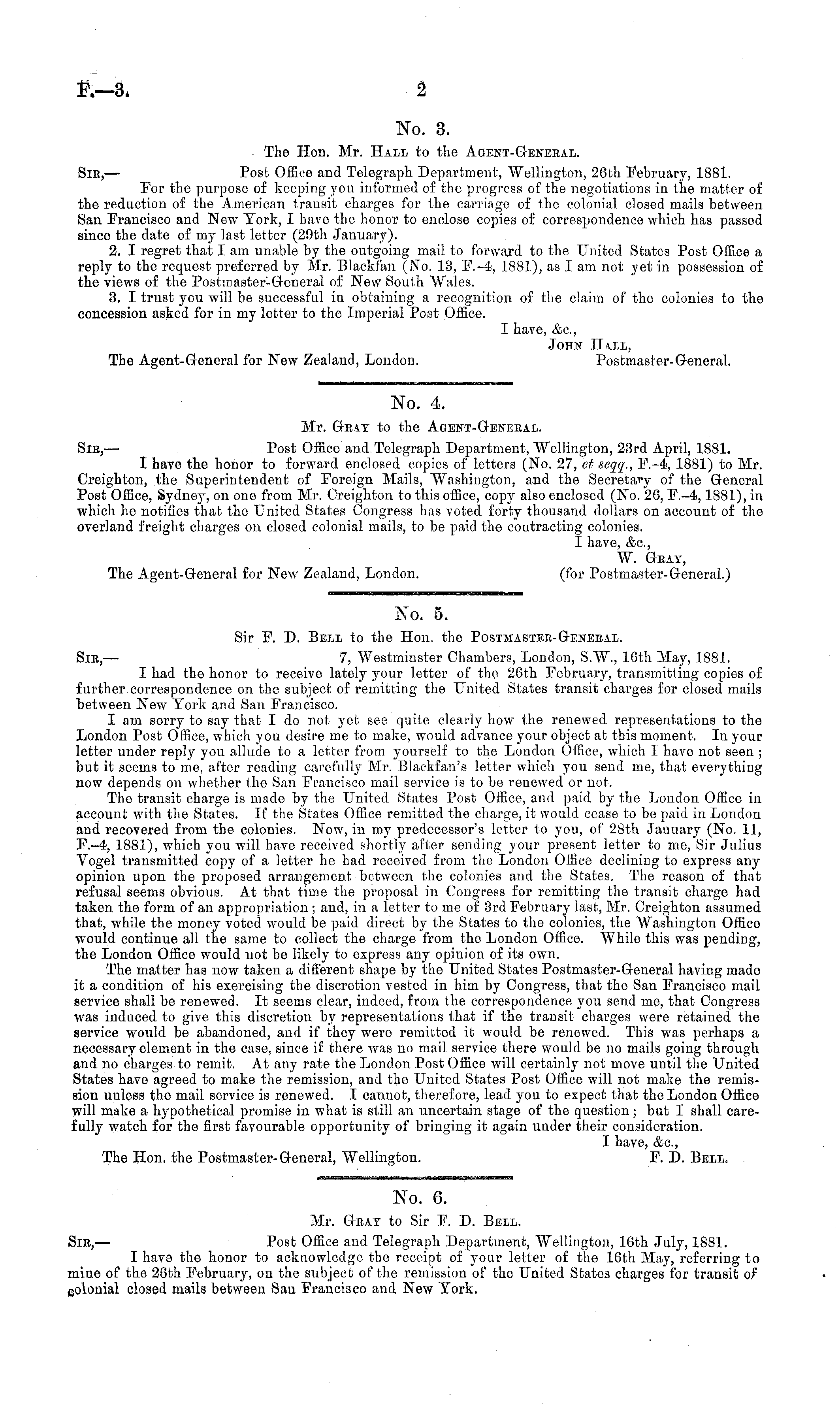 No. 6. Mr. Gray to Sir F. D. Bell. Sib, — Post Office and Telegraph Department, Wellington, 16th. July, 1881. I have the honor to acknowledge the receipt of your letter of the 16th May, referring to mine of the 26th February, on the subject of the remission of the United States charges for transit of colonial closed mails between Sau Francisco and New York.