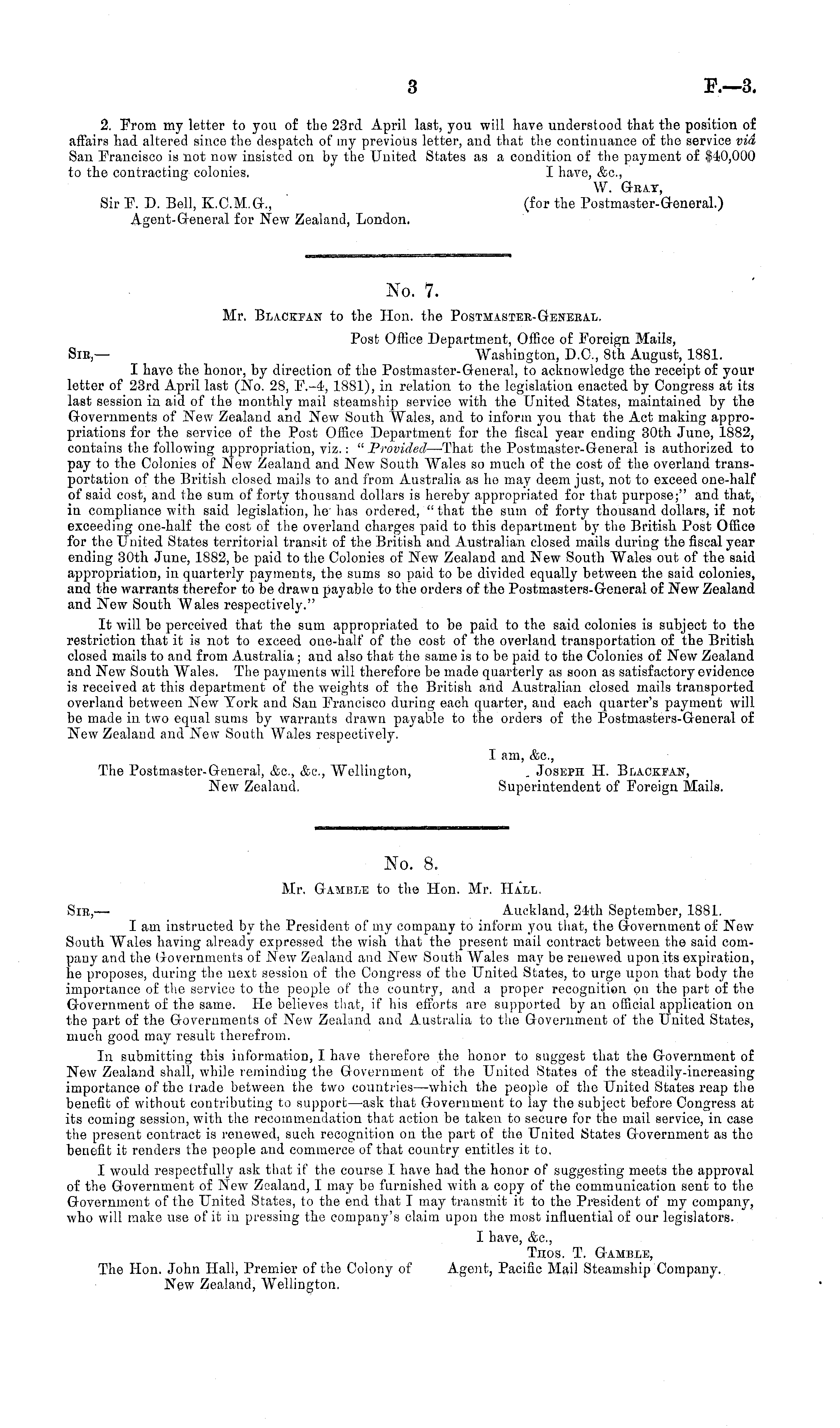 No. 7. Mr. Bi,vcKFAN to the Hon. the Postmaster-General. Post Office Department, Office of Foreign Mails, Sib,— Washington, D.C., Bth August, 1881. I have the honor, by direction of the Postmaster-General, to acknowledge the receipt of your letter of 23rd April last (No. 28, F.-4, 1881), in relation to the legislation enacted by Congress at its last session in aid of the monthly mail steamship service with the United States, maintained by the Governments of New Zealand and New South Wales, and to inform you that the Act making appropriations for the service of the Post Office Department for the fiscal year ending 30th June, 1882, contains the following appropriation, viz.: "Provided —-That the Postmaster-General is authorized to pay to the Colonies of New Zealand and New South Wales so much of the cost of the overland transportation of the British closed mails to and from Australia as ho may deem just, not to exceed one-half of said cost, and the sum of forty thousand dollars is hereby appropriated for that purpose;" and that, in compliance with said legislation, he has ordered, "that the sum of forty thousand dollars, if not exceeding one-half the cost of the overland charges paid to this department by the British Post Office for the United States territorial transit of the British and Australian closed mails during the fiscal year ending 30th June, 1882, be paid to the Colonies of New Zealand and New South Wales out of the said appropriation, in quarterly payments, the sums so paid to be divided equally between the said colonies, and the warrants therefor to be drawn payable to the orders of the Postmasters-General of New Zealand and New South Wales respectively." It will be perceived that the sum appropriated to be paid to the said colonies is subject to the restriction that it is not to exceed one-half of the cost of the overland transportation of the British closed mails to and from Australia ; and also that the same is to be paid to the Colonies of New Zealand and New South Wales. The payments will therefore be made quarterly as soon as satisfactory evidence is received at this department of the weights of the British and Australian closed mails transported overland between New York and San Francisco during each quarter, and each quarter's payment will be made in two equal sums by warrants drawn payable to the orders of the Postmasters-General of New Zealand and New South Wales respectively. I am, &c, The Postmaster-General, &c, &c, Wellington, , Joseph H. Blaokfah", New Zealand. Superintendent of Foreign Mails.