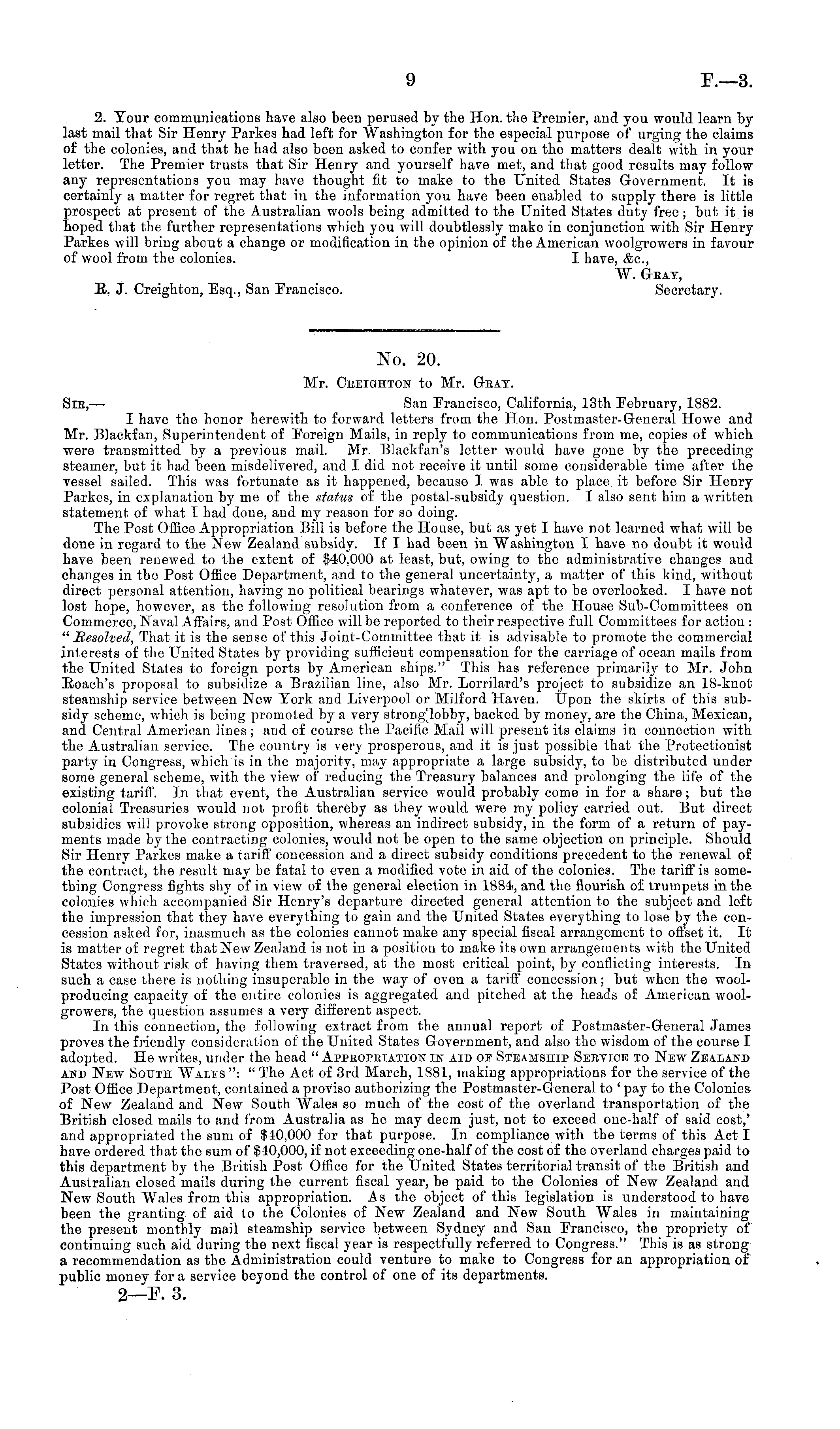 No. 20. Mr. Cbeigiiton to Mr. Geay. Sic, — San Francisco, California, 13th February, 1882. I have the honor herewith to forward letters from the Hon. Postmaster-General Howe and Mr. Blackfan, Superintendent of Foreign Mails, in reply to communications from me, copies of which were transmitted by a previous mail. Mr. Blackfan's letter would have gone by the preceding steamer, but it had been misdelivered, and I did not receive it until some considerable time after the vessel sailed. This was fortunate as it happened, because I was able to place it before Sir Henry Parkes, in explanation by me of the status of the postal-subsidy question. I also sent him a written statement of what I had done, and my reason for so doing. The Post Office Appropriation Bill is before the House, but as yet I have not learned what will be done in regard to the New Zealand subsidy. If I had been in Washington I have no doubt it would have been renewed to the extent of $40,000 at least, but, owing to the administrative changes and changes in the Post Office Department, and to the general uncertainty, a matter of this kind, without direct personal attention, having no political bearings whatever, was apt to be overlooked. I have not lost hope, however, as the following resolution from a conference of the House Sub-Committees on Commerce, Naval Affairs, and Post Office will be reported to their respective full Committees for action : " Besolved, That it is the sense of this Joint-Committee that it is advisable to promote the commercial interests of the United States by providing sufficient compensation for the carriage of ocean mails from the United States to foreign ports by American ships." This has reference primarily to Mr. John Roach's proposal to subsidize a Brazilian line, also Mr. Lorrilard's project to subsidize an 18-knot steamship service between New York and Liverpool or Milford Haven. Upon the skirts of this subsidy scheme, which is being promoted by a very strong'lobby, backed by money, are the China, Mexican, and Central American lines ; and of course the Pacific Mail will present its claims in connection with the Australian service. The country is very prosperous, and it is just possible that the Protectionist party in Congress, which is in the majority, may appropriate a large subsidy, to be distributed under some general scheme, with the view of reducing the Treasury balances and prolonging the life of the existing tariff. In that event, the Australian service would probably come in for a share; but the colonial Treasuries would not profit thereby as they would were my policy carried out. But direct subsidies will provoke strong opposition, whereas an indirect subsidy, in the form of a return of payments made by the contracting colonies, would not be open to the same objection on principle. Should Sir Henry Parkes make a tariff concession and a direct subsidy conditions precedent to the renewal of the contract, the result may be fatal to even a modified vote in aid of the colonies. The tariff is something Congress fights shy of in view of the general election in 1884, and the flourish of trumpets in the colonies which accompanied Sir Henry's departure directed general attention to the subject and left the impression that they have everything to gain and the United States everything to lose by the concession asked for, inasmuch as the colonies cannot make any special fiscal arrangement to offset it. It is matter of regret that New Zealand is not in a position to make its own arrangements with the United States without risk of having them traversed, at the most critical point, by conflicting interests. In such a case there is nothing insuperable in the way of even a tariff concession; but when the woolproducing capacity of the entire colonies is aggregated and pitched at the heads of American woolgrowers, the question assumes a very different aspect. In this connection, the following extract from the annual report of Postmaster-General James proves the friendly consideration of the United States Government, and also the wisdom of the course I adopted. He writes, under the head " Appropriation in aid of Steamship Service to New Zealand and New South Wales ": " The Act of 3rd March, 1881, making appropriations for the service of the Post Office Department, contained a proviso authorizing the Postmaster-General to ' pay to the Colonies of New Zealand and New South Wales so much of the cost of the overland transportation of the British closed mails to and from Australia as he may deem just, not to exceed one-half of said cost,' and appropriated the sum of $10,000 for that purpose. In compliance with the terms of this Act I have ordered that the sum of $10,000, if not exceeding one-half of the cost of the overland charges paid to this department by the British Post Office for the United States territorial transit of the British and Australian closed mails during the current fiscal year, be paid to the Colonies of New Zealand and New South Wales from this appropriation. As the object of this legislation is understood to have been the granting of aid to the Colonies of New Zealand and New South Wales in maintaining the present monthly mail steamship service between Sydney and San Francisco, the propriety of continuing such aid during the next fiscal year is respectfully referred to Congress." This is as strong a recommendation as the Administration could venture to make to Congress for an appropriation of public money for a service beyond the control of one of its departments. 2—F. 3.