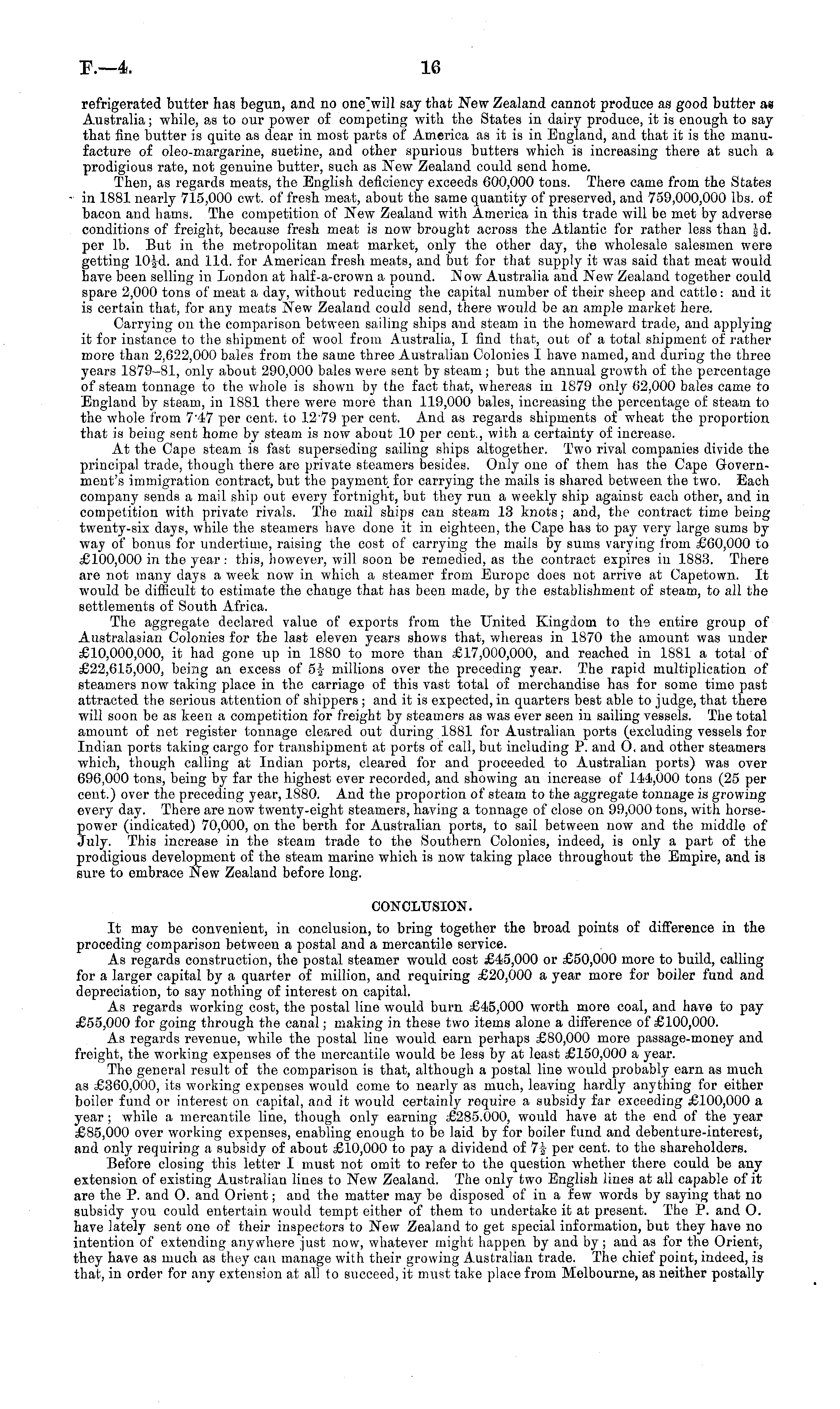 refrigerated butter has begun, and no one'will say that New Zealand cannot produce as good butter as Australia; while, as to our power of competing with the States in dairy produce, it is enough to say that fine butter is quite as dear in most parts of America as it is in England, and that it is the manufacture of oleo-margarine, suetine, and other spurious butters which is increasing there at such a prodigious rate, not genuine butter, such as New Zealand could send home. Then, as regards meats, the English deficiency exceeds 600,000 tons. There came from the States - in 1881 nearly 715,000 cwt. of fresh meat, about the same quantity of preserved, and 759,000,000 lbs. of bacon and hams. The competition of New Zealand with America in this trade will be met by adverse conditions of freight, because fresh meat is now brought across the Atlantic for rather less than |d. per lb. But in the metropolitan meat market, only the other day, the wholesale salesmen were getting 10-jd. and lid. for American fresh meats, and but for that supply it was said that meat would have been selling in London at half-a-crown a pound. Now Australia and New Zealand together could spare 2,000 tons of meat a day, without reducing the capital number of their sheep and cattle: and it is certain that, for any meats New Zealand could send, there would be an ample market here. Carrying on the comparison between sailing ships and steam in the homeward trade, and applying it for instance to the shipment of wool from Australia, I find that, out of a total shipment of rather more than 2,622,000 bales from the same three Australian Colonies I have named, and during the three years 1879-81, only about 290,000 bales were sent by steam ; but the annual growth of the percentage of steam tonnage to the whole is shown by the fact that, whereas in 1879 only 62,000 bales came to England by steam, in 1881 there were more than 119,000 bales, increasing the percentage of steam to the whole from 747 per cent, to 1279 per cent. And as regards shipments of wheat the proportion that is being sent home by steam is now about 10 per cent., with a certainty of increase. At the Cape steam is fast superseding sailing ships altogether. Two rival companies divide the principal trade, though there are private steamers besides. Only one of them has the Cape Government's immigration contract, but the payment for carrying the mails is shared between the two. Each company sends a mail ship out every fortnight, but they run a weekly ship against each other, and in competition with private rivals. The mail ships can steam 13 knots; and, the contract time being twenty-six days, while the steamers have done it in eighteen, the Cape has to pay very large sums by way of bonus for undertime, raising the cost of carrying the mails by sums varying from £60,000 to £100,000 in the year: this, however, will soon be remedied, as the contract expires in 1883. There are not many days a week now in which a steamer from Europe does not arrive at Capetown. It would be difficult to estimate the change that has been made, by the establishment of steam, to all the settlements of South Africa. The aggregate declared value of exports from the United Kingdom to the entire group of Australasian Colonies for the last eleven years shows that, whereas in 1870 the amount was under £10,000,000, it had gone up in 1880 to more than £17,000,000, and reached in 1881 a total of £22,615,000, being an excess of 5% millions over the preceding year. The rapid multiplication of steamers now taking place in the carriage of this vast total of merchandise has for some time past attracted the serious attention of shippers ; and it is expected, in quarters best able to judge, that there will soon be as keen a competition for freight by steamers as was ever seen in sailing vessels. The total amount of net register tonnage cleared out during 1881 for Australian ports (excluding vessels for Indian ports taking cargo for transhipment at ports of call, but including P. and O, and other steamers which, though calling at Indian ports, cleared for and proceeded to Australian ports) was over 696,000 tons, being by far the highest ever recorded, and showing an increase of 144,000 ton 3 (25 per cent.) over the preceding year, 1880. And the proportion of steam to the aggregate tonnage is growing every day. There are now twenty-eight steamers, having a tonnage of close on 99,000 tons, with horsepower (indicated) 70,000, on the berth for Australian ports, to sail between now and the middle of July. This increase in the steam trade to the Southern Colonies, indeed, is only a part of the prodigious development of the steam marine which is now taking place throughout the Empire, and is sure to embrace New Zealand before long. CONCLUSION. It may be convenient, in conclusion, to bring together the broad points of difference in the proceding comparison between a postal and a mercantile service. As regards construction, the postal steamer would cost £45,000 or £50,000 more to build, calling for a larger capital by a quarter of million, and requiring £20,000 a year more for boiler fund and depreciation, to say nothing of interest on capital. As regards working cost, the postal line would burn £45,000 worth more coal, and have to pay £55,000 for going through the canal; making in these two items alone a difference of £100,000. As regards revenue, while the postal line would earn perhaps £80,000 more passage-money and freight, the working expenses of the mercantile would be less by at least £150,000 a year. The general result of the comparison is that, although a postal line would probably earn as much as £360,000, its working expenses would come to nearly as much, leaving hardly anything for either boiler fund or interest on capital, and it would certainly require a subsidy far exceeding £100,000 a year; while a mercantile line, though only earning £285.000, would have at the end of the year £85,000 ov