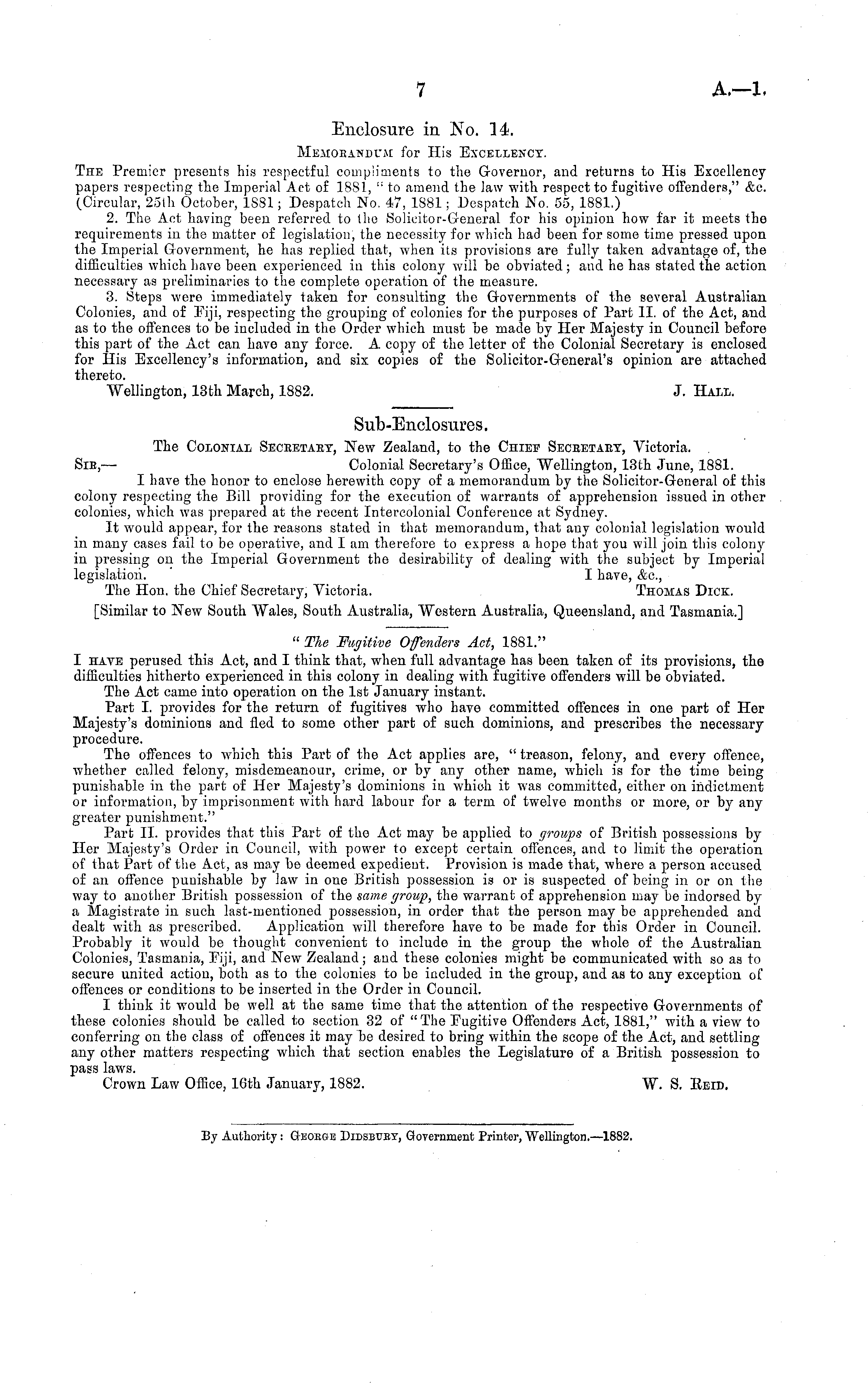 Enclosure in No. 14. Memorandum for His Excellency. The Premier presents his respectful compliments to the Governor, and returns to His Excellency papers respecting the Imperial Act of 1881, " to amend the law with respect to fugitive offenders," &c. (Circular, 25th October, 1881; Despatch No. 47, 1881; Despatch No. 55, 1881.) 2. The Act having been referred to tho Solicitor-General for his opinion how far it meets the requirements in the matter of legislation, the necessity for which had been for some time pressed upon the Imperial Government, he has replied that, when its provisions are fully taken advantage of, the difficulties which have been experienced in this colony will be obviated; and he has stated the action necessary as preliminaries to the complete operation of the measure. 3. Steps were immediately taken for consulting the Governments of the several Australian Colonies, and of Fiji, respecting the grouping of colonies for the purposes of Part 11. of tho Act, and as to the offences to be included in the Order which must be made by Her Majesty in Council before this part of the Act can have any force. A copy of the letter of the Colonial Secretary is enclosed for His Excellency's information, and six copies of the Solicitor-General's opinion are attached thereto. Wellington, 13th March, 1882. J. Hall.