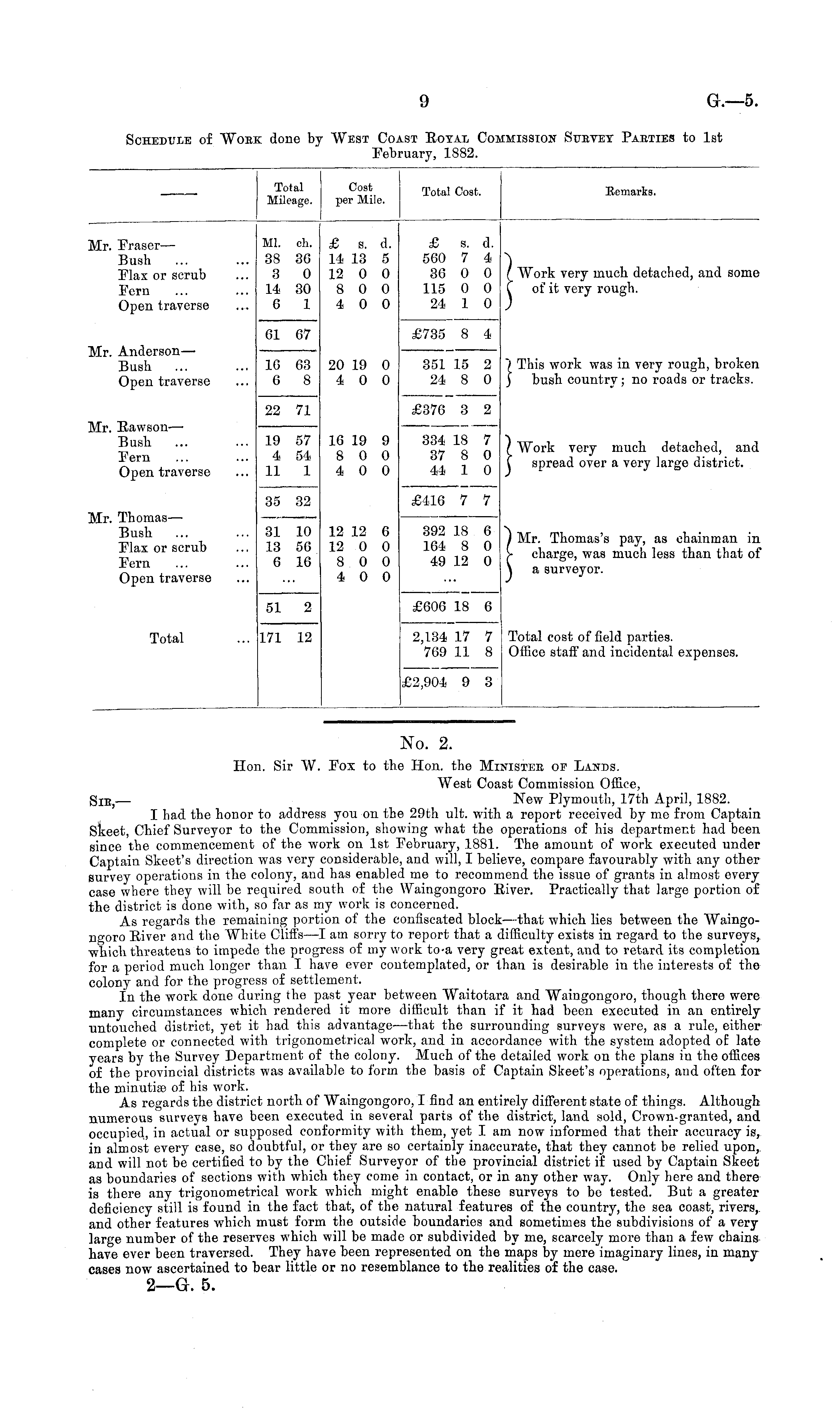 No. 2. Hon. Sir W. Pox to the Hon. the Ministee of Lands. West Coast Commission Office, Sie, — New Plymouth, 17th April, 1882. I had the honor to address you on the 29th ult. with a report received by me from Captain Skeet, Chief Surveyor to the Commission, showing what the operations of his department had been since the commencement of the work on Ist February, 1881. The amount of work executed under Captain Skeet's direction was very considerable, and will, I believe, compare favourably with any other survey operations in the colony, and has enabled me to recommend the issue of grants in almost every case where they will be required south of the Waingongoro River. Practically that large portion of the district is done with, so far as my work is concerned. As regards the remaining portion of the confiscated block—that which lies between the Waingongoro Eiver and the White Cliffs —I am sorry to report that a difficulty exists in regard to the surveys, which threatens to impede the progress of my work to-a very great extent, and to retard its completion for a period much longer than I have ever contemplated, or than is desirable in the interests of the colony and for the progress of settlement. In the work done during the past year between Waitotara and Waingongoro, though there were many circumstances which rendered it more difficult than if it had been executed in an entirely untouched district, yet it had this advantage —that the surrounding surveys were, as a rule, either complete or connected with trigonometrical work, and in accordance with the system adopted of late years by the Survey Department of the colony. Much of the detailed work on the plans in the offices of the provincial districts was available to form the basis of Captain Skeet's operations, and often for the ininutia; of his work. As regards the district north of Waingongoro, I find an entirely different state of things. Although numerous surveys have been executed in several parts of the district, land sold, Crown-granted, and occupied, in actual or supposed conformity with them, yet I am now informed that their accuracy is, in almost every ease, so doubtful, or they are so certainly inaccurate, that they cannot be relied upon,, and will not be certified to by the Chief Surveyor of the provincial district if used by Captain Skeet as boundaries of sections with which they come in contact, or in any other way. Only here and there is there any trigonometrical work which might enable these surveys to bo tested. But a greater deficiency still is found in the fact that, of the natural features of the country, the sea coast, rivers,, and other features which must form the outside boundaries and sometimes the subdivisions of a very large number of the reserves which will be made or subdivided by me, scarcely more than a few chains have ever been traversed. They have been represented on the maps by mere imaginary lines, in many cases now ascertained to bear little or no resemblance to the realities of the case. 2—G. 5.