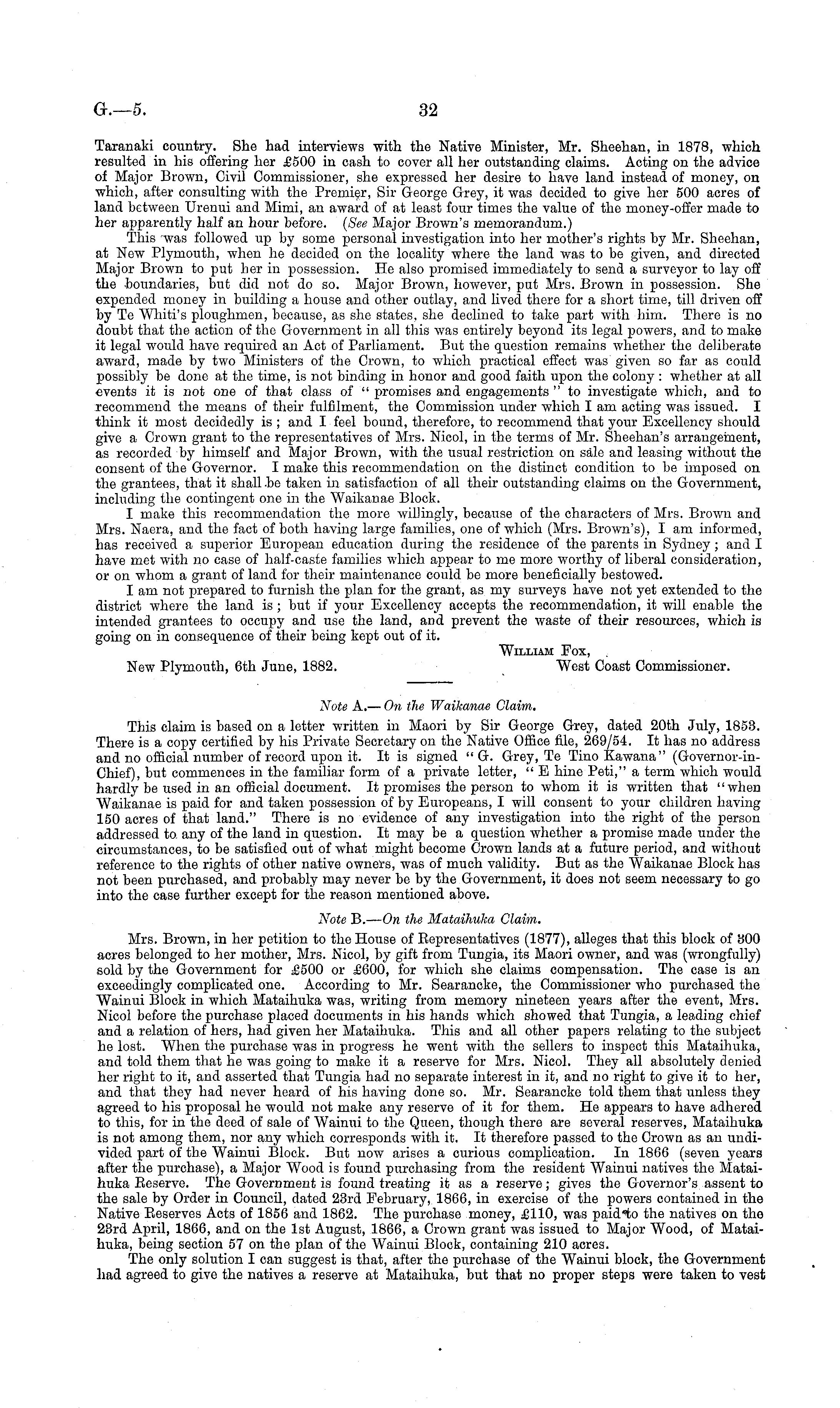 Taranaki country. She had interviews with the Native Minister, Mr. Sheehan, in 1878, which resulted in his offering her £500 in cash to cover all her outstanding claims. Acting on the advice of Major Brown, Civil Commissioner, she expressed her desire to have land instead of money, on which, after consulting with the Premier, Sir George Grey, it was decided to give her 500 acres of land between Urenui and Mimi, an award of at least four times the value of the money-offer made to her apparently half an hour before. (See Major Brown's memorandum.) This was followed up by some personal investigation into her mother's rights by Mr. Sheehan, at New Plymouth, when he decided on the locality where the land was to be given, and directed Major Brown to put her in possession. He also promised immediately to send a surveyor to lay off the .boundaries, but did not do so. Major Brown, however, put Mrs. Brown in possession. She expended money in building a house and other outlay, and lived there for a short time, till driven off by Te Whiti's ploughmen, because, as she states, she declined to take part with him. There is no doubt that the action of the Government in all this was entirely beyond its legal powers, and to make it legal would have required an Act of Parliament. But the question remains whether the deliberate award, made by two Ministers of the Crown, to which practical effect was given so far as could possibly be done at the time, is not binding in honor and good faith upon the colony : whether at all events it is not one of that class of " promises and engagements " to investigate which, and to recommend the means of their fulfilment, the Commission under which lam acting was issued. I think it most decidedly is ; and I feel bound, therefore, to recommend that your Excellency should give a Crown grant to the representatives of Mrs. Nicol, in the terms of Mr. Sheehan's arrangement, as recorded by himself and Major Brown, with the usual restriction on sale and leasing without the consent of the Governor. I make this recommendation on the distinct condition to be imposed on the grantees, that it shall-be taken in satisfaction of all their outstanding claims on the Government, including the contingent one in the Waikanae Block. I make this recommendation the more willingly, because of the characters of Mrs. Brown and Mrs. Naera, and the fact of both having large families, one of which (Mrs. Brown's), I am informed, has received a superior European education during the residence of the parents in Sydney ; and I have met with no case of half-caste families which appear to me more worthy of liberal consideration, or on whom a grant of land for their maintenance could be more beneficially bestowed. I am not prepared to furnish the plan for the grant, as my surveys have not yet extended to the district where the land is ; hut if your Excellency accepts the recommendation, it will enable the intended grantees to occupy and use the land, and prevent the waste of their resources, which is going on in consequence of their being kept out of it. William Fox, New Plymouth, 6th June, 1882. West Coast Commissioner.