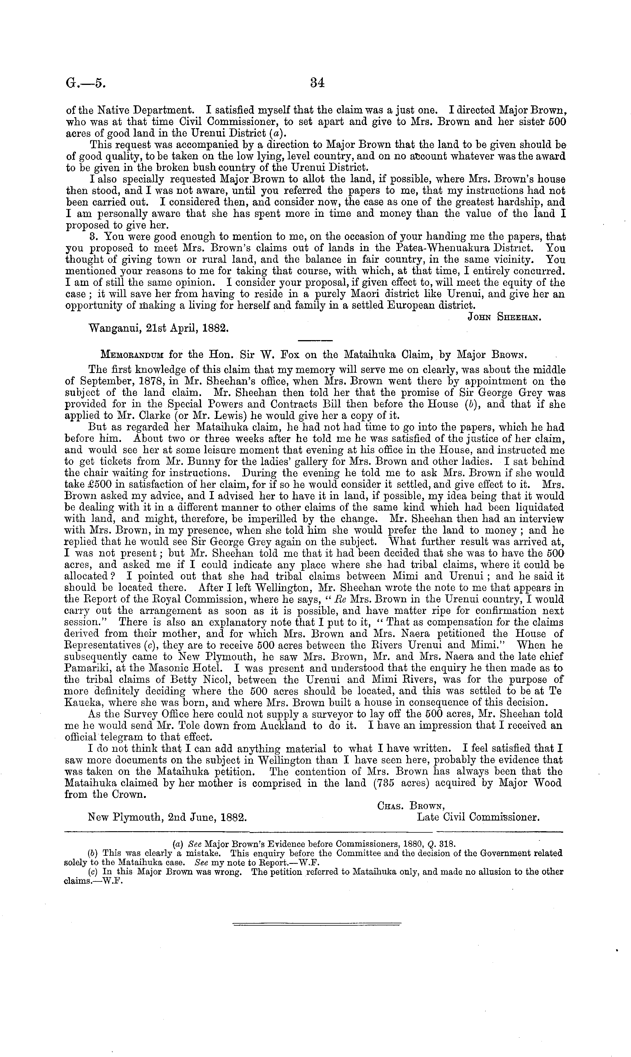 Memorandum for the Hon. Sir W. Pox on the Mataihuka Claim, by Major Brown. The first knowledge of this claim that my memory will serve me on clearly, was about the middle of September, 1878, in Mr. Sheehan's office, when Mrs. Brown went there by appointment on the subject of the land claim. Mr. Sheehan then told her that the promise of Sir George Grey was provided for in the Special Powers and Contracts Bill then before the House (b), and that if she applied to Mr. Clarke (or Mr. Lewis) he would give her a copy of it. But as regarded her Mataihuka claim, he had not had time to go into the papers, which he had before him. About two or three weeks after he told me he was satisfied of the justice of her claim, and would see her at some leisure moment that evening at his office in the House, and instructed me to get tickets from Mr. Bunny for the ladies' gallery for Mrs. Brown and other ladies. I sat behind the chair waiting for instructions. During the evening he told me to ask Mrs. Brown if she would take £500 in satisfaction of her claim, for if so he would consider it settled, and give effect to it. Mrs. Brown asked my advice, and I advised her to have it in land, if possible, my idea being that it would be dealing with it in a different manner to other claims of the same kind which had been liquidated with land, and might, therefore, be imperilled by the change. Mr. Sheehan then had an interview with Mrs. Brown, in my presence, when she told him she would prefer the land to money ; and he replied that he would see Sir George Grey again on the subject. What further result was arrived at, I was not present; but Mr. Sheehan told me that it had been decided that she was to have the 500 acres, and asked me if I could indicate any place where she had tribal claims, where it could be allocated ? I pointed out that she had tribal claims between Mimi and Urenui ; and he said it should be located there. After I left Wellington, Mr. Sheehan wrote the note to me that appears in the Eeport of the Eoyal Commission, where he says, " Re Mrs. Brown in the Urenui country, I would carry out the arrangement as soon as it is possible, and have matter ripe for confirmation next session." There is also an explanatory note that I put to it, " That as compensation for the claims derived from their mother, and for which Mrs. Brown and Mrs. Naera petitioned the House of Representatives (c), they are to receive 500 acres between the Rivers Urenui and Mimi." When he subsequently came to New Plymouth, he saw Mrs. Brown, Mr. and Mrs. Naera and the late chief Pamariki, at the Masonic Hotel. I was present and understood that the enquiry he then made as to the tribal claims of Betty Nicol, between the Urenui and Mimi Rivers, was for the purpose of more definitely deciding where the 500 acres should be located, and this was settled to be at Te Kaueka, where she was born, and where Mrs. Brown built a house in consequence of this decision. As the Survey Office here could not supply a surveyor to lay off the 500 acres, Mr. Sheehan told me he would send Mr. Tole down from Auckland to do it. I have an impression that I received an official telegram to that effect. Ido not think that I can add anything material to what I have written. I feel satisfied that I saw more documents on the subject in Wellington than I have seen here, probably the evidence that was taken on the Mataihuka petition. The contention of Mrs. Brown has always been that the Mataihuka claimed by her mother is comprised in the land (735 acres) acquired by Major Wood from the Crown. Chas. Brown, New Plymouth, 2nd June, 1882. Late Civil Commissioner.