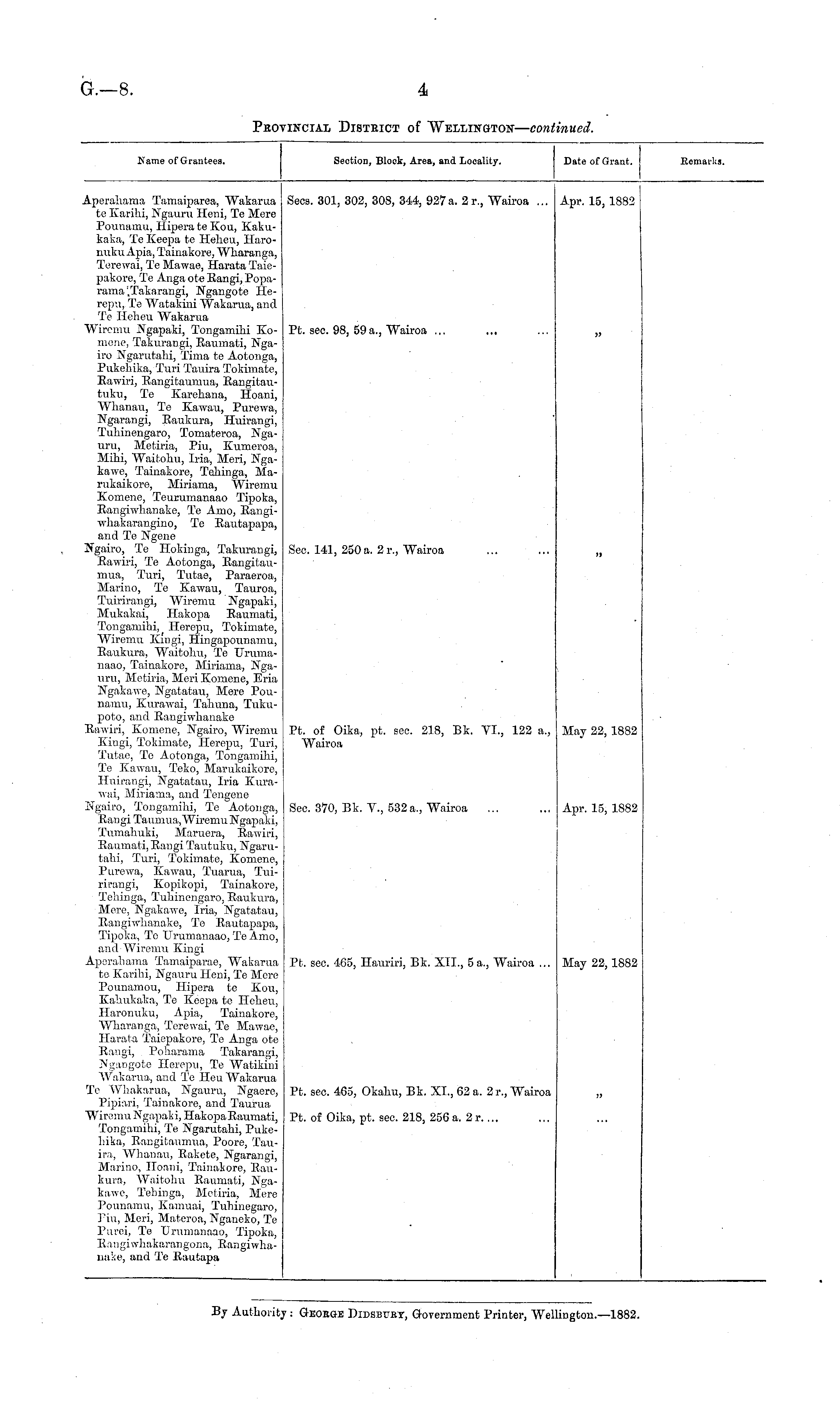 Name of Grantees. Section, Block, Area, and Locality. Date of Grant, Remarha. AperaUama Taraaiparea, Wakaraa te Karihi, Jfgauru Heni, Te Mere Pounamu, Hipera te Kou, Kakukaka, Te Keepa te Helieu, Haronuku Apia, Tainakore, AVharanga, Terewai, Te Mawae, Harata Taiepakore, Te Anga ote Kangi, Poparama'.Takarangi, Ugangoto Herepu, Te Watakini Wakarua, and Te Heheu Wakarua Wiremu Ngapaki, Tongamihi IComciic, Takurangi, Baumati, Ngairo Ngarutahi, Tima te Aotonga, Pukcliika, Turi Tauira Tokimate, Bawiri, Bangitaumua, Eangitautuku, Te Karehana, Hoani, Wlianau, Te Kawau, Purewa, lS Tgarangi, Eaukura, Huirangi, Tuhinengai'O, Tomateroa, Ngaiiru, Metiria, Piu, Kumeroa, Milii, Waitoliu, Iria, Meri, Ngakawe, Tainakore, Teliinga, Marukaikore, Miriama, Wircmu Komeno, Teurumanaao Tipoka, Kangiwhanalco, Te Amo, Bangiwliakarangino, To Eautapapa, and To Ngene Wgairo, Te Hokinga, Takurangi, Rawiri, Te Aotonga, Bangitavimua, Turi, Tutae, Paraeroa, Marino, Te Kawau, Tauroa, Tuirirangi, Wiremu Ngapaki, Mukakai, Hakopa Eaumati, Tongamilii^ ITerepu, Tokimate, Wircmu. Kmgi, Hingapounamu, Eaukura, Waitoliu, Te Urumanaao, Tainakore, Miriama, Ngauru, Metiria, Meri Komene, Eria Ngakawo, Ngatatau, Mere Pounamu, ICurawai, Taliuna, Tukupoto, and Eaugiwlianake Bawiri, Komcne, Ngairo, Wiremu Kingi, Tokimate, Herepu, Turi, Tutae, Te Aotonga, Tongamilii, Te Kawau, Toko, Marukaikore, Hnirangi, Ngatatau, Iria Kurawai, Miriama, and Tengene Ngairo, Tongamilii, Te Aotonga, Bangi Taumua, Wiremu Wgapaki, Tnmaliuki, Maruera, Eawiri, Eaumati, Eangi Tautuku, Ngarutalii, Turi, Tokimate, Komene, Purcwa, Kawau, Tuarua, Tuirirangi, Kopikopi, Tainakore, Teliinga, Tuhinengaro, Eaukura, Merc, Ngakawe, Iria, Ngatatau, Eangiwlianake, Te Bautapapa, Tipoka, Te Urumanaao, Te Amo, and Wiremu Kingi Aperaharna Tamaiparae, Wakarua te Karilii, Ngauru Heni, Te Mere Pounamou, Hipera te Kou, Kaliukaka, Te Keepa te Helieu, ITaronuku, Apia, Tainakore, Wharanga, Terewai, Te Mawae, Harata Taiepakore, To Anga otc Bangi, Poharama Takarangi, >'gaDgote Herepu, Te Watikini AVakarua, and To lieu Wakarua Te Whakarua, Ngauru, Ngaere, Pipiari, Tainakore, and Taurua AViremuNgapaki, llakopaBaumati, Tongamihi, Te Ngarutalii, Pukeliika, Eangitaumua, Poore, Tauira, Wlianau, Bakcte, Ngarangi, Marino, Hoani, Tainakore, Baukura, AVaitoliu Eaumati, Ngakawc, Teliinga, Metiria, Mere Pounamu, Kainuai, Tuliinegaro, Viu, Meri, Materoa, Nganeko, Te Purei, Te Urumanaao, Tipoka, Eangiwhakarangona, Bangiwhanake, and Te Bautapa Sees. 301, 302, 308, 344, 927a. 2r., Wairoa ... Apr. 15, 1882 Pt. sec. 98, 59 a., Wairoa ... 5; See. 141, 250 a. 2 1\, Wairoa }) Pt. of Oika, pt. sec. 218, Bk. VI., 122 a., Wairoa May 22, 18S2 Sec. 3fO, Bk. Ar., 532 a., Wairoa Apr. 15, 1882 Pt. sec. 465, Hauriri, Bk. XII., 5a., Wairoa ... May 22,1882 Pt. sec. 465, Okalm, Bk. XI., 62 a. 2r., Wairoa Pt. of Oika, pt, sec, 218, 256a. 2r. ...