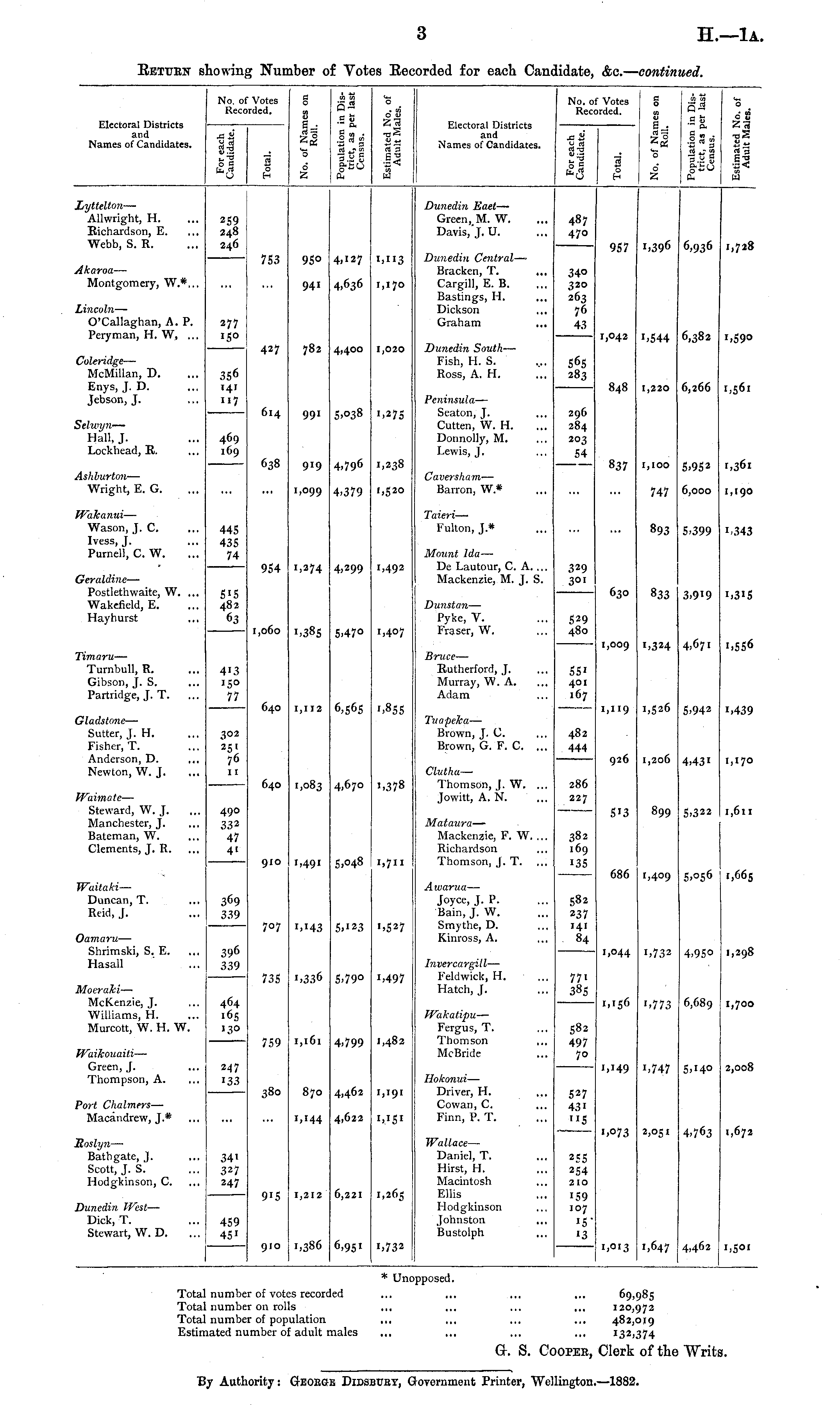 * Unopposed. Total number of votes recorded ... ... ... ... 69,985 Total number on rolls ... ... ... ... 120,972 Total number of population ... ... ... ... 482,019 Estimated number of adult males ... ~. ... ... 132)374 Q-. S. Cooper, Clerk of the Writs.