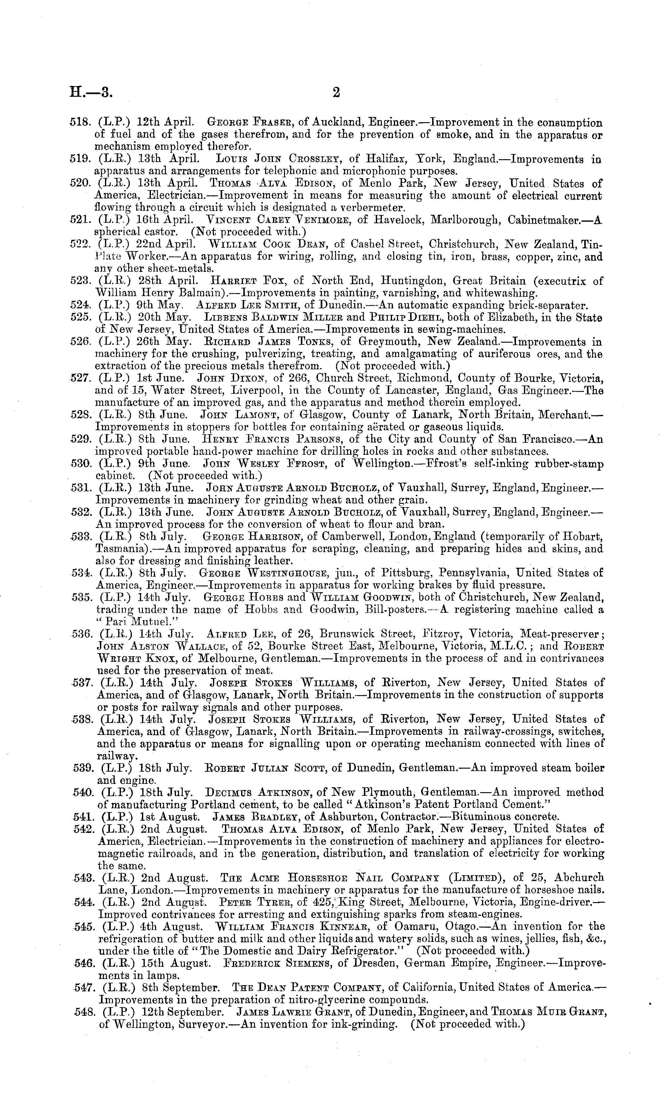 518. (L.P.) 12th April. Geoege Feaseb, of Auckland, Engineer.—lmprovement in the consumption of fuel and of the gases therefrom, and for the prevention of smoke, and in the apparatus or mechanism employed therefor. 519. (L.R.) 13th April. Louis John Ceossley, of Halifax, York, England. —Improvements in apparatus and arrangements for telephonic and microphonic purposes. 520. (L.R.) 13th April. Thomas Alya Edison, of Menlo Park, New Jersey, United States of America, Electrician. —Improvement in means for measuring the amount of electrical current flowing through a circuit which is designated a verbermeter. 521. (L.P.) 16th April. Vincent Caeet Venimoee, of Havelock, Marlborough, Cabinetmaker.—A spherical castor. (Not proceeded with.) 522. (L.P.) 22nd April. William Cook Dean, of Cashel Street, Christchurch, New Zealand, TinPlate "Worker.—An apparatus for wiring, rolling, and closing tin, iron, brass, copper, zinc, and any other sheet-metals. 523. (L.E.) 28th April. Haeeiet Fox, of North End, Huntingdon, Great Britain (executrix of William Henry Balmain). —Improvements in painting, varnishing, and whitewashing. 524. (L.P.) 9th M.ay. Alered Lee Smitii, of Dunedin. —An automatic expanding briek-separater. 525. (L.R.) 20th May. Liebens Baldwin Millee and Philip Djehl, both of Elizabeth, in the State of New Jersey, "United States of America. —Improvements in sewing-machines. 526. (L.P.) 26th May. Eichaed James Tonks, of Greymouth, New Zealand.—lmprovements in machinery for the crushing, pulverizing, treating, and amalgamating of auriferous ores, and the extraction of the precious metals therefrom. (Not proceeded with.) 527. (L.P.) Ist June. John Dixon, of 266, Church Street, Eichmond, County of Bourke, "Victoria, and of 15, Water Street, Liverpool, in the County of Lancaster, England, Gas Engineer. —The manufacture of an improved gas, and the apparatus and method therein employed. 528. (L.E.) Bth June. John Lamont, of Glasgow, County of Lanark, North Britain, Merchant.— Improvements in stoppers for bottles for containing aerated or gaseous liquids. 529. (L.E.) Bth June. Henet Feancis Paesons, of the City and County of San Erancisco.—An improved portable hand-power machine for drilling holes in rocks and other substances. 530. (L.P.) 9th June. John Wesley Ferost, of Wellington.—Ffrost's self-inking rubber-stamp cabinet. (Not proceeded with.) 531. (L.E.) 13th June. John Atjgtjste Arnold Bucholz, of Vauxhall, Surrey, England, Engineer.— Improvements in machinery for grinding wheat and other grain. 532. (L.E.) 13th June. John Augiiste Aenold Btjcholz, of Vauxhall, Surrey, England, Engineer.— An improved process for the conversion of wheat to flour and bran. 533. (L.E.) Bth July. Geobge Haeeison, of Camberwell, London, England (temporarily of Hobart, Tasmania). —An improved apparatus for scraping, cleaning, and preparing hides and skins, and also for dressing and finishing leather. 534. (L.R.) Bth July. George Westinghouse, Jan., of Pittsburg, Pennsylvania, United States of America, Engineer.—lmprovements in apparatus for working brakes by fluid pressure. 535. (L.P.) 14th July. Geoege Hobbs and William Goodwin, both of Christchurch, New Zealand, trading under the name of Hobbs and Goodwin, Bill-posters.—-A registering machine called a " Pari Mutuel." 536. (L.E.) 14th July. A.lfeed Lee, of 26, Brunswick Street, Fitzroy, Victoria, Meat-preserver; John Alston Wallace, of 52, Bourke Street East, Melbourne, Victoria, M.L.C.; and Eobeet Weight Knox, of Melbourne, Gentleman. —Improvements in the process of and in contrivances used for the preservation of meat. 537. (L.E.) 14th July. Joseph Stokes Williams, of Riverton, New Jersey, United States of America, and of Glasgow, Lanark, North Britain.—lmprovements in the construction of supports or posts for railway signals and other purposes. 538. (L.E.) 14th July. Joseph Stokes Williams, of Riverton, New Jersey, United States of America, and of Glasgow, Lanark, North Britain. —Improvements in railway-crossings, switches, and the apparatus or means for signalling upon or operating mechanism connected with lines of railway. 539. (L.P.) 18th July. Eobeet Julian Scott, of Dunedin, Gentleman. —An improved steam boiler and engine. 540. (L.P.) 18th July. Decimtts Atkinson, of New Plymouth, Gentleman. —An improved method of manufacturing Portland cement, to be called "Atkinson's Patent Portland Cement." 541. (L.P.) Ist August. James Beadlet, of Ashburton, Contractor. —Bituminous concrete. 542. (L.R.) 2nd August. Thomas Alva Edison, of Menlo Park, New Jersey, United States of America, Electrician. —Improvements in the construction of machinery and appliances for electromagnetic railroads, and in the generation, distribution, and translation of electricity for working the same. 543. (L.E.) 2nd August. The Acme Hoeseshoe Nail Company (Limited), of 25, Abchurch Lane, London. —improvements in machinery or apparatus for the manufacture of horseshoe nails. 544. (L.E.) 2nd August. Petee Tyeeb, of 425,1 King Street, Melbourne, Victoria, Engine-driver. — Improved contrivances for arresting and extinguishing sparks from steam-engines. 545. (L.P.) 4th August. William Feancis Kinneae, of Oamaru, Otago.—-An invention for the refrigeration of butter and milk and other liquids and watery solids, such as wines, jellies, fish, <fee, under the title of "The Domestic and Dairy Refrigerator." (Not proceeded with.) 546. (L.R.) 15th August. Feedeeick Siemens, of Dresden, German Empire, Engineer. —Improvements in lamps. 547. (L.R.) Bth September. The Dean Patent Company, of California, United States of America.— Improvements in the preparation of nitro-glycerine compounds. 548. (L.P.) 12th September. James Laweie Geant, of Dunedin, Engineer, and Thomas Mtjie Q-eant, of Wellington, Surveyor.—An invention for ink-grinding. (Not proceeded with.)