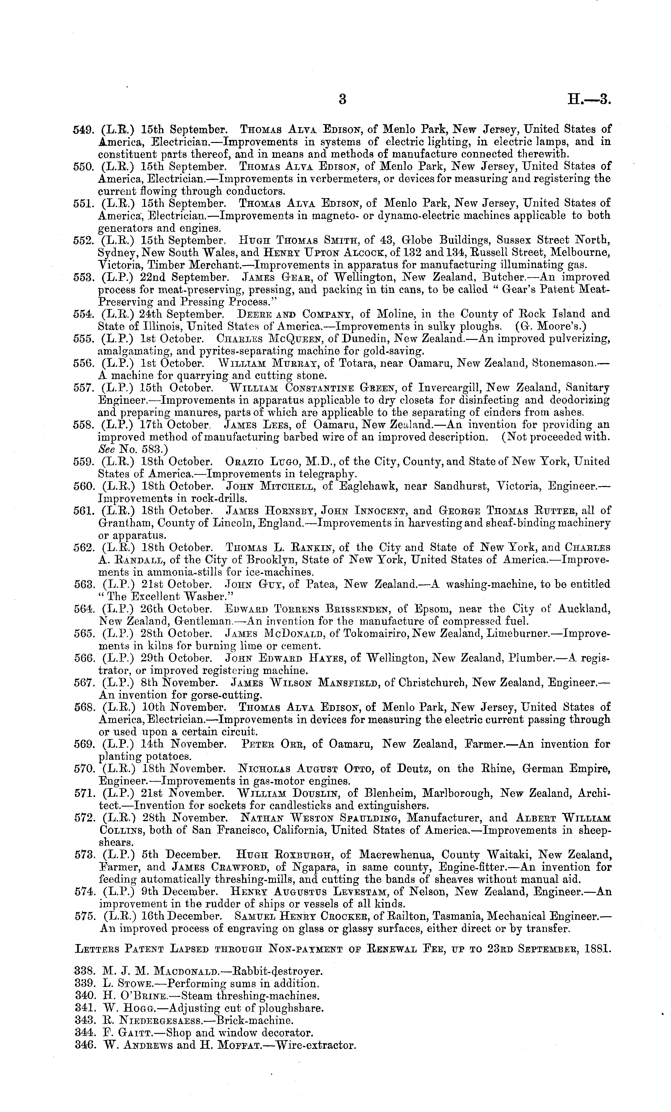 549. (L.8.) 15th September. Thomas Alva Edison, of Menlo Park, New Jersey, United States of America, Electrician. —Improvements in systems of electric lighting, in electric lamps, and in constituent parts thereof, and in means and methods of manufacture connected therewith. 550. (L.E.) 15th September. Thomas Alva Edison, of Menlo Park, New Jersey, United States of America, Electrician.—lmprovements in verbermeters, or devices for measuring and registering the current flowing through conductors. 551. (L.E,.) 15th September. Thomas Alta Edison, of Menlo Park, New Jersey, United States of America', Electrician.—lmprovements in magneto- or dynamo-electric machines applicable to both generators and engines. 552. (L.E.) 15th September, Hugh Thomas Smith, of 43, G-lobe Buildings, Sussex Street North, Sydney, New South Wales, and Heney Upton Alcock, of 132 and 134, Eussoll Street, Melbourne, Victoria, Timber Merchant. —Improvements in apparatus for manufacturing illuminating gas. 553. (L.P.) 22nd September. James Gear, of "Wellington, New Zealand, Butcher. —An improved process for meat-preserving, pressing, and packing in tin cans, to be called " Gear's Patent MeatPreserving and Pressing Process." 554. (L.E.) 24th September. Deese and Company, of Moline, in the County of Eock Island and State of Illinois, United States of America. —Improvements in sulky ploughs. (G. Moore's.) 555. (L.P.) Ist October. Chaelks McQueen, of Dunedin, New Zealand. —An improved pulverizing, amalgamating, and pyrites-separating machine for gold-saving. 556. (L.P.) Ist October. William Murray, of Totara, near Oamaru, New Zealand, Stonemason.— A machine for quarrying and cutting stone. 557. (L.P.) 15th October. William Constantine G-been, of Invercargill, New Zealand, Sanitary Engineer.—lmprovements in apparatus applicable to dry closets for disinfecting and deodorizing and preparing manures, parts of which are applicable to the separating of cinders from ashes. 558. (L.P.) 17th October. James Lees, of Oamaru, New Zealand. —An invention for providing an improved method of manufacturing barbed wire of an improved description. (Not proceeded with. See No. 583.) 559. (L.E.) 18th October. Oeazio Lugo, M.D., of the City, County, and State of New York, United States of America. —Improvements in telegraphy. 560. (L.E.) 18th October. John Mitchell, of Eaglehawk, near Sandhurst, Victoria, Engineer.— Improvements in rock-drills. 561. (L.E.) 18th October. James Hoensby, John Innocent, and George Thomas Euttbr, all of Grrantham, County of Lincoln, England. —Improvements in harvesting and sheaf-binding machinery or apparatus. 562. (L.E.) 18th October. Thomas L. Eankin, of the City and State of New York, and Chaeles A. Eandall, of the City of Brooklyn, State of New York, United States of America. —Improvements in ammonia-stills for ice-machines. 563. (L-P.) 21st October. John Guy, of Patea, New Zealand. —A washing-machine, to be entitled " The Excellent Washer." 564. (L.P.) 26th October. Edward Toreens Beissenden, of Epsom, near the City of Auckland, New Zealand, Gentleman.' —An invention for the manufacture of compressed fuel. 565. (L.P.) 28th October. James McDonald, of Tokomairiro, New Zealand, Limeburner. —Improvements in kilns for burning lime or cement. 566. (L.P.) 29th October. John Edwaed Hayes, of Wellington, New Zealand, Plumber. —A registrator, or improved registering machine. 567. (L.P.) Bth November. James Wilson Mansfield, of Christchurch, New Zealand, Engineer.— An invention for gorse-cutting. 568. (L.E.) 10th November. Thomas Alta Edison, of Menlo Park, New Jersey, United States of America, Electrician.—lmprovements in devices for measuring the electric current passing through or used upon a certain circuit. 569. (L.P.) 14th November. Peter Ocr, of Oamaru, New Zealand, Farmer. —An invention for planting potatoes. 570. (L.E.) 18th November. Nicholas August Otto, of Deutz, on the Ehine, German Empire, Engineer.- —Improvements in gas-motor engines. 571. (L.P.) 21st November. William Douslin, of Blenheim, Marlborough, New Zealand, Architect.' —Invention for sockets for candlesticks and extinguishers. 572. (L.E.) 28th November. Nathan Weston Spaulding, Manufacturer, and Albert William Collins, both of San Francisco, California, United States of America. —Improvements in sheepshears. 573. (L.P.) sth December. Hugh Eoxbuegh, of Maerewhenua, County Waitaki, New Zealand, Farmer, and James Ceawfoed, of Ngapara, in same county, Engine-fitter. —An invention for feeding automatically threshing-mills, and cutting the bands of sheaves without manual aid. 574. (L.P.) 9th December. Henry Augustus Levestam, of Nelson, New Zealand, Engineer. —An improvement in the rudder of ships or vessels of all kinds. 575. (L.E.) 16th December. Samuel Henby Ceockeh, of Eailton, Tasmania, Mechanical Engineer.— An improved process of engraving on glass or glassy surfaces, either direct or by transfer. Letters Patent Lapsed theough Non-payment of Eenjewal Fee, up to 23ed Septembee, 1881. 338. M. J. M. Macdonald. —Eabbit-destroyer. 339. L. Stowe. —Performing sums in addition. 340. H. O'Beine. —Steam threshing-machines. 341. W. Hogg.—Adjusting cut of ploughshare. 343. E. Niedeegesaess.-—Brick-machine. 344. F. Gaitt. —Shop and window decorator. 346. W. Andrews and H. Moffat.—Wire-extractor.