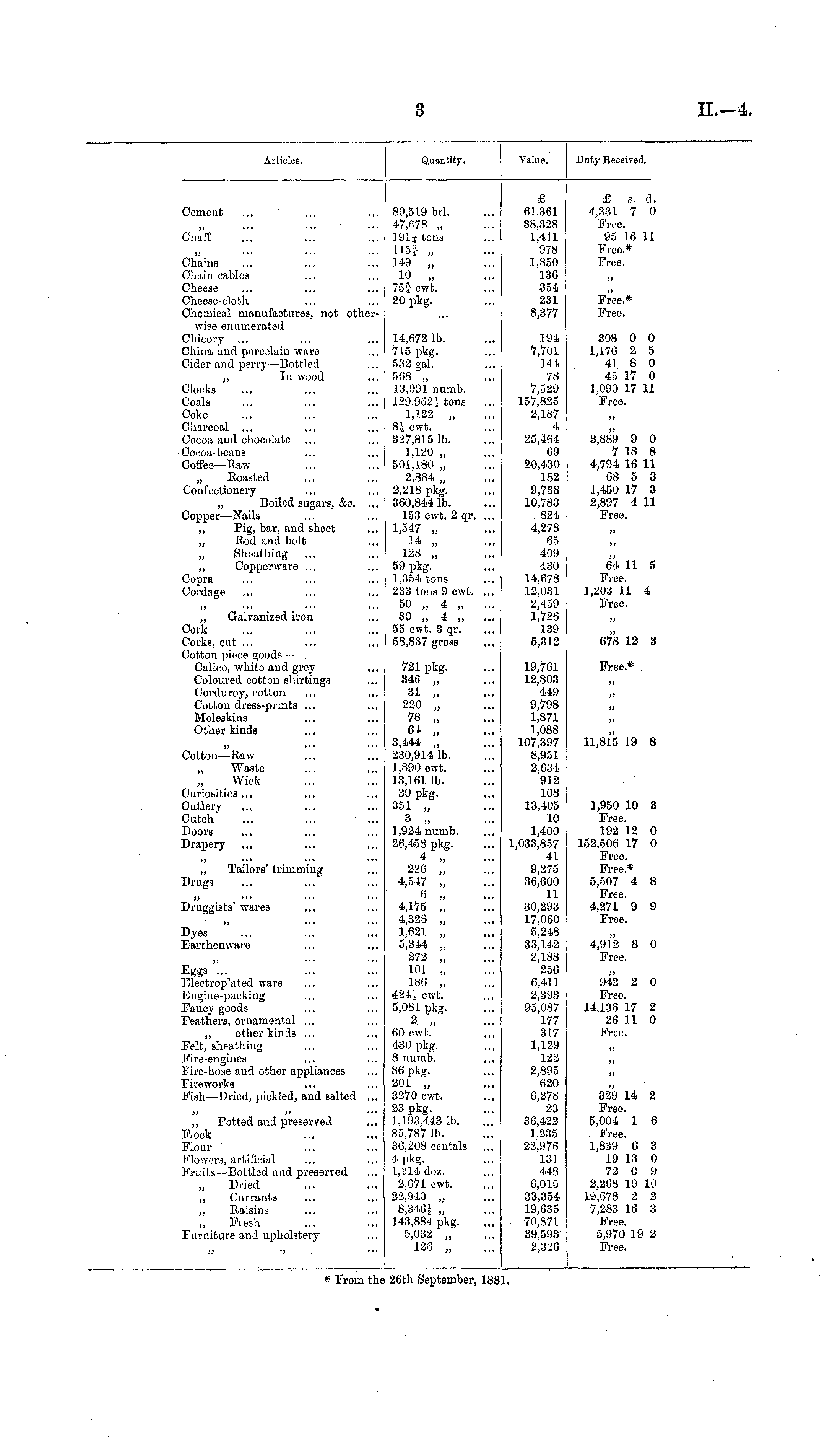 lid les. luanl tyluc. 'eceivet Cement Chaff 80,519 brl. 47/>78 „ 191| tons iib| „ 149 „ 10 „ 75} owt. 20 pkg. £ 61,361 38,328 1,441 978 1,850 136 354 231 8,377 £ s. d. 4,331 7 0 Free. 95 16 11 Free.* Free. Chains Chain cables Cheese Cheese-cloth Chemical manufactures, not otherwise enumerated Chicory ... China and porcelain ware Cider and perry—Bottled „ In wood 3) J) Free.* Free. 14,672 lb. 715 pkg. 532 gal. 568 „ 13,991 numb. 129,962J tons 1,122 8£ owt. 327,815 lb. 1,120 „ 501,180 „ 2,884 „ 2,218 pkg. 360,8441b. 153 owt. 2 qr. ... 1,547 „ 14 „ 128 „ 59 pkg. 1,354 tons 233 tons 9 owt. ... 50 „ 4 „ 39 „ 4 „ ... 55 cwt. 3 qr. 58,837 gross 191 7,701 141 78 7,529 157,825 2,187 4 25,461 69 20,430 182 9,738 10,783 824 4,278 65 409 430 14,678 12,031 2,459 1,726 139 5,312 308 0 0 1,176 2 5 41 8 0 45 17 0 1,090 17 11 Free. Clocks Coals Coke Charcoal ... Cocoa and chocolate Cocoa-beans Coffee —Raw „ Roasted Confectionery „ Boiled sugars, &o. ... Copper—Nails ,, Pig, bar, and sheet ,, Rod and bolt ,, Sheathing „ Copperware ... Copra Cordage 3,889 9 0 7 18 8 4,791 16 11 68 5 3 1,450 17 3 2,897 4 11 Free. >> >> 64 11 5 Free. 1,203 11 4 Free. ,, ... ... ... „ Gralvanizod iron Cork Corka, out ... Cotton piece goods— . Calico, white and grey Coloured cotton shirtings Corduroy, cotton Cotton dress-prints ... Moleskins Other kinds 721 pkg. 346 „ 31 „ 220 „ 78 61 „ 3,414 „ 230,914 1b. 1,890 owt. 13,161 lb. 30 pkg. 351 „ 3 „ 1,924 numb. 26,458 pkg. 4 „ 226 „ 4,547 „ 6 „ 4,175 „ 4,326 „ 1,621 „ 5,344 „ 272 „ 101 „ 186 „ 421J-owt. 5,081 pkg. 2 „ 60 owt. 430 pkg. 8 numb. ... 86 pkg. 201 „ 3270 cwt. 23 pkg. 1,193,443 lb. 85,787 lb. 36,208 centals ... 4 pkg. 1,814 doz. 2,671 owt. 22,940 „ 8,346|- „ 143,881 pkg. 5,032 „ 128 „ 19,761 12,803 419 9,798 1,871 1,088 107,397 8,951 2,634 912 108 13,405 10 1,400 1,033,857 41 9,275 36,600 11 30,293 17,060 5,218 33,142 2,188 256 6,411 2,393 95,087 177 317 1,129 122 2,895 620 6,278 23 36,422 1,235 22,976 131 448 6,015 33,354 19,635 70,871 39,593 2,326 t> 678 12 3 Free.* i) I? j) a Cotton —Raw ,, Waste Wick Curiosities ... Cutlery Cutch Doors Drapery 11,815 19 8 1,950 10 3 Free. 192 12 0 152,506 17 0 Free. Free.* 5,507 4 8 Free. 4,271 9 9 Free. ,, Tailors' trimming Drugs Druggists' wares Dyes Earthenware 4,912 8 0 Free. Eggs ... Electroplated ware Engine-packing Fancy goods Feathers, ornamental ... ,, other kinds ... Felt, sheathing Fire-engines Fire-hose and other appliances Fireworks Fish—Dried, pickled, and salted ... 942 2 0 Free. 14,136 17 2 26 11 0 Free. jj j) ,, Potted and preserved Flock Flour Flowers, artificial ... Fruits—Bottled and preserved „ D.ied „ Currants ,, Raisins „ Fresh Furniture and upholstery 329 14 2 Free. 5,001 1 6 Free. 1,839 6 3 19 13 0 72 0 9 2,268 19 10 19,678 2 2 7,283 16 3 Free. 5,970 19 2 Free. j) >> ••.