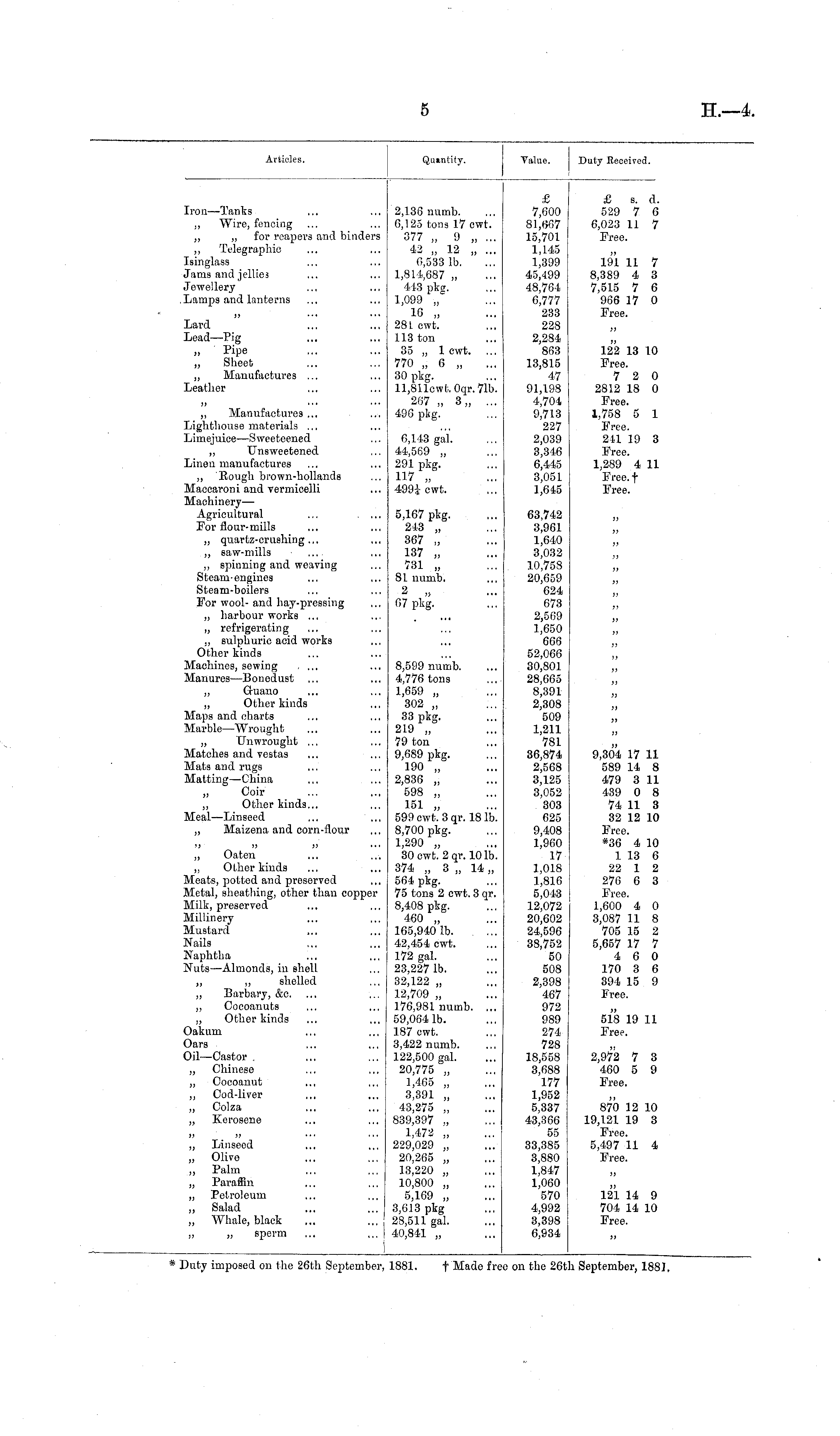 * Duty imposed on the 26th September, 1881. f Made free on the 26th September, 188],