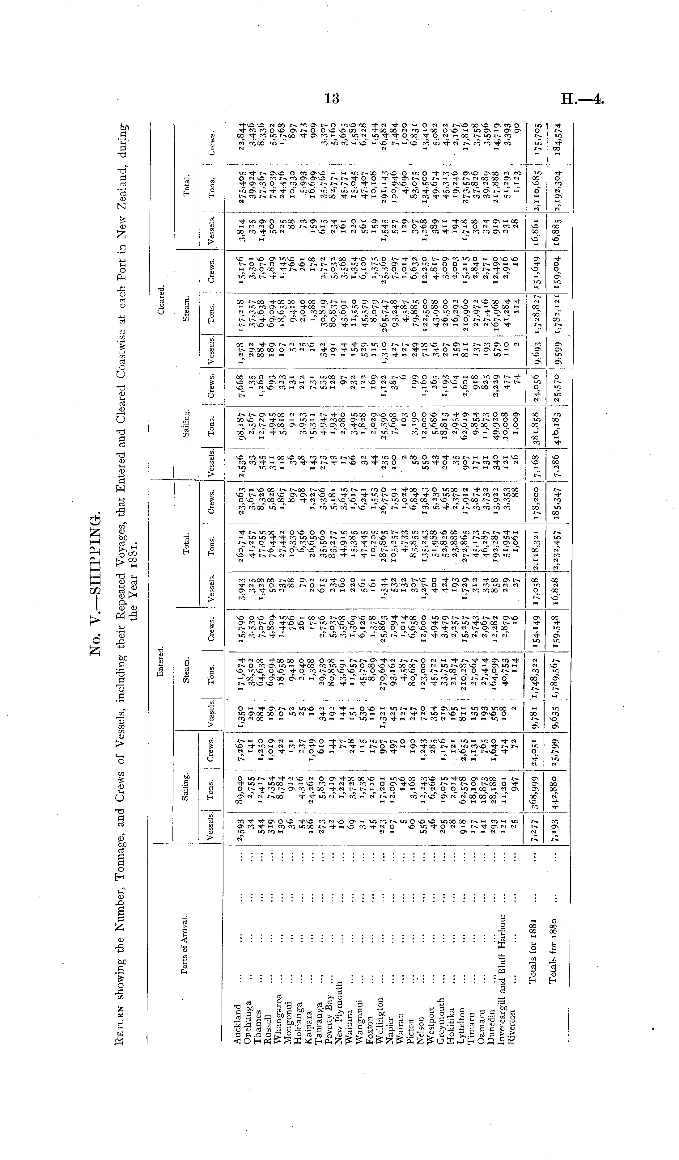 No. V.—SHIPPING. Return showing the Number, Tonnage, and Crews of Vessels, including their Repeated Voyages, that Entered and Cleared Coastwise at each Port in New Zealand, during the Year 1881.