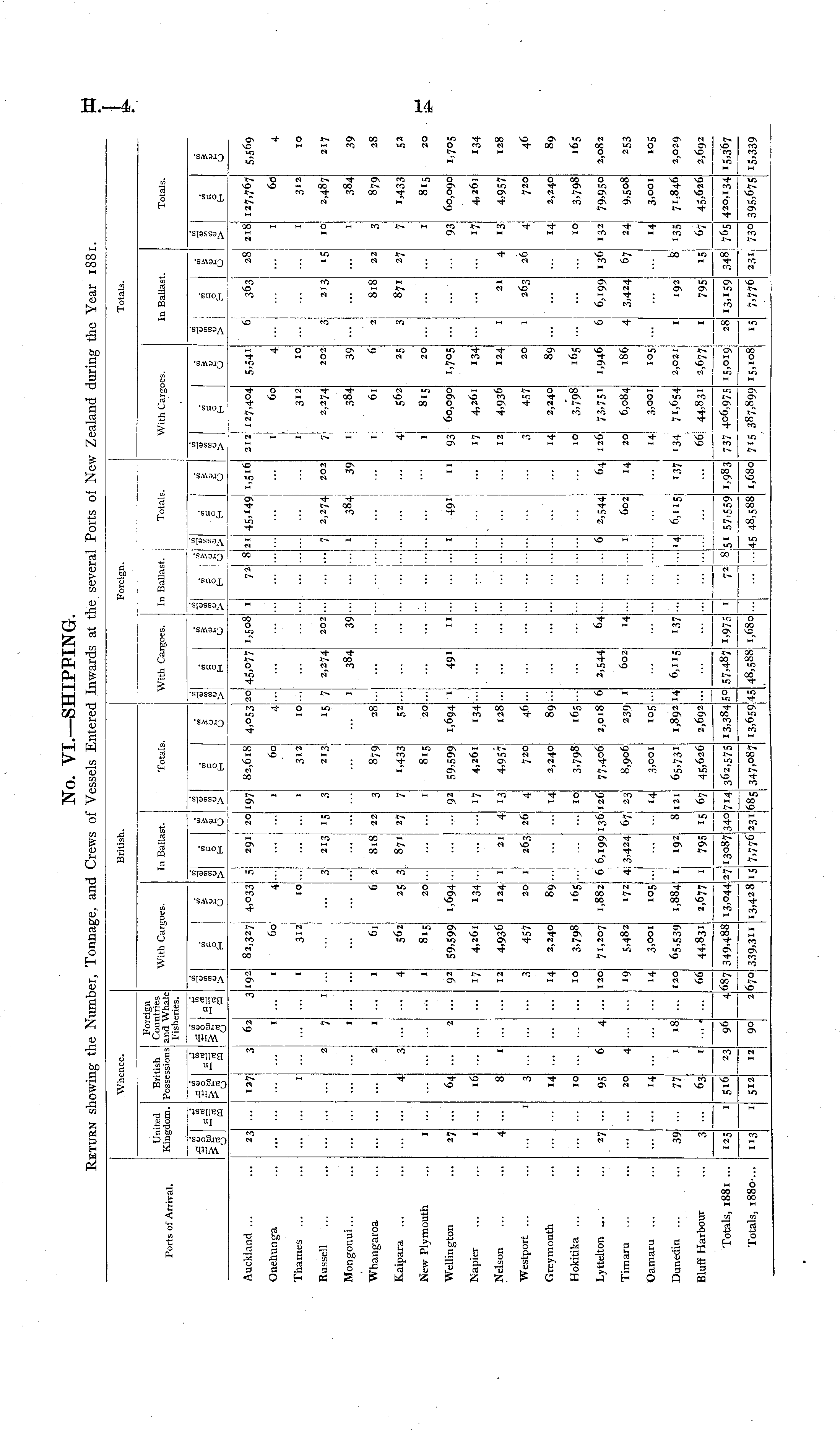 Whence. British. Foreign. Totals. United Kingdom. British Possessions Foreign Countries ana Whale Fisheries. With Cargoes. In Ballast. Totals. With Cargoes. In Ballast. Totals. With Cargoes. In Ballast. Totals. Ports of Arrival. ijhi 4J O U "I u J m > I i u ! u > o H u I S 6 I I 'I 1 C I o o > o H & Auckland ... 23 127 3 62 192 82,327 4,033 5 291 20 '97 82,6!8; 4,053 20 4S,°77 1,508 72 21 45>'49 i,5 l6 212 127,404 5,54i 363! 28 2.8 127,767 5,569 Onehunga I 60 4 60 4! ... ... 1 60 4 6d 4 Thames ... 1 312 10 ».. 10 1 312 10 1 I I 312 10 -• Russell . 7 1 213 »s 213 '5 2,274 202 2,274 202 2,274 202 3 213 '5 IO: 2,487 217 Mongonui... ... [ 384 39 384 39 384 39 ... j 384 39 Whangaroa 2 61 6 818 2 2 879! 28 61 6 2 818 22 879 28 Kaipara 4 56, 25 sn\ 27 ',433 52 ... 562 25 3 871 27 i,433 52 New Plymouth I 8'S 20 8'5 20 ... 815 20 ... I 815 20 ... I 1 Wellington 27 64 92 59,599 1,694 92 59,599 1,694 491 11 491 11 93 60,090 >,7°5 93 60,090 i»7°S Napier I 16 i? 4,261 '34 17 4,261! '34 17 4,261 134 J7 4,261 134 Nelson 4 8 ,J 4,936 124 21 4 •3| 4,957 128 12 4,936 124 1 21 4 13 4,957 128 Westport ... I 3 3 457 20 263 26 4 720 46 457 20 263 26 4 720 46 Greymouth H '4 2,240 89 H 2,240 89 14 2,240 89 ... ... 14 2,240 89 ... Hokitika ... 10 I Io 3,798 165 10 3,798 >65 10 3,798 165 ... 10 3,798 165 Lyttelton ... 27 95 6 4 120 j 71,207 1,882 6,199 136 126 77,4o6 2,018 2,544 64 ... , 2,544 64 126 73,75' 1,946 6 6,199 136 132 79,95° 2,082 Timaru 20 1 I9 5,482 172 3,424 4 23 8,906 2391 602 14 602 14 20 6,084 186 4 3,424 « M 9,5o8 253 Oamaru ... 14 ■4 3,001 IO 5 H 3,001 105 1 14 3,001 IO 5 1 14 3,001 105 ... ... Dunedin ... 39 77 1 18 120 65,539 1,884 192 8 121 65,73i 1,892 14 6,115 •37 14 6,ns ,37 '34 7i,654 2,021 1 192 8 •35 71,846 2,029 Bluff Harbour 3 63 516 66 44,831 2,677 795 J 45,626 2,692 13,384 66 44,831 406,975 2,677 795 '5 67 765 45,626 2,692 '5,367 1 ... 1 1 15 ... I Totals, 1 88 1 ... I '25 1 23 96 4 687 670 349,488 13,044 h 2 7 13087 7.77 6 34° 7'4 685 362,575 347, O87 H ? 57,487 48,588 ',975 1,680 3 1 72 - 4 - S' 1 57,559 48,588 1,680 737 15,108 28 I3,i59 420,134 — i 395,675 Totals, 1880... "3 I 512 12 90 2 339,3" 13,428 ■5! 231 13,659 45 ... |45 7'5! 387,899 15 7>77 6 231 73° !S>339 I.