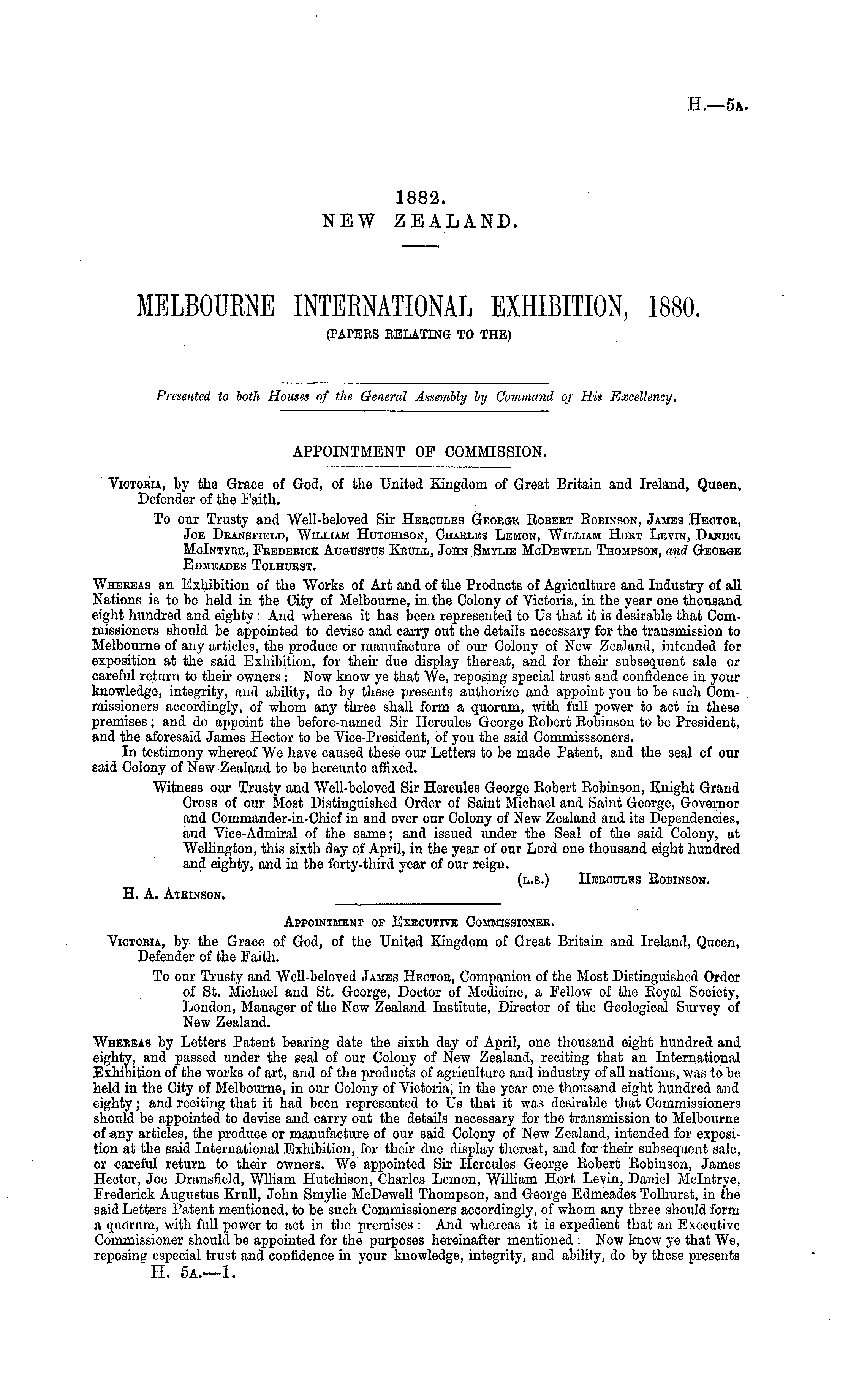 APPOINTMENT OF COMMISSION. Victobia, by the Grace of God, of the United Kingdom of Great Britain and Ireland, Queen, Defender of the Faith. To our Trusty and Well-beloved Sir Hercules George Eobeet Eobinson, James Hectob, Joe Dransfield, William Hutchison, Charles Lemon, William Hort Levin, Daniel Mclntyee, Feedebick Augustus Keull, John Smylie McDewell Thompson, and George Edmeades Tolhuest. Whebeas an Exhibition of the Works of Art and of the Products of Agriculture and Industry of all Nations is to be held in the City of Melbourne, in the Colony of Victoria, in the year one thousand eight hundred and eighty: And whereas it has been represented to Us that it is desirable that Commissioners should be appointed to devise and carry out the details necessary for the transmission to Melbourne of any articles, the produce or manufacture of our Colony of New Zealand, intended for exposition at the said Exhibition, for their due display thereat, and for their subsequent sale or careful return to their owners: Now know ye that We, reposing special trust and confidence in your knowledge, integrity, and ability, do by these presents authorize and appoint you to be such Commissioners accordingly, of whom any three shall form a quorum, with full power to act in these premises; and do appoint the before-named Sir Hercules George Eobert Eobinson to be President, and the aforesaid James Hector to be Vice-President, of you the said Commisssoners. In testimony whereof We have caused these our Letters to be made Patent, and the seal of our said Colony of New Zealand to be hereunto affixed. Witness our Trusty and Well-beloved Sir Hercules George Eobert Eobinson, Knight Grand Cross of our Most Distinguished Order of Saint Michael and Saint George, Governor and Commander-in-Chief in and over our Colony of New Zealand and its Dependencies, and Vice-Admiral of the same; and issued under the Seal of the said Colony, at Wellington, this sixth day of April, in the year of our Lord one thousand eight hundred and eighty, and in the forty-third year of our reign. (1.5.) Hercules Eobinson. H. A. Atkinson.