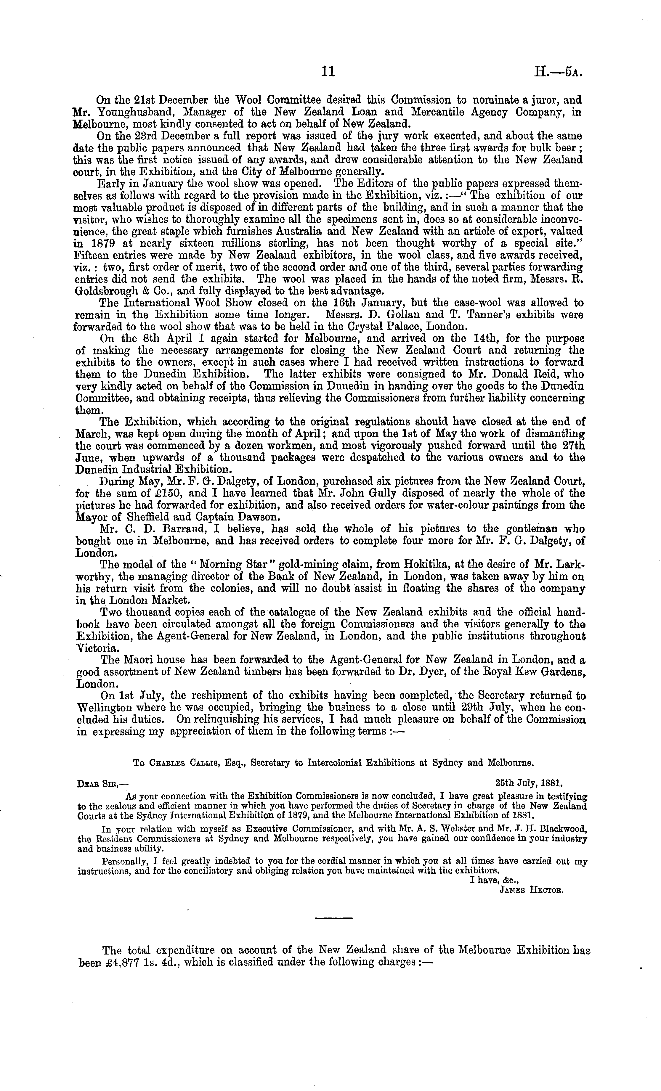 To Charles Callis, Esq., Secretary to Intercolonial Exhibitions at Sydney and Melbourne. Dear Sib,— 25th July, 1881. As your connection with the Exhibition Commissioners is now concluded, I have great pleasure in testifying to the zealous and efficient manner in which you have performed the duties of Secretary in charge of the New Zealand Courts at the Sydney International Exhibition of 1879, and the Melbourne International Exhibition of 1881. In your relation with myself as Executive Commissioner, and with Mr. A. S. Webster and Mr. J. H. Blackwood, the Eesident Commissioners at Sydney and Melbourne respectively, you have gained our confidence in your industry and business ability. Personally, I feel greatly indebted to you for the cordial manner in which you at all time 3 have carried out my instructions, and for the conciliatory and obliging relation you have maintained with the exhibitors. I have, &c, James Hectob.