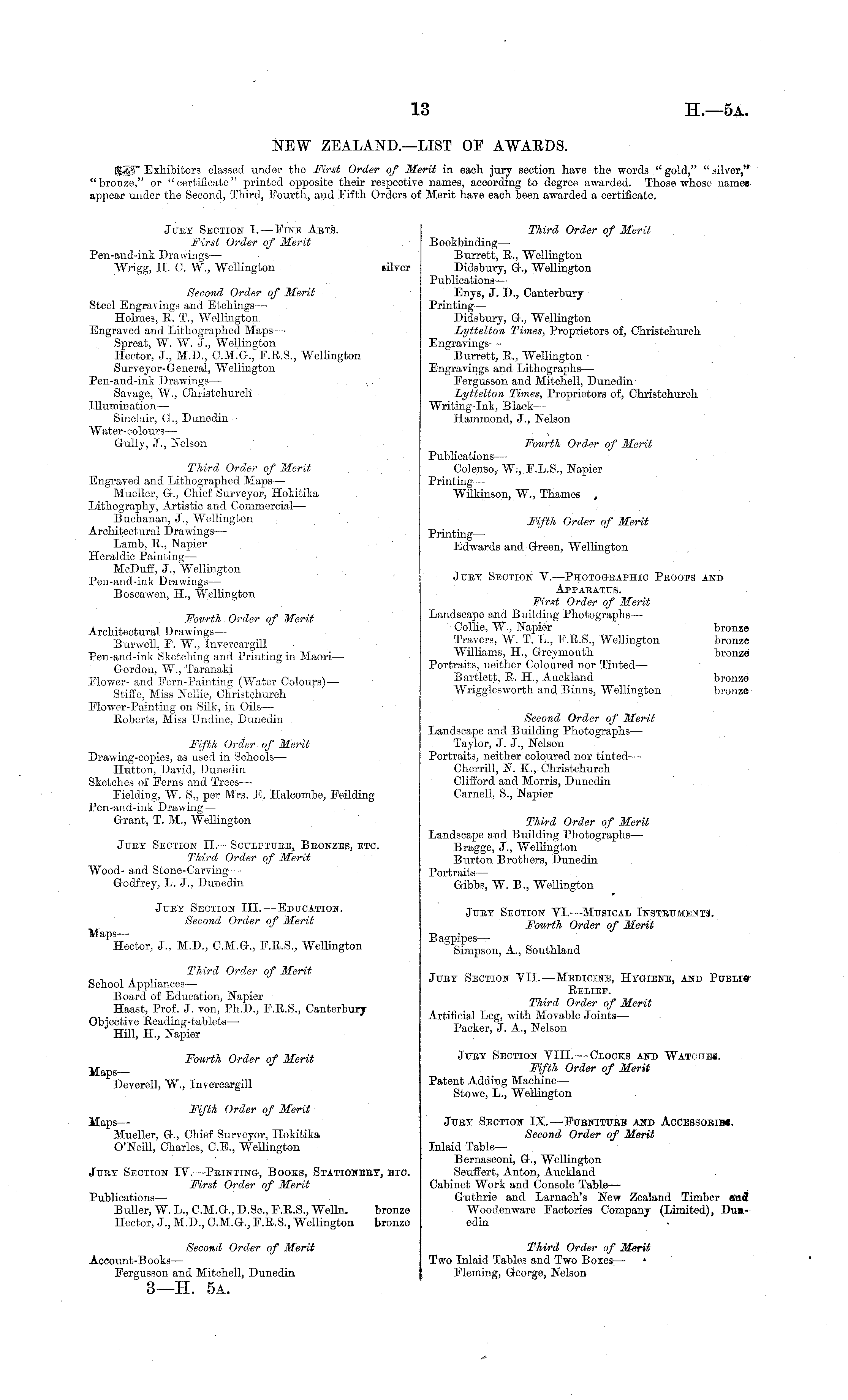 NEW ZEALAND.—LIST OF AWAKDS. IgSgr Exhibitors classed under the First Order of Merit in each jury section have the words " gold," " silver," "bronze," or "certificate" printed opposite their respective names, according to degree awarded. Those whose namesappear under the Second, Third, Fourth, and Fifth Orders of Merit have each been awarded a certificate.