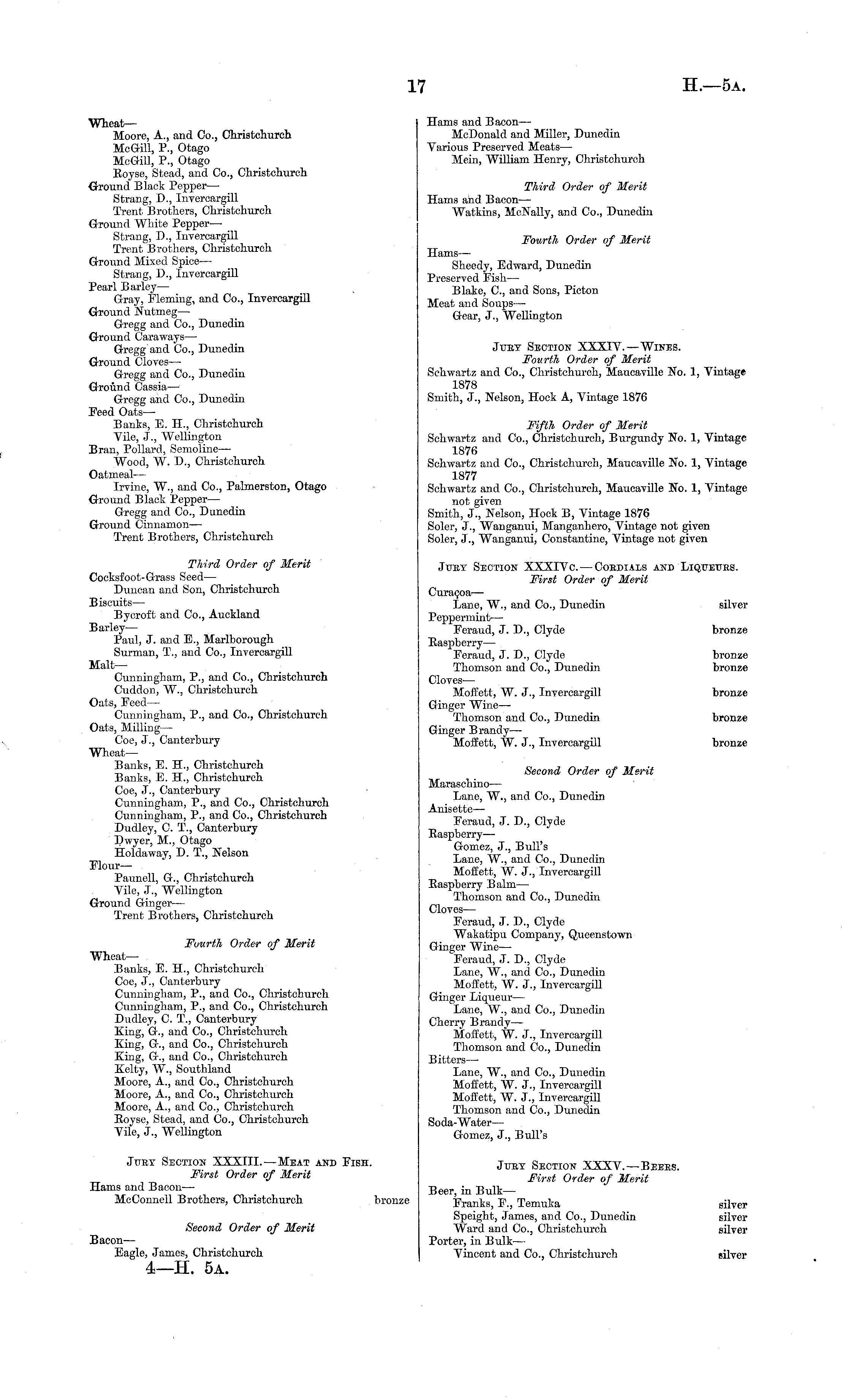 Hams and Bacon — McDonald and Miller, Dunedin Various Preserved Meats — Mem, William Henry, Christchurch Third Order of Merit Hams and Bacon — Watkins, McNally, and Co., Dunedin Fourth Order of Merit Hams — Sheedy, Edward, Dunedin Preserved Fish — Blake, O, and Sons, Picton Meat and Soups— Gear, J., Wellington Juby Section XXXIV. —Wines. Fourth Order of Merit Sehwartz and Co., Christchurch, Maucaville No. 1, Vintage 1878 Smith, J., Nelson, Hook A, Vintage 1876 Fifth Order of Merit Schwartz and Co., Christchurch, Burgundy No. 1, Vintage 1876 Schwartz and Co., Christchurch, Maucaville No. 1, Vintage 1877 Schwartz and Co., Christchurch, Maucaville No. 1, Vintage not given Smith, J., Nelson, Hock B, Vintage 1876 Soler, J., Wanganui, Manganhero, Vintage not given Soler, J., Wanganui, Constantine, Vintage not given Juby Section XXXIVc. — Cordials and Liqueurs. First Order of Merit Curacoa — Lane, W., and Co., Dunedin silver Peppermint— Feraud, J. D., Clyde bronze Baspberry— . Feraud, J. D., Clyde bronze Thomson and Co., Dunedin bronze Cloves — Moffett, W. J., Invercargill bronze Ginger Wine— Thomson and Co., Dunedin bronze Ginger Brandy — Moffett, W. J., Invercargill bronze Second Order of Merit Maraschino— Lane, W., and Co., Dunedin Anisette — Feraud, J. D., Clyde Raspberry — Gomez, J., Bull's Lane, W., and Co., Dunedin Moffett, W. J., Invercargill Raspberry Balm— Thomson and Co., Dunedin Cloves — Feraud, J. D., Clyde Wakatipu Company, Queenstown Ginger Wine — Feraud, J. D., Clyde Lane, W., and Co., Dunedin Moffett, W. J., Invercargill Ginger Liqueur— Lane, W., and Co., Dunedin Cherry Brandy— Moffett, W. J., Invercargill Thomson and Co., Dunedin Bitters— Lane, W., and Co., Dunedin Moffett, W. J., Invercargill Moffett, W. J., Invercargill Thomson and Co., Dunedin Soda-Water — Gomez, J., Bull's Juby Section XXXV. —Beebs. First Order of Merit Beer, in Bulk — Franks, F., Temuka silver Speight, James, and Co., Dunedin silver Ward and Co., Christchurch silver Porter, in Bulk — Vincent and Co., Christchurch silver