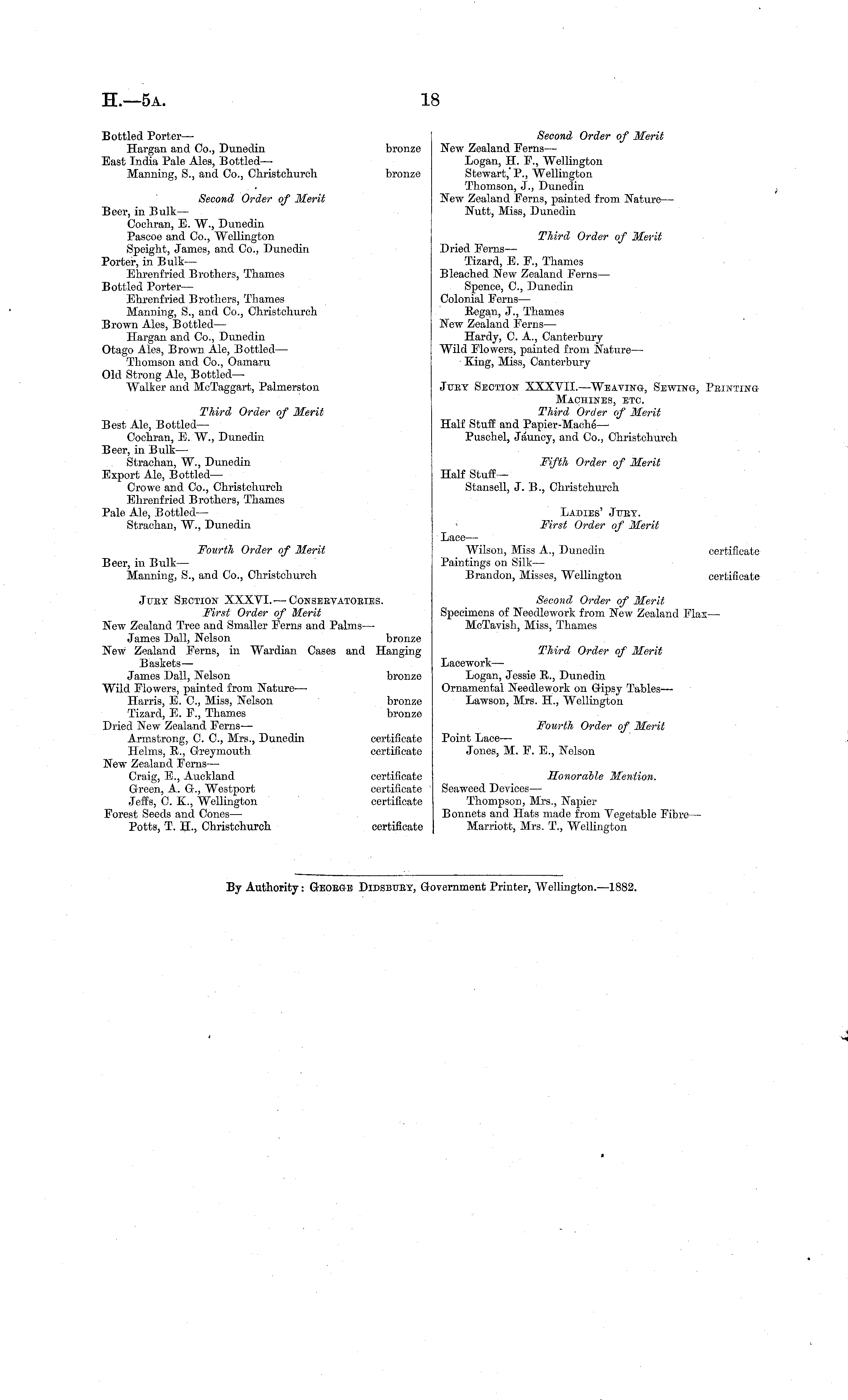 Bottled Porter— Hargan and Co., Dunedin bronze East India Pale Ales, Bottled— Manning, S., and Co., Christchurch bronze Second Order of Merit Beer, in Bulk — Cochran, E. W., Dunedin Pascoe and Co., Wellington Speight, James, and Co., Dunedin Porter, in Bulk— Ehrenfried Brothers, Thames Bottled Porter— Ehrenfried Brothers, Thames Manning, S., and Co., Christchurch Brown Ales, Bottled — Hargan and Co., Dunedin Otago Ales, Brown Ale, Bottled — Thomson and Co., Oamaru Old Strong Ale, Bottled— Walker and McTaggart, Palmerston Third Order of Merit Best Ale, Bottled— Cochran, E. W., Dunedin Beer, in Bulk — Strachan, W., Dunedin Export Ale, Bottled — Crowe and Co., Christchurch Ehrenfried Brothers, Thames Pale Ale, Bottled— Strachan, W., Dunedin Fourth Order of Merit Beer, in Bulk — Manning, S., and Co., Christchurch Juby Section XXXVI.■ —Conservatories. First Order of Merit New Zealand Tree and Smaller Ferns and Palms— James Dall, Nelson bronze New Zealand Ferns, in Wardian Cases and Hanging Baskets— James Dall, Nelson bronze Wild Flowers, painted from Nature— Harris, E. C, Miss, Nelson bronze Tizard, E. F., Thames bronze Dried New Zealand Ferns— Armstrong, C. C, Mrs., Dunedin certificate Helms, R., Greymouth certificate New Zealand Ferns — Craig, E., Auckland certificate Green, A. G., Westport certificate Jeffs, C. X., Wellington certificate Forest Seeds and Cones — Potts, T. H-, Christchurch certificate
