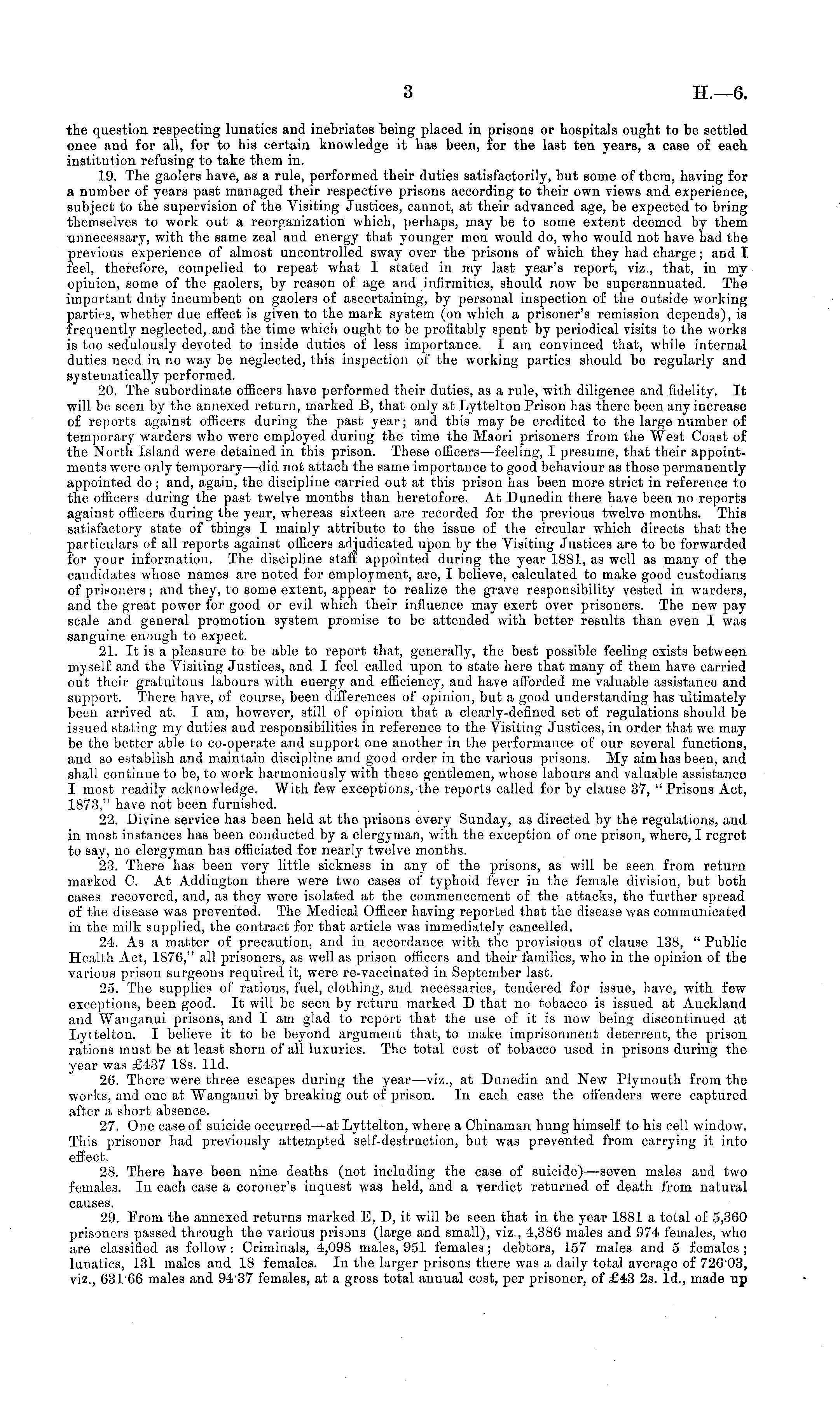 the question respecting lunatics and inebriates being placed in prisons or hospitals ought to be settled once and for all, for to his certain knowledge it has been, for the last ten years, a case of each institution refusing to take them in. 19. The gaolers have, as a rule, performed their duties satisfactorily, but some of them, having for a number of years past managed their respective prisons according to their own views and experience, subject to the supervision of the Visiting Justices, cannot, at their advanced age, be expected to bring themselves to work out a reorganization which, perhaps, may be to some extent deemed by them unnecessary, with the same zeal and energy that younger men would do, who would not have had the previous experience of almost uncontrolled sway over the prisons of which they had charge; and I feel, therefore, compelled to repeat what I stated in my last year's report, viz., that, in my opinion, some of the gaolers, by reason of age and infirmities, should now be superannuated. The important duty incumbent on gaolers of ascertaining, by personal inspection of the outside working parties, whether due effect is given to the mark system (on which a prisoner's remission depends), is frequently neglected, and the time which ought to be profitably spent by periodical visits to the works is too sedulously devoted to inside duties of less importance. I am convinced that, while internal duties need in no way be neglected, this inspection of the working parties should be regularly and systematically performed. 20. The subordinate officers have performed their duties, as a rule, with diligence and fidelity. It will be seen by the annexed return, marked B, that only at Lyttelton Prison has there been any increase of reports against officers during the past year; and this maybe credited to the large number of temporary warders who were employed during the time the Maori prisoners from the West Coast of the North Island were detained in this prison. These officers—feeling, I presume, that their appointments were only temporary —did not attach the same importance to good behaviour as those permanently appointed do; and, again, the discipline carried out at this prison has been more strict in reference to the officers during the past twelve months than heretofore. At Dunedin there have been no reports against officers during the year, whereas sixteen are recorded for the previous twelve months. This satisfactory state of things I mainly attribute to the issue of the circular which directs that the particulars of all reports against officers adjudicated upon by the Visiting Justices are to be forwarded for your information. The discipline staff appointed during the year 1881, as well as many of the candidates whose names are noted for employment, are, I believe, calculated to make good custodians of prisoners; and they, to some extent, appear to realize the grave responsibility vested in warders, and the great power for good or evil which their influence may exert over prisoners. The new pay scale and general promotion system promise to be attended with better results than even I was sanguine enough to expect. 21. It is a pleasure to be able to report that, generally, the best possible feeling exists between myself and the Visiting Justices, and I feel called upon to state here that many of them have carried out their gratuitous labours with energy and efficiency, and have afforded me valuable assistanco and support. There have, of course, been differences of opinion, but a good understanding has ultimately been arrived at. I am, however, still of opinion that a clearly-defined set of regulations should be issued stating my duties and responsibilities in reference to the Visiting Justices, in order that we may be the better able to co-operate and support one another in the performance of our several functions, and so establish and maintain discipline and good order in the various prisons. My aim has been, and shall continue to be, to work harmoniously with these gentlemen, whose labours and valuable assistance I most readily acknowledge. With few exceptions, the reports called for by clause 37, " Prisons Act, 1873," have not been furnished. 22. Divine service has been held at the prisons every Sunday, as directed by the regulations, and in most instances has been conducted by a clergyman, with the exception of one prison, where, I regret to say, no clergyman has officiated for nearly twelve months. 23. There has been very little sickness in any of the prisons, as will be seen from return marked C. At Addington there were two cases of typhoid fever in the female division, but both cases recovered, and, as they were isolated at the commencement of the attacks, the further spread of the disease was prevented. The Medical Officer having reported that the disease w ras communicated in the milk supplied, the contract for that article was immediately cancelled. 24. As a matter of precaution, and in accordance with the provisions of clause 138, " Public Health Act, 1876," all prisoners, as well as prison officers and their families, who in the opinion of the various prison surgeons required it, were re-vaccinated in September last. 25. The supplies of rations, fuel, clothing, and necessaries, tendered for issue, have, with few exceptions, been good. It will be seen by return marked D that no tobacco is issued at Auckland and Wanganui prisons, and I am glad to report that the use of it is now being discontinued at Lyttelton, I believe it to be beyond argument that, to make imprisonment deterrent, the prison rations must be at least shorn of all luxuries. The total cost of tobacco used in prisons during the year was £437 18s. lid. 26. There were three escapes during the year —viz., at Dunedin and New Plymouth from the works, and one at Wanganui by breaking out of prison. In each case the offenders were captured after a short absence. 27. One case of suicide occurred —at Lytt