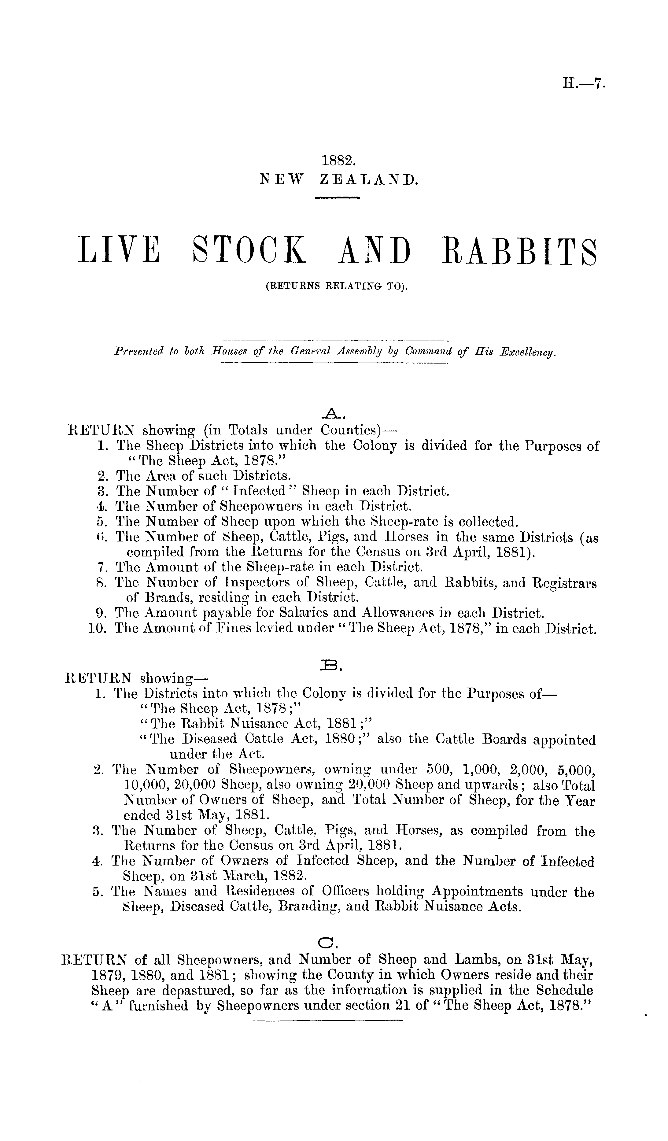 _A_. RETURN showing (in Totals under Counties)— 1. The Sheep Districts into which the Colony is divided for the Purposes of "The Sheep Act, 1878." 2. The Area of such Districts. 3. The Number of " Infected" Sheep in each District. 4. The Number of Sheepowners in each District. 5. The Number of Sheep upon which the Sheep-rate is collected. ti. The Number of Sheep, Cattle, Pigs, and Horses in the same Districts (as compiled from the Returns for the Census on 3rd April, 1881). 7. The Amount of the Sheep-rate in each District. 8. The Number of inspectors of Sheep, Cattle, and Rabbits, and Registrars of Brands, residing in each District. 9. The Amount payable for Salaries and Allowances in each District. 10. The Amount of Fines levied under " The Sheep Act, 1878," in each District. B. RETURN showing— 1. The Districts into which the Colony is divided for the Purposes of— " The Sheep Act, 1878 ;" "The Rabbit Nuisance Act, 1881;" "The Diseased Cattle Act, 1880;" also the Cattle Boards appointed under the Act. 2. The Number of Sheepowners, owning under 500, 1,000, 2,000, 5,000, 10,000, 20,000 Sheep, also owning 20,000 Sheep and upwards; also Total Number of Owners of Sheep, and Total Number of Sheep, for the Year ended 31st May, 1881. 8. The Number of Sheep, Cattle. Pigs, and Horses, as compiled from the Returns for the Census on 3rd April, 1881. 4. The Number of Owners of Infected Sheep, and the Number of Infected Sheep, on 31st March, 1882. 5. The Names and Residences of Officers holding Appointments under the Sheep, Diseased Cattle, Branding, and Rabbit Nuisance Acts. O. RETURN of all Sheepowners, and Number of Sheep and Lambs, on 31st May, 1879, 1880, and 1881; showing the County in which Owners reside and their Sheep are depastured, so far as the information is supplied in the Schedule "A" furnished by Sheepowners under section 21 of "The Sheep Act, 1878."