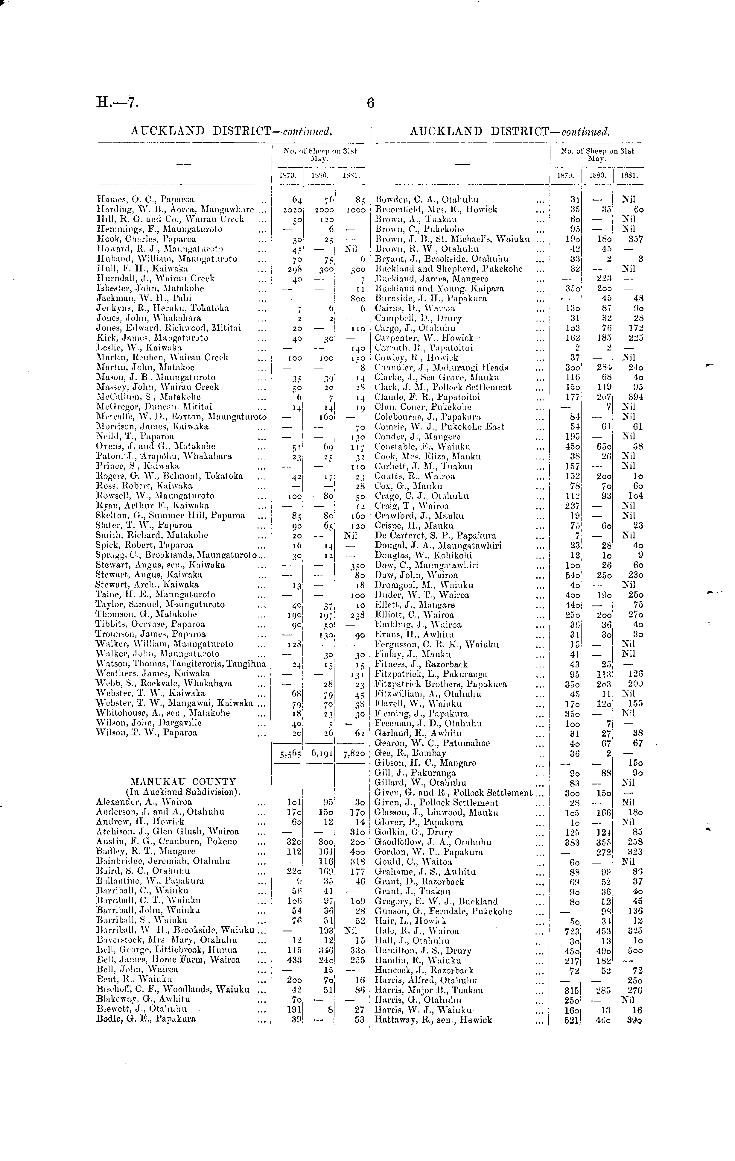 No. of Sheep on 31st May. 1879. 1880. 1881. Bowden, C. A., Otahuhu ... 31 — Nil Broomheld, Mrs. E., Howick ... 35 35 6o Brown, A., Tuakau ... 6o —■ Nil Brown, C, Pukekohe ... 95 — Nil Brown, J. B., St. Michael's, Waiuku ... 19o 18o 357 Brown, E. W., Otahuhu ... 42 45 — Bryant, J., Brookside, Otahuhu ... 33 2 3 Buckland and Shepherd, Pukekohe ... 32 — Nil Buckland, James, Mangere ... — 223 — Buckland and Young, Kaipara ... 35o 2oo — Burnside, J. II., Papakura ... •— 45 48 Cairns, D., Wairoa ... 13o 87 9o Campbell, D., Drury ... 31 32 28 Cargo, J., Otahuhu ... lo3 70 172 Carpenter, W., Howick - ... 162 185 225 Cavruth, Ii., Papatoitoi ... 2 2 —. Cowley, E., Howick ... 37 — Nil Chandler, J., Mahurangi Heads ... 3oo 284 24o Clarke, J., Sea Grove, Mauku ... 116 G8 4o Clark, J. M., Pollock Settlement ... loo 119 95 Claude, F. E., Papatoitoi ... 177 2o7 394 Clun, Coner, Pukekohe ... — 7 Nil Colebourne, J., Papakura ... 84 — Nil Comrie, W. J., Pukekohe East ... 54 61 61 Conder, J,, Mangere ... 195 — Nil Constable, E.-, Waiuku ... 45o 65o 38 Cook, Mrs. Eliza, Mauku ... 38 26 Nil Corbett, J. M., Tuakau ... 157 — Nil Coutts, E., Wairoa ... 152 2oo lo Cox, G., Mauku ... 78 7o 6o Crago, C. J., Otahuhu ... 112 93 lo4 Craig, T, Wairoa ... 227 — Nil Crawford, J., Mauku ... 19 — Nil Crispe, II., Mauku ... 75 6o 23 De Carteret, S. P., Papakura ... 7 —■ Nil Dougal, J. A., Maungatawhiri ... 23 28 4o Douglas, W., Kohikohi ... 12 lo 9 Dow, C, Maungatawhiri ... loo 26 6o Dow, John, Wairoa ... 54o 25o 23o Dromgool, M., Waiuku ... 4o — Nil Duder, W. T., Wairoa ... 4oo 19o 25o Ellett, J., Mangare ... 44o — 75 Elliott, 0., Wairoa ... 25o 2oo 27o Enabling, J., Wairoa ... 3G 36 4o Evans, H., Awhitu ... 31 3o So Fergusson, C. E. K., Waiuku ... 15 — Nil Finlay, J., Mauku ... 41 — Nil Fitness, J., Eazorback ... 43 25 — Fitzpatriek, L., Pakuranga ... 95 113 126 Fitzpatriek Brothers, Papakura ... 35o 2o3 200 Fitzwilliam, A., Otahuhu ... .45 11 Nil Flavell, W., Waiuku ... l7o 12o 155 Fleming, J., Papakura ... 35o — Nil Freeman, J. D., Otahuhu ... loo 7 — Garland, E., Awhitu ... 31 27 38 Gearon, W. C, Patumahoe ... 4o 67 67 Gee, E., Bombay ... 36 2 — Gibson, H. C, Mangare ... ■—■ ■— 15o Gill, J., Pakuranga ... 9o 88 9o Gillard, W., Otahuhu ... 83 — Nil Given, G. and E., Pollock Settlement... 3oo loo — Given, J., Pollock Settlement ... 28 — Nil Glasson, J., Linwood, Mauku ... lo5 166 18o Glover, P., Papakura ... lo — Nil Godkin, G., Drury ... 125 121 85 Goodfellow, J. A.', Otahuhu ... 383 355 258 Gordon, W. P., Papakura ... — 272 323 Gould, C, Waitoa ... 6o — Nil Grahame, J. S., Awhitu ... 88 99 86 Grant, D., Eazorback ... 69 52 37 Grant, J., Tuakau ... 9o 36 4o Gregory, E. W. J., Buckland ... 8o S2 45 Gunson, G., Perndale, Pukekohe ... — 98 136 Hair, L., Howick ... 5o 31 12 Hale, E. J., Wairoa ... 723 453 325 Hall, L, Otahuhu ... 3o 13 lo Hamilton, J. S., Drury ... 15o; 49o 5oo Hamlin, E., Waiuku ... 217 182 — Hancock, J., Eazorback ... 72 52 72 Harris, Alfred, Otahuhu ... — — 25o Harris, Major B., Tuakau ... 315 285 276 Harris, G., Otahuhu ... 25o — Nil Harris, W. J., Waiuku ... 16o 13 16 Hattaway, B., sen., Howick ... 521; 46o 39a