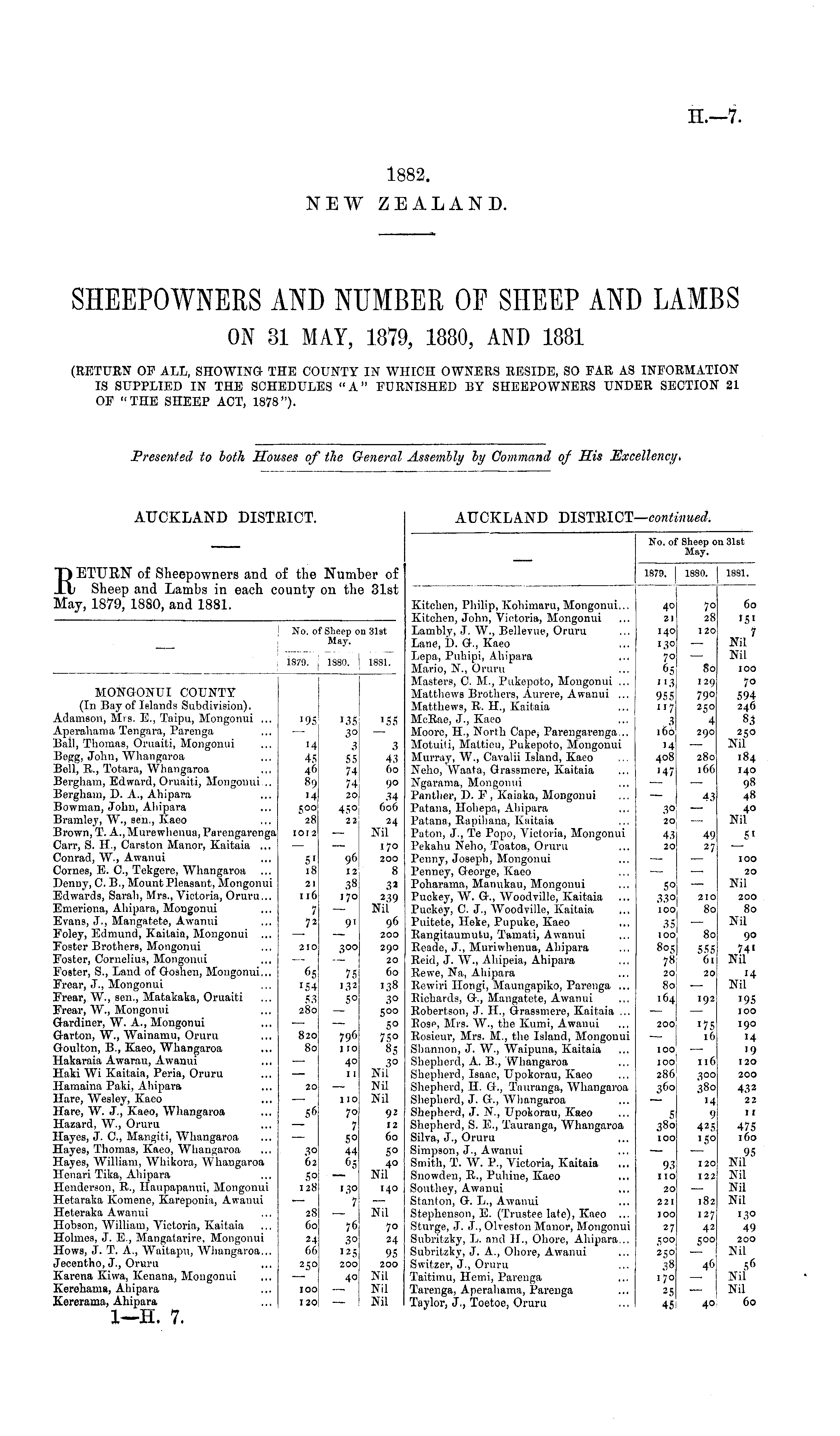 AUCKLAND DISTRICT. RETURN of Sheepowners and of the Number of Sheep and Lambs in each county on the 31st May, 1879, 1880, and 1881.