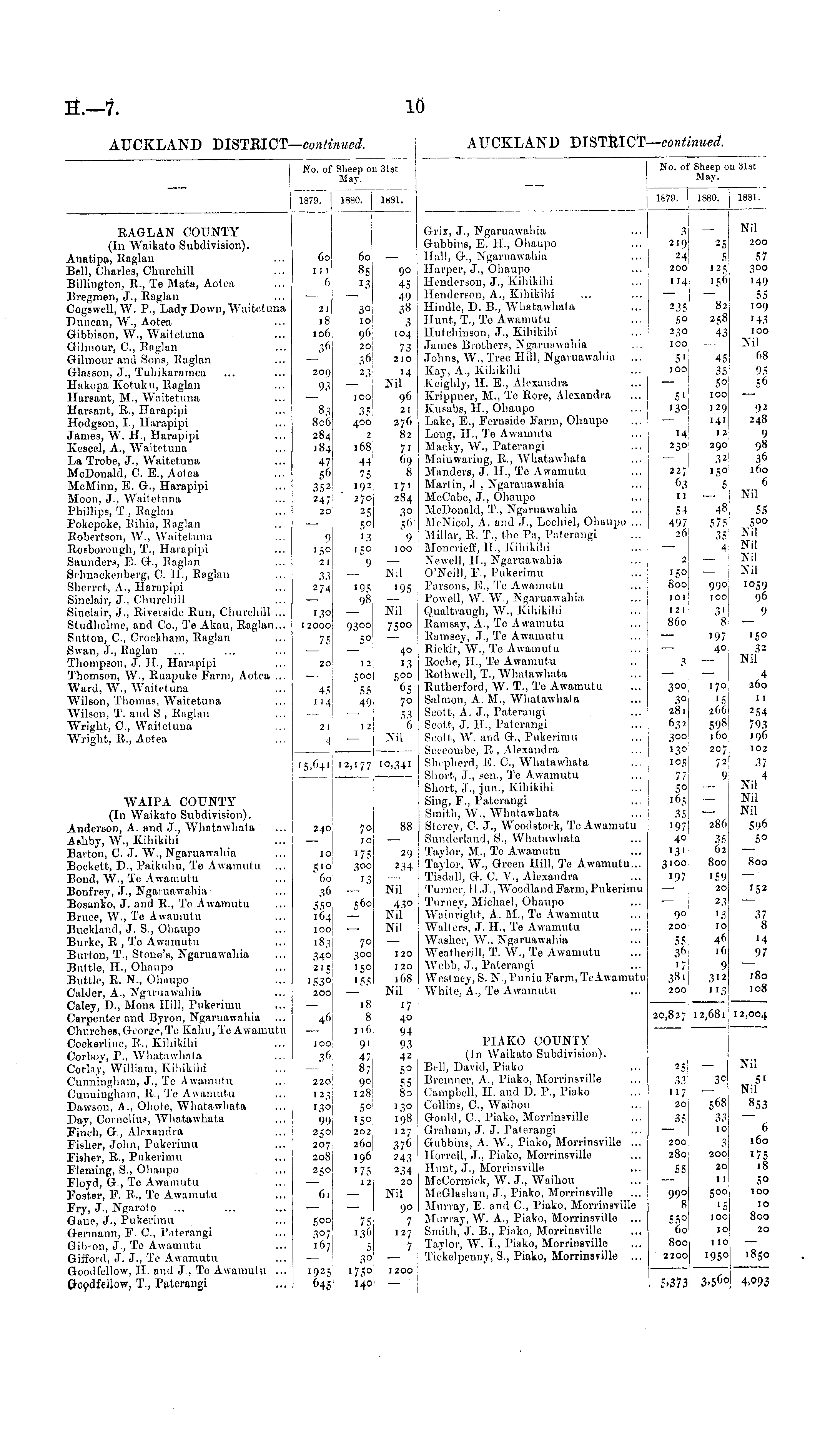 No. of Sheep on 31st May. j 1879. 1880. I 1881. RAGLAN COUNTY (In Waikato Subdivision). Anatipa, Eaglau Bell, Charles, Churchill Billington, R., Te Mata, Aotea Bregmen, J., Raglan Cogswell, W. 1'., Lady Down, Waitetuna Duncan, W., Aotea Gibbison, W., Waitetuna G-ilmour, C, Ruglnn Gihnour and Sons, Raglan Glasson, J., Tuhiliaramea Hakopa Kotulni, Raglan Harsant, M., AVaitetuna Harsant, R., Harapipi Hodgson, I, Harapipi James, W. H., Harapipi ICescel, A., Waitetuna La Trobe, J., Waitetuna McDonald, C. E., Aolea McMinn, E. G., Harapipi Moon, J . Wailetuna Phillips, T., Raglan Pokepoke, liiliin, Raglan Robertson, W., Waitetuna Eoiborough, T., Harapipi Saunders, E. Cr., Raglan Schnackenberg, C. EC., Raglan Sherrct, A., Harapipi Sinclair, J., Churchill Sinclair, J., Riverside Run, Churchill ... Studholtne, and Co., Xe Akau, Raglan... Button, O.| Crockham, Raglan Swan, J., Raglan Thompson, J. II., Harftpipi Thomson, W-, Ruapuke Farm, Aotea ... Ward, W., Waiteluna Wilson, Thomas, Waitetuna Wilson, T. and S , Raglan Wright, C, Waitetuna Wright, R., Aotea 60 I I I 6 21 18 106 3« 209 93 8h 806 284 .84 47 56 35s 247 2C 60 85 13 3*1 10 96; 2°; 23! 100 400 2 168 44; ' 5 192 270 25 5° ■3 1 50 9 90 45 49 38 3 104 73 210 14 Nil s 276 82 7' 69 8 1.71 284 3° 9 100 9 '5 C 21 Nil 33 i 2?4 j 195 98) '95 Nil 75°° 130 12000 - , 93"O 50 n 70 (> 2C 1 2 45 114 500 55! 49 I _^ 2 1 12 4 Nil I5.64i ' 2> I 77 10.34' WAIPA COUNTY (In Waikato Subdivision). Anderson, A. and J., Whatawhata Aslib)-, W., Kihikihi Bavton, C. J. W.| Ngavuawaliia Bockett, D., Paikuhu, Te Awamutu Bond, W., To Avt-amutu Bonfrpv, J., Ngaiuawahia Bosanko, J. and R., Te Awamutu Bruce, W., Te Awamutu Buckland, J. S., Oliaupo Burke, R , To Awnmutu Burton, T., Stone's, Ngaruawahia Bultle, H., Ohanpo Buttle, R. N., Olmupo Calder, A., Ngaruawohia Caley, D., Mona Hill, Pukerimu Carpenter and Byron, Ngaruawahia Churches, Qcorgc, Te Kahu, Te Awamutu Cockerline, R., Kiiiikihi Corboy, P., Whatawlmla Corlav, William, Kihikihi Cunningham, J., Te Awamulu Cunuingliain, R., Te Awamutu Davvson, A., Olioto, Wliatawliala Day, Corneliu?, Wliatawhata Finch, G-, Alexandra Fisher, John, Pukerimu Fiiher, R., Pukerimu Fleming, S., Ohanpo Floyd, G., Te Awamutu Foster, E. R., Te Awamulu Fry, J., Ngarolo Gnne, J., Pukerimu Germann, F. C, Pitterangi Gib-on, J., Te Awamutu Gilfovd, J. J., Te Awamutu Goodfellow, H. and J , Te Awamulu ... aopdfelloir, T., Taterangi 240: 10 5'° 60 3&j 55° 164! 100! 183! 34°: '53°! 2001 4 7° 10 !75 300 13 560 70 300J 'S°j 15 51 18 8 lift 9 1 47 87 90 128 5° '5° 202 260 196 '75 12 88 29 234 Nil 43° Nil Nil 120 J3O 168 Nil 17 40 94 93 42 5° 55 80 130 198 12; 3/6 '43 234 20 Nil ioc\ 3 «| 220 130! 99 23° 207I 208 250 .6, 1 s00! 3°7 167 75 1.,6 90 7 127 7 1925' 645 5 3° 1750 I40 1 1200