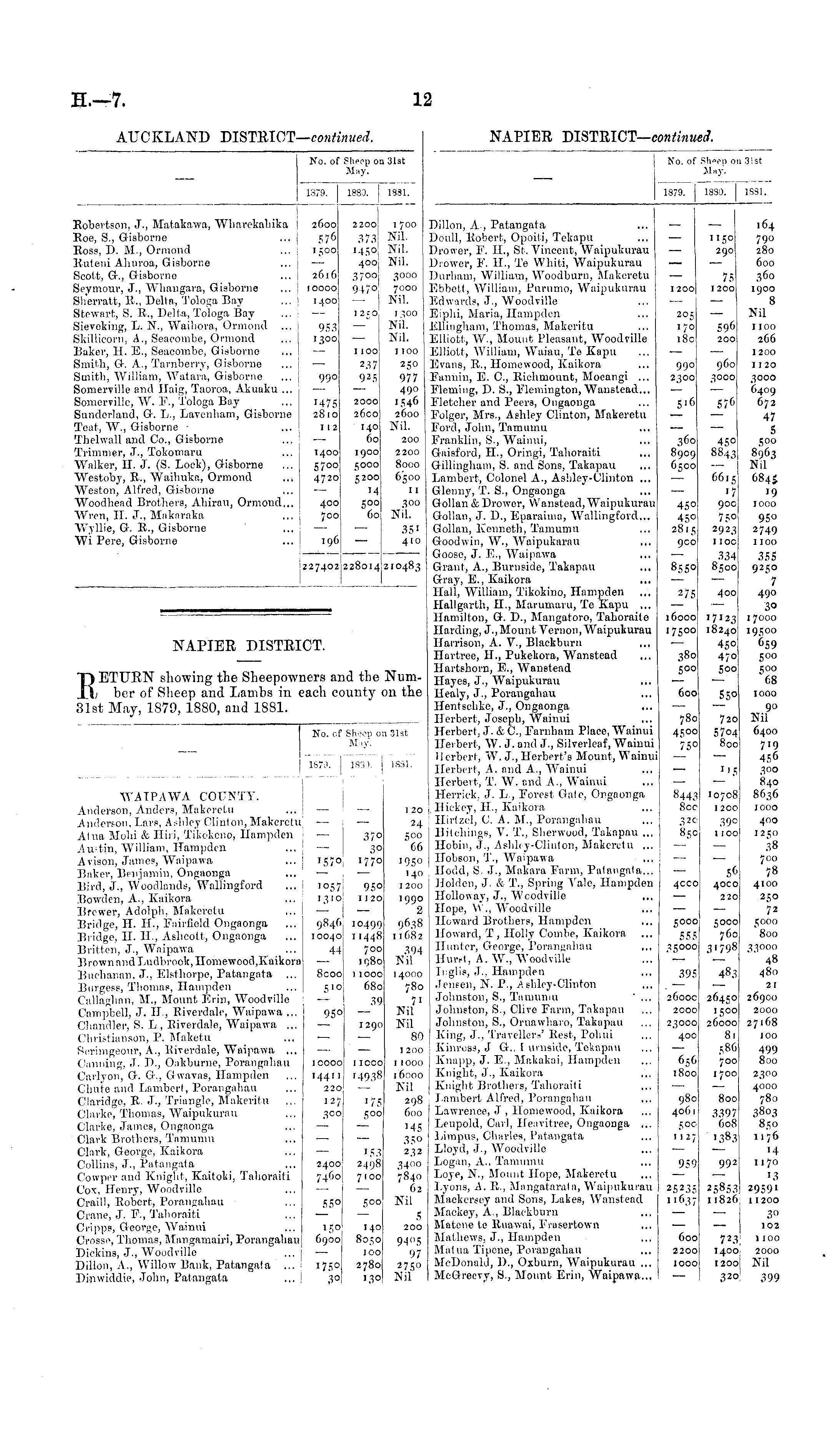 NAPIER DISTRICT. RETURN showing the Sheepowners and the Number of Sheep and Lambs in each county on the 31st May, 1879, 1880, and 1881.