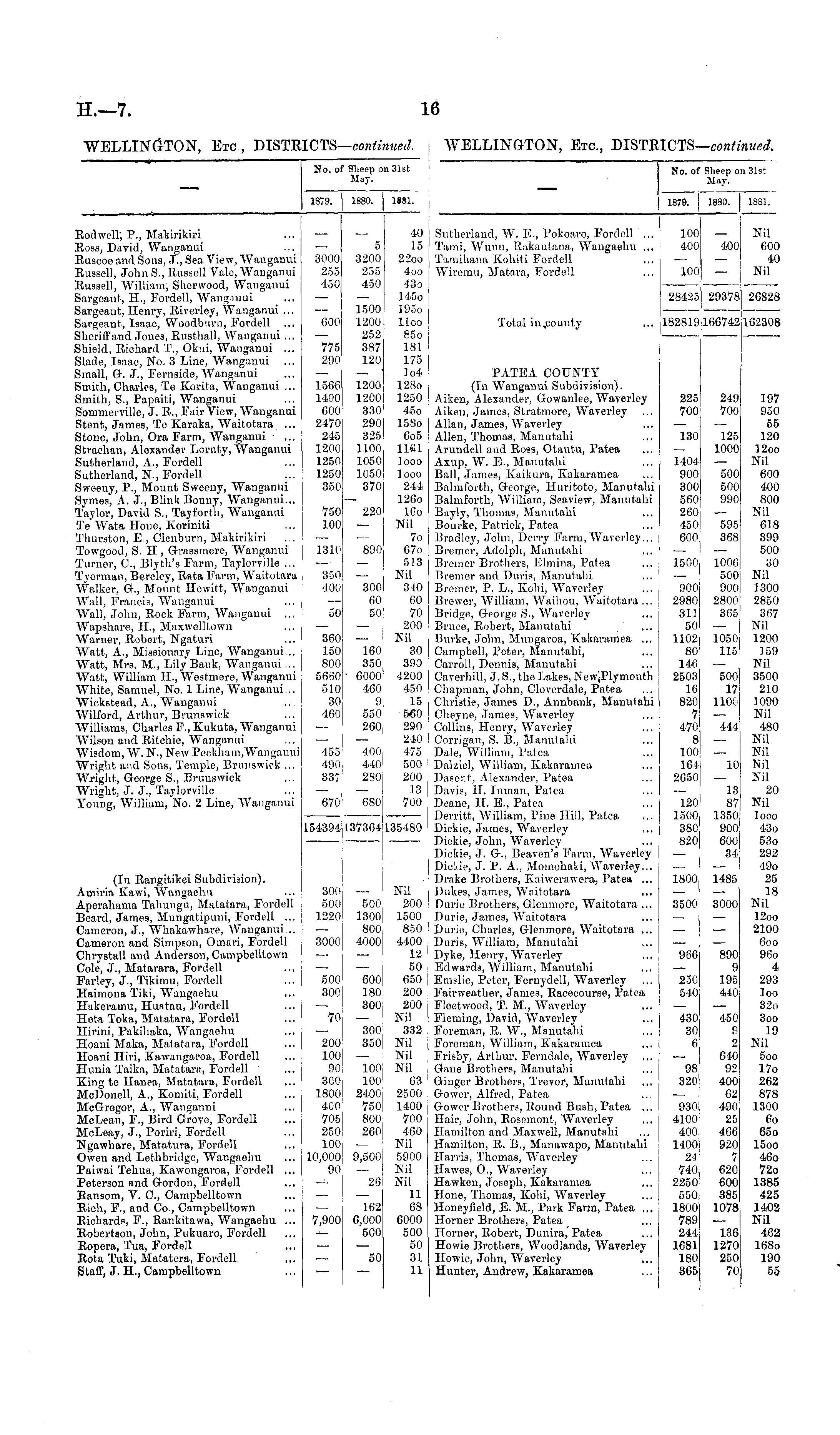 No. of Sheep on 31st May. | 1879. 1830. | 1SSI 1830. 1881. Sutherland, W. E., Pokoaro, Forclell ... Tami, Wunu, Rakautana, Wiuigaelm ... Tamibama Kohiti Fordell Wiremu, Matara, Fordell 100 400 400 Nil 600 40 Nil 100 I 28425! ! 29378J !; 26828 Total in.county 182819 i 166742; i , 1162308 PATEA COUNTY (In Wanganui Subdivision). Aiken, Alexander, Gowanloe, Waverley Aikcn, James, Stvatmoro, Waverley Allan, James, Waverley Allen, Thomas, Manutalii Arundell and Boss, Otautu, Patea Axup, W. E., Manutahi Ball, James, Kaikura, Kakaranica Balmforth, Goorge, Huritolo, Manutahi Balmforth, William, Seavicw, Manutahi B&yly, Thomas, Manutalii Bourke, 1'alrick, Patea Bradley, John, Derry Farm, Wavevley... Bremcr, Adolph, Manutahi Bremen Brothers, Elmiria, Patea Breincr and Duris, Manutahi Bremer, P. L., Kohi, Waverley Brewer, William, Waihou, Waitotara ... Bridge, George S., WavcrJey Bruee, Robert, Manulahi Burke, John, Muugaroa, Kakaramea ... Campbell, Peter, Manutahi, Carroll, Dennis, Manutalii Caverhill, J. S., the Lakes, New,Plymouth Chapman, John, Cloverdale, Patea Christie, James D., Annbank, Manutahi Cheyne, James, Waverloy Collins, Henry, Waverley Oorrigan, S. B., jlanulahi Dale, William, I'atea Dalziel, William, Kakaramea Dasent, Alexander, Patea Davis, IT. Inman, Pa'ea Deane, 11. E., Patea Derritt, William, Pine Hill, Patea Dickie, James, Waverley Dickie, John, W^averley Dickie, J. G-., Beaven's Farm, Wayerley Dielie, J. P. A., Momohalu, Waverley... Drake Brothers, Kaivvorawera, Patea ... Dukes, James, Waitotara Durie Brothers, Glenmore, Waitotara ... Davis, James, Waitotara Durie, Charles, Glenmore, Waitotnra ... Duris, William, Manutahi Dyke, Henry, WaTeriay Edwards, William, Manutahi Emslie, Peter, Fernydell, Waverley Fairweather, James, Racecourse, I'atea Fleetwood, T. M., AVarerley Fleming, David, Waverley Foreman, 71. W., Manutahi Foreman, William, Kakaramca Frisby, Arthui 1, Ferndale, Waverley Gane Brothers, Manutahi Ginger Brothers, Trevor, Manulahi Govvcr, Alfred, Patea Gowcr Brothers, Hound Bush, Patea ... Hair, John, Eoseraont, Waverley Hamilton and Maxwell, Manutahi Hamilton, R. B., Manawapo, Manulahi Harris, Thomas, Waverley Hanes, O., Waverley Hawkeu, Joseph, Kakaraniea Hone, Thomas, Kohi, AVaverloy Honeyfield, E. M., Park Farm, Patea ... Horner Brothers, Patea Horner, Robert, Dunira, Patea Howie Brothers, Woodlands, Waverley Howie, John, Waverley Hunter, Andrew, Kakararnea 225 700 130 1404 900 300 560 260; 450 600 1500 900 2980! 311 50 1102! 80 146 2503 16 820 7 470 Q 100 164 2650 120 1500 380 820 249 700 125 1000 500 500 090 595 368 1006 500 900 28001 365) 1050J 115 500 17 1100 444 10! 13 87J 1860 900! 600| 84 197 950 55 120 12oo Nil 600 400 800 Nil 618 399 500 30 Nil 1300 2850 367 Nil 1200 159 Nil 3500 210 1090 Nil 480 Nil Nil Nil Nil 20 Nil looo 43o 53o 292 49o 25 18 Nil 12oo 2100 Goo 96o 4 293 loo 32o 3oo 19 Nil 5oo 17o 262 878 13C0 6o 65o 15oo 46o 72o 1385 425 1402 Nil 462 168o 190 55 1800 1485 3500 3000 966 250 540 890 9 195 440 430 30 6 i 98 320 930 4100 400 1400; 241 740] 2250 550 1800 789 244 1681 180 365 450 S 2 640 92 400 62 490 25 466 920 7 620 600 385 1078 136 1270 250 70