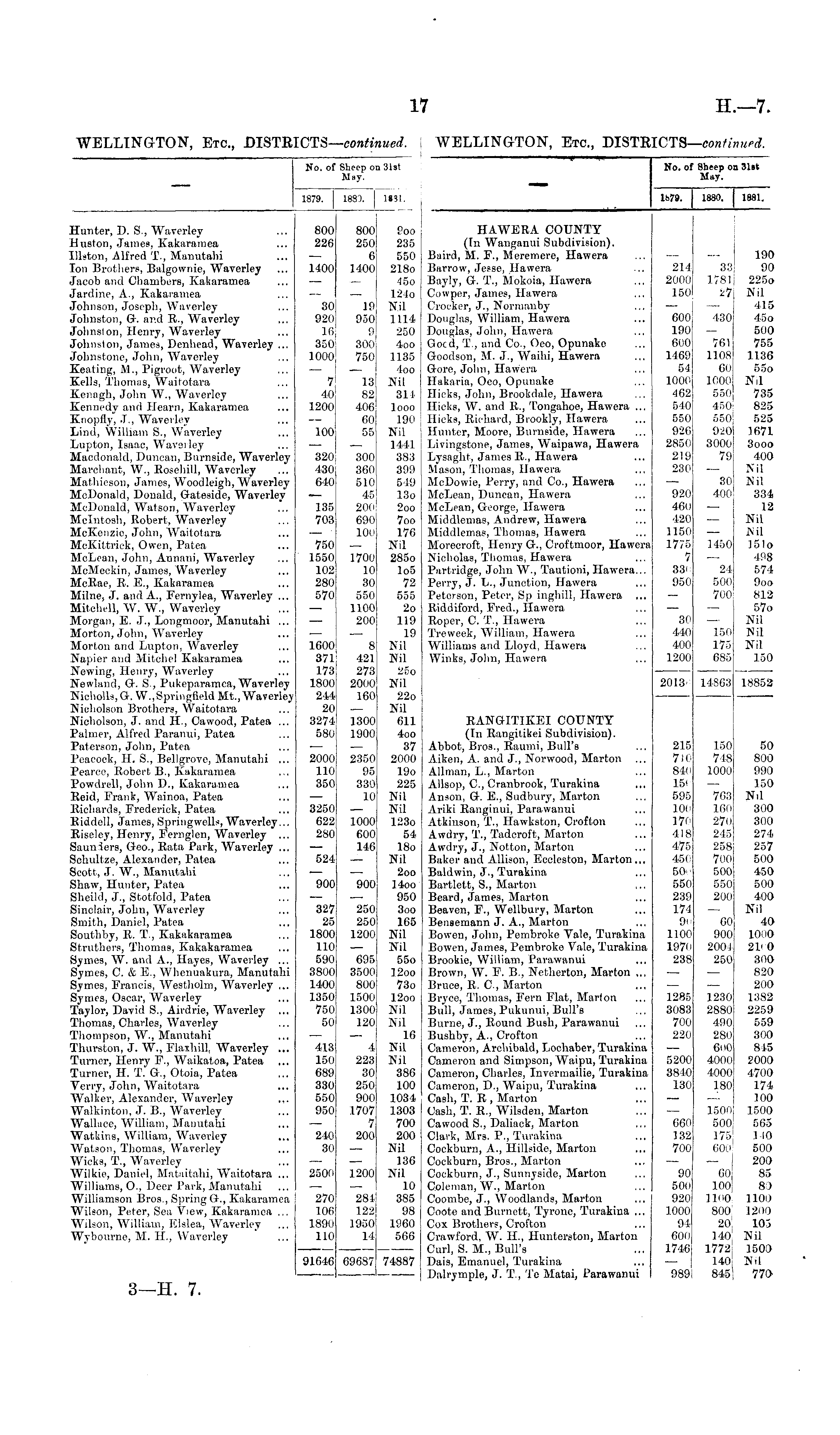 No. of Sheep on 3l8t May. lb?9. 1830. 1831. HAWERA COUNTY (In Wanganui Subdivision). Baird, M. F., Meremere, Hawera -Barrow, Jesse, Hawera Bayly, G. T., Mokoia, Hawera Cowper, James, Hawera Crocker, J., Normanby Douglas, William, Hawera Douglas, Jolm, Hawera Oocd, T., and Co., Oeo, Opunake Goodson, M. J., Waihi, Hawera Gore, John, Hawera Hakarta, Oeo, Opunake Hicks, Jolm, Brookdale, Hawera Hicks, W. and R., Tongahoe, Hawora ... Hicks, Richard, lirookly, Hawera Hunter, Moore, Bunuide, Hawera Livingstone, James, Waipawa, Hawera Lysaght, James R., Hawera Mason, Thomas, Uawera McDowie, Ferry, and Co., Hawera McLean, Duncan, Hawera McLean, George, Hawera Middlemas, Andrew, Hawera Middleman, Thomas, Hawera Morecroft, Henry G., Croi'tmoor, Hawera Nicholas, Thomas, Hawera Partridge, John W., Tautioni, Hawera... Pen 1}', J. L., Junction, Hawera Peterson, Peter, Sp ingliill, Hawera ... Riddiford, Fred., Hawera Roper, C. T., Hawera Treweek, William, Hawera Williams and Lloyd, Hawera Winks, John, Hawera 214 2000 150 600 i9o; 600! 1469J 541 1000J 4621 510 550 926 2850 219 230 33 1781 87 430 761 1108 60 1000 650 460 660 920 3000 79 190 90 225o : Nil 415 45 o 500 755 1136 55o Nil 735 825 525 1671 3ooo 400 Nil Nil 334 N,l 13 »il 151o 498 574 9oo 812 57o Nil Nil Nil 150 920 460 420 1150 1775 7 33' 950 30 400 : 1450 24 500 7od 30 440 400 1200 150 175 685 2013 14863 18852 RANGITIKEI COUNTY (In Rangitikei Subdivision). Abbot, Bros., Raunii, Bull's Aiken, A. and J., Norwood, Marton Allinan, L., Marton Allsop, 0., Cranbrook, Turakina Anson, G. E., Sudbury, Marton Ariki Ranginui, Paravvanui Atkinson, T., Hawkston, Crofton Awdry, T., Tadcroft, Marton Awdry, J., Notion, Marton Baker and Allison, Eceleston, Marton... Baldwin, J., Turakina Bartlett, S., Marton Beard, James, Marton Beaven, F., Wellbury, Marton Bensemann J. A., Marton Bowen, John, Pembroke Vale, Turakina Bowen, James, Pembroke Vale, Turakina Brookie, William, Parawanui Brown, W. F. B., Netherton, Marton ... Bruce, R. C, Marton Bryce, Thomas, Fern Flat, Marlon Bull, James, Pukunui, Bull's Burne, J., Round Bush, Parawanui Bushby, A., Crofton Cameron, Archibald, Lochaber, Turakina Cameron and Simpson, Waipu, Turakina Cameron, Charles, Invcrmailie, Turakina Cameron, D., Waipu, Turakina Cash, T. R , Marton Cash, T. R., Wilsden, Marton Cavvood S., Paliack, Marton Clark, Mrs. P., Turakina Cockburn, A., Hillside, Martou Cockburn, Bros., Marton Cockburn, J., Sunnyside, Marton Colctnan, W., Marton Coombe, J., Woodlands, Marton Coote and Burnett, Tyrone, Turakina ... Cox Brothers, Crofton Crawford, W. II., Hunterston, Marton Curl, S. M., Bull's Dais, Emanuel, Turakina Dalrymple, J. T , To Matai, Parawanui 215 7)0 84d 151 595 100 17i! 418 475 460 50> 550 239 174 9< 1100 1970 238 1285 3083 700 220 150| 748 1000 768 160 270 245 258 700 500 550! 2001 00| 900 200 i! 250 50 800 990 150 Nil 300 300 274 257 500 450 500 400 Nil 40 10H0 21' 0 300 820 200 1382 2259 559 300 815 2000 4700 174 100 1500 565 M0 500 200 85 8> 1100 1200 105 Nil 150D Nil 770 5200 3810 130 1230 2880 490 280 6uO 4000 4000 180 1500: 500; 175' 600 I 660 132 700 _ I 90 500 920 1000 94 600 1746 GO 100, 1100: 800 20 140 1772J 140 845j 989'