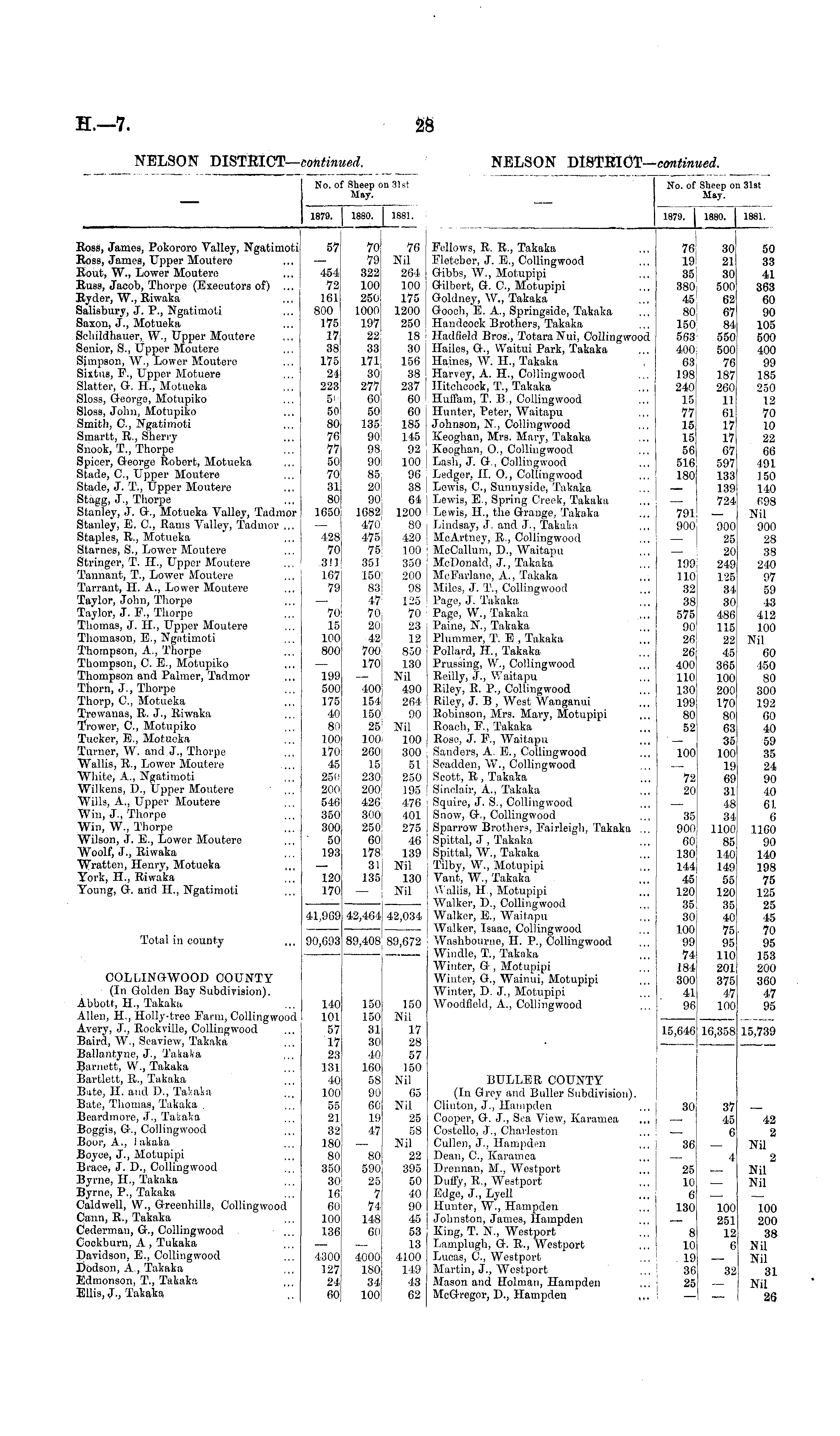 Xo. of Sheep on 31st May. 1879. 1890. 1881. Fellows, E. R., Takaka Fletcher, J. E., Collingwood Gibbs, W., Motupipi Gilbert, G-. C, Motupipi Goldney, W., Takaka Gooch, E. A., Springside, Takaka Ilanrlcock Brothers, Takaka Hadfleld Bros., TotaraNui, Collingwood Hailes, G., VVaitui Park, Takaka Haines, W. II., Takaka Harvey, A. H., Collingwood Hitchcock, T., Takaka IIufFam, T. B., Collingwood Hunter, Peter, Waitapu Johnson, N., Collingwood KeOghan, Mrs. Mary, Takaka Keoghan, 0., Colliugwood Lash, J. G-, Collingwood Ledger, H. 0., Collingwood Lewis, C, Snnnyside, Takaka Lewis, E., Spring Creek, Takaka Lewis, IT., the Grange, Takaka Lindsay, J. and J., Takaka McArtncy, R., Collingwood McCallum, D., Waitapu McDonald, J., Takaka McFarlane, A., Takaka Miles, J. T., Collingwood Page, J. Takaka Page, W., Takaka Paine, N., Takaka Plummer, T. E , Takaka Pollard, H., Takaka Prussing, V\ r., Collingwood Rnilly, J., Waitapu Eiley, R. P., Collingwood Riley, J. B , West Wanganui Robinson, Mrs. Mary, Motupipi Roach, F., Takaka Rose, J. P., Waitapu Sanders, A. E,, Collingwood Scadden, W., Collingwood Scott, R, Takaka Sinclair, A., Takaka Squire, J. S., Collingwood Snow, Gr., Collingwood Sparrow Brothers, Fairleigli, Takaka Spittal, J , Takaka Spittal, W., Takaka Tilbv, W., Motupipi Vant, W., Takaka WalliSj II, Motupipi Walker, D., Collingwood Walker, E., Waitapu Walker, Isaac, Collingwood Washbourne, H. P., Collingwood Windle, T., Takuku AViuter, G , Motupipi Winter, G., Waiuui, Motupipi Winter, D. J., Motupipi Woodfleld, A,, Collingwood 76, 19 35 •■ 380 45 80 150 5G3 400 63 198 240' 15! 77: 15 15 56 516 180, 791 5)00; 199 no 32 38 575 90 26J 26; 400 110 130 199 1 80| 52 30 21 30 500 62 67i 84 550 500 76 187 260 11 61 17 17 67 597 133 139 724 900 25 20 249 125 34 30 486 115 22 45 365 100 200 170 80 63 35 100 19 69 31 48 34 1100 85 140 149 55 120 35 40 75 95 110 201 375 47 100 50 33 41 363 60 90 105 500 400 99 185 250 12 70 10 22 66 491 150 140 (>'98 Nil 900 28 38 240 97 59 43 412 100 Nil 60 450 80 300 192 60 40 59 35 24 90 10 61. 6 1160 90 140 198 75 125 25 45 70 95 153 200 360 47 95 100, 72 30 35 900 ' 60 130 1 144 45 120 35 30 100 99 u 184 300 41 96 15,646 16,358 15,739 BULLER COUNTY (In Grey and Buller Subdivision). Clinton, J., Hampden Cooper, G. J., Sea View, Karamea ,., Costello, J., Charleston Cullen, J., Hampd^n Dean, C, Karamea Dronnan, M., Westport Duffy, R. ( Westport Edge, J., Lyell Hunter, W., Hampden Johnston, James, Hampden King, T. N., Westport Lnniplugh, G. R., Westport Lucas, C., Westporl Martin, J., Westport Mason and Holman, Hampden McGregor, D., Hampden 30 36 25 10 6 130 37 45 C 4 42 2 Nil 2 Nil Nil 8 10 19 36 25 100 251 12 6 100 200 38 Nil Nil 31 Nil 26 32