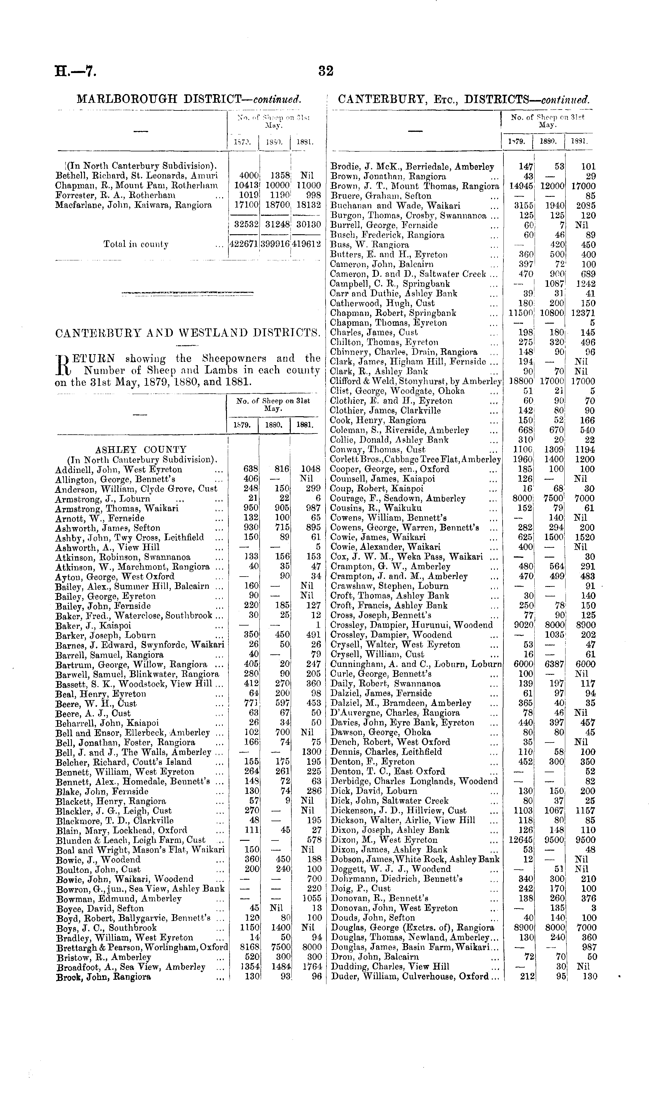 CANTERBURY AND WESTLAND DISTRICTS. RETURN showing the Sheepowners and the Number of Sheep and Lambs in each county on the 31st May, 1879, 1880, and 1881.