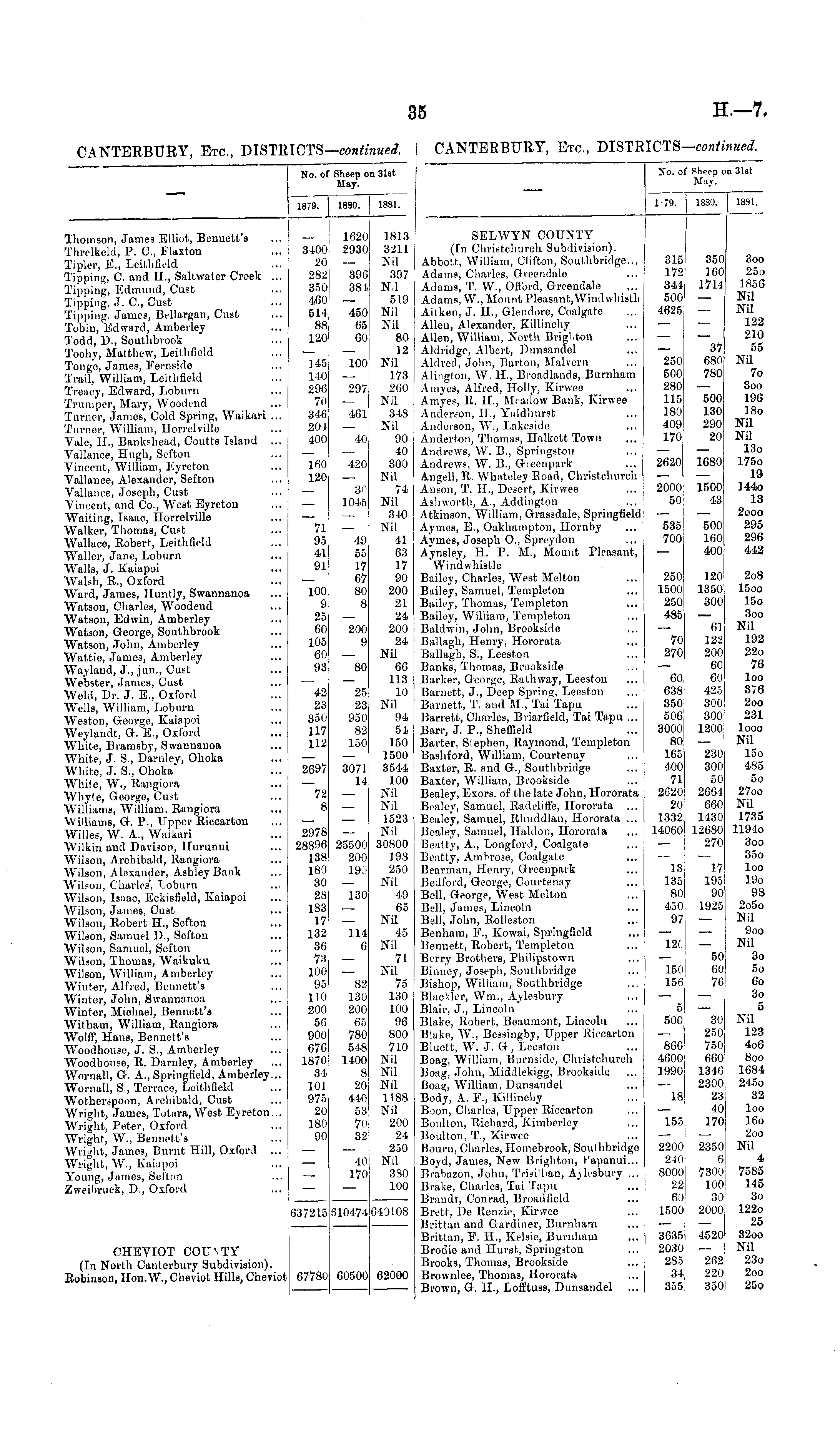 No. of Sheep on 31st May. 1879. 18S0. I 1831. Thomson, James Elliot, Bennett's rhrelkeld, P. C, Flaxton ripler, E., Leitlifield tipping, O. and H., Saltwater Creek ... ripping, Edmund, Cust Pipping, J. 0., Oust Pipping. James, Brllargan, Cust robin, Edward, Ambeiley 1'odd, 1)., Soulhbrook 1'oohy, Matthew, Leilhfield rouge, James, Fernsido l'rail, William, Leitlifield Treuey, Edward, Loburn Fruniper, Mary, Woodend rurner, James, Cold Spring, Waikari ... Furrier, William, Horrelville Vale, If., Bankshead, Coutts Island ... Vallance, Hugh, Sefton ... j Vincent, William, Eyreton ... i Vallance, Alexander, Sefton Vallanee, Joseph, Cust Vincent, and Co., West Eyreton Waiting, Isaac, Horrelyille ... j Walker, Thomas, Cust ... I Wallace, Robert, Leithfiold Waller, Jane, Loburn Walls, J. Kaiapoi Walsh, R., Oxford Ward, James, Huntly, Swannanoa Watson, Charles, Woodend Watson, Edwin, Amberley Watson, George, Southbrook Watson, John, Amberley Wattie, James, Amberley Wayland, J., jun., Cust Webster, James, Cust Weld, Dr. J. E., Oxford Wells, William, Loburn Weston, George, Kaiapoi Weylandt, G. E., Oxford White, Bramsby, Swannanoa White, J. 8., Darnley, Ohoka White, J. S., Ohoka' White, Wi, Rangiora Wliyle, George, Cu<t Williams, William. Rangiora Williams, G-. P., Upper Riccarton Willes, W. A., Waikari Wilkin and Davison, Hurunui Wilson, Archibald, Rangiora Wilson, Alexander, Ashley Bank Wilson, Charles, Loburn Wilson, Isnac, Eckisfield, Kaiapoi Wilson, James, Cust Wilson, Robert II., Sefton Wilson, Samuel D., Sefton Wilson, Samuel, Sefton ... | Wilson, Thomas, Waikuku Wilson, William, Amberley Winter, Alfred, Bennett's Winter, John, Swannanoa Winter, Michael, Bennntt's ... j Wit ham, William, Rangiora Wolff, Hans, Bennett's Woodhouse, J. S., Amberley Woodhouse, R. Darnley, Amberley Wornall, G-. A., Springfield, Amberley... Wornall, S., Terrace, Leithfield Wotherspoon, Archibald, Cust Wright, James, Totnra, West Eyreton... Wright, Peter, Oxford Wright-, W., Bennett's Wright, James, Burnt Hill, Oxford ... Wright, W., Kaiapoi 5foung, James, Sefton Zweibruek, I)., Oxford 3400 20! 282 350 460 514 88! 120 145 140 29ti! 70 346 204 400 100 120; __ 71 95 41 91 100 9 25 60 105 60! 93; j 42 23 350 117 112 1620 2930 396' 381. 450 65 60 100 297 _ 401 40 420 8f 1045 49 55 17 67 80 8 200 9 80 25! 23 950 82; 150 1813 3211 ! Nil 397 N,l 519 Nil Nil 80 12 Nil 173 200 Nil 348 Nil 90 40 300 Nil 74 Nil 310 Nil 41 03 17 90 200 21 24 200 24 Nil 66 113 10 Nil 94 51 150 1500 3544 100 Nil Nil 1523 Nil 30800 198 250 Nil 49 65 Nil 45 Nil 71 Nil 75 130 100 96 800 710 Nil Nil Nil 1188 Nil 200 24 250 Nil 330 100 269/j 3071 14 72 8 2978 28890 138 180 30 28 183 17 132 36 73 IOO: 95 110 200 66 900 1 67G 1870 34 101 975 20 180 90 25500 200 190 130 114 6 82 13d 200 05 780| 548i 1400! 8 20! 440 53! 70 32 40| 170637215 r>iO474| i 1040108 CHEVIOT COU'TY (In North Canterbury Subdivision). Robinson, Hon.W., Cheviot Hills, Cheviot 1 1 62000 67780 00500