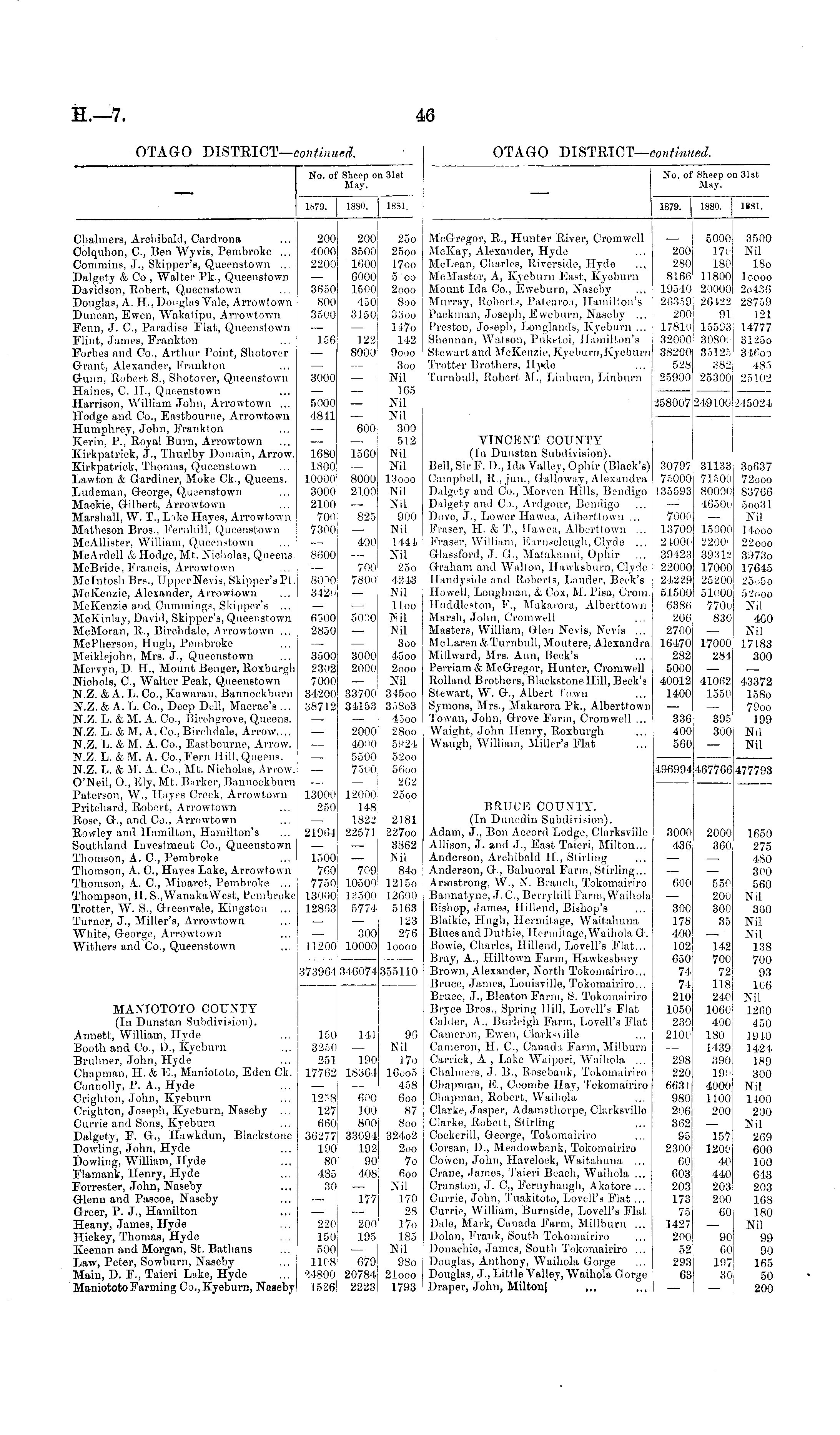 No. of Sheep on 31st May. 1»79. I 1S80. I 1831. Chalmers, Archibald, Cmdrona Colquhon, C, Ben Wyvii, Pembroke ... Commits, J., Skipper's, Queenstown ... Dalgety & Co , Walter Pk., Qiieenstown Davidson, Robert, Queenatown Douglas, A. H.,Douglas Yale, Arrowtown Duncan, Ewen, Wakalipu, Arrow (own Fenn, J. O.| Paradise Flat, Qiieenstown Flint, James, Frankton Forbes nnd Co., Arthur Point, Shotover Grant, Alexander, Frankton G-iinn, Robert S., Shotover, Queenetown Haines, C. if., Queenetown Harrison, William John, AiTOwtown ... Hodge and Co., Eastbourne, Arrowtown Humphrey, John, Frankloii Kerin, P., Royal Burn, Arrowtown Kirkpatrick, J., Thurlby Dorcnin, Arrow. Kirkpatn'ck, Thomas, Queenatown LawtOD & Gardiner, Moke Ck., Queens. Fjudeman, George, Q.ueenstown Maekie. Gilbert, Arrowtown Marshall, W. T., L ike Haves, Arrowlown ! Matlieson Bros., Feriihill, Qiieenstown McAllister, William, Queenatown McArdell & Hodge, Mt. Nicholas, Queens. M('Bride. Francis, Arrowtown Me rnloshBrs., Upper Nevis, Skipper's Pt, McKenzie, Alexander, Arrowtown McKenzie and Onmmings, Skipper's ... MeKinlay, David, Skipper's, Qiieenstown McMoran, 11., Birehdale, Arrowtown ... MePherson, Hugh, Pembroke Meiklejohn, Mrs. J., Queenstown Mervyn, I). It., Mount Benger, Roxburgh Nichols, C, Walter Peak, Q.ueenstown N.Z. & A. L. Co., Kawarau, Bannoekburn N.Z. & A. L. Co., Deep Dell, Macrae's... N.Z. L. & M. A. Co., Birohgrove, Queens. N.Z. L. & M. A. Co., Birchdale, Arrow... N.Z. L. & M. A. Co., Eastbourne, Arrow. N.Z. L. & M. A. Co., Fern Hill. Queens. N.Z. L. & M. A. Co., Mt. Nieholiis, A now. O'Neil, O., iCIy. Mt. Barker, Bannookburn Patcrson, W., Hayes Creek, Arrowtown Pritehiird, Robert, Arrowtown Rose, G., and Co., Arrowtown Rowley and Hamilton, Hamilton's Southland Investment Co., Queenstown Thomson, A. 0., Pembroke riiomson, A. C, Haves Lake, Arrowtown j'homson, A. C, Minaret, Pembroke ... Ihompson, H, S.,Wanaka\Vest, Pembroke Protter, W. S., Greenvale, Kingston .Turner, J., Miller's, Arrowtown White, George, Arrowtown Withers and Co., Qiieenstown 200 4000 2200 3650 800 3500 156 3000 5000 4811 1680 1800 10000 3000 2100 70! 1 7300 8600 8Of>o 3420 200; 3500 lfiOO 6000 1500 450! 3150 122 8000; GOO 1500 8000 2100 825 400 700 7800 5or,'O 25o 2600 17oo 5 00 2ooo 800 Siioo 117o 142 9o'.)o 800 Nil 105 Nil Nil 300 512 Nil Nil 13ooo Nil Nil 900 Nil 1441 Nil 25o 4243 Nil 1100 Nil Nil 3 DO 45oo 2ooo Nil 3l5oo 838o3 45oo 2 800 5P24 52oo B60O 202 25oo 6500 2850 3500 2302 7000 31200 38712 3000 2000 33700 31153 2000 40110 5500 7500 13000 250 12000! 148! 18221 22571' 2181 227oo 3862 Nil 84o 1215o 12600 5163 123 276 21964 1500 760! 775o! 13000 12863 700 10500 13500 577-I-11200 300 10000 I0000 373964 846074 355110 MANIOTOTO COUNTY (In Dunstan Subdivision). Annett, William, Hyde Booth and Co., IX, Kyeburn Bruhner, John, Hyde Chapman, H. & B., ManiotoLo, Eden Ck. Connolly, P. A., Hyde Crighton, John, Kyeburn Crighton, Joseph, Kyeburn, Naseby ... Currie and Sons, Kyeburn Dalgety, F. G., Hawkdim, Blackstone Rowling, John, Hyde Dowling, William, Hyde Flamank, ITenry, Hyde Forrester, John, Naseby Glenn and Pascoe, Naseby Greer, P. J., Hamilton Heany, James, Hyde Hiekey, Thomas, Hyde Keenan and Morgan, St. Bnthana Law, Peter, Sowhurn, Naseby Main, D. F., Taieri Lake, Hyde ManiototoFarming Co., Kyeburn, Naseby 150 3250 251 i 17762, 12.-8 127 660[ 36277 190 80 435 30 1 141 190 1 18864 _ I 600 1 ioo; 800| 83094 192 OOj 408 96 Nil 17o 16oo5 458 600 87 800 324o2 2oo r? ° nOO Nil 170 28 \7o 185 Nil 9So 21ooo 1793 177 220 ] 60 500! 1108] 21800 I.526 1 2 001 195! 679 20781, 2223
