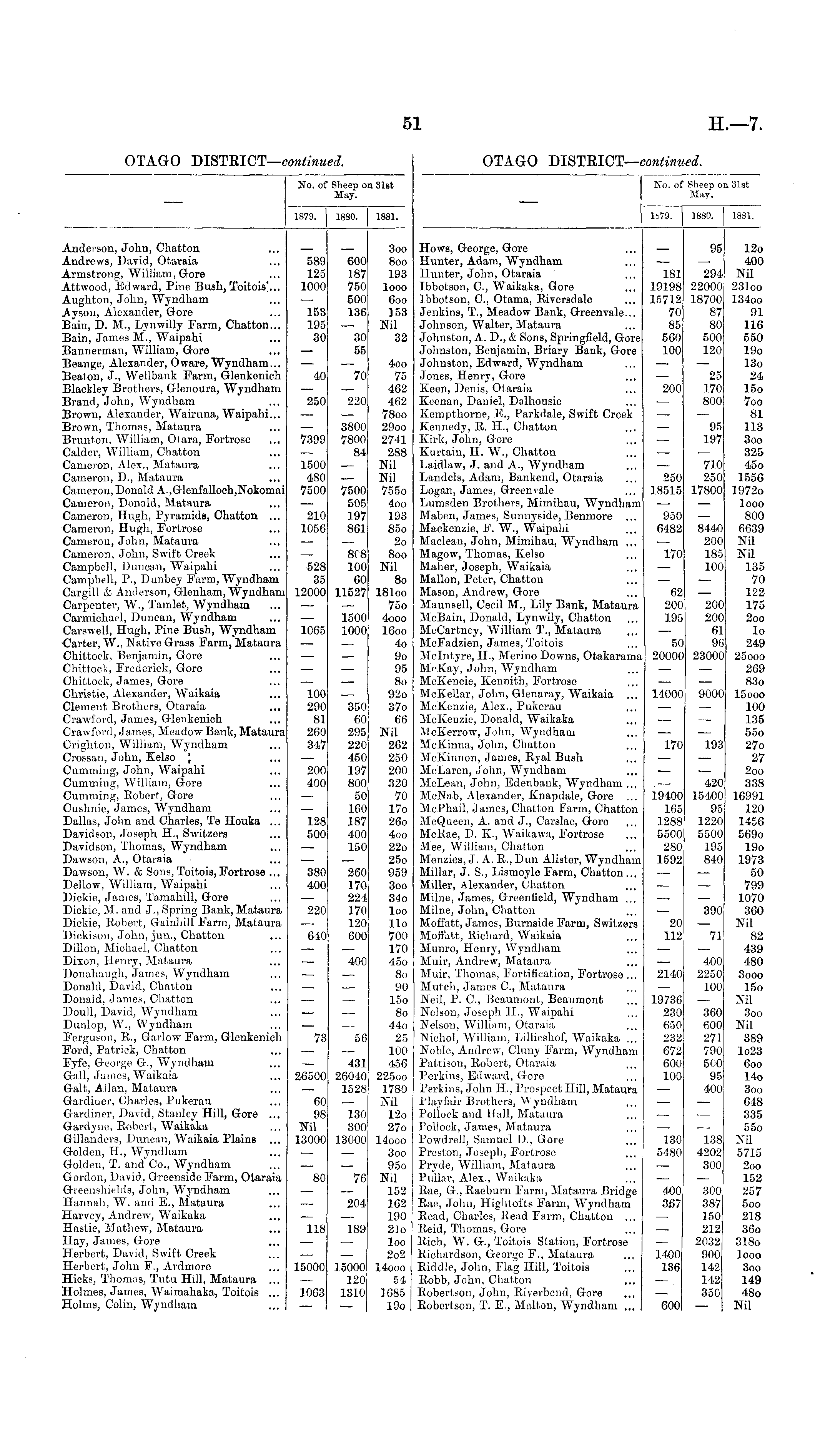 No. of Sheep on 31st May. 1879. I 1880. I 1881. Anderson, John, Chatton Andrews, David, Otaraia Armstrong, William, Gore Attwood, Edward, Pine Bush, Toitois'... Aughton, John, Wyndham Ayson, Alexander, Gore Bain, D. M., Lynwilly Farm, Chatton... Bain, James M., Waipahi Bannerman, William, G-ore Beange, Alexander, Oware, Wyndham... Beaton, J., Wellbank Farm, Glenkenich Blackley Brothers, Glenoura, Wyndham Brand, John, Wymlham Brown, Alexander, Wairuna, Waipahi... Brown, Thomas, Mataura Brunton, William, Oiara, Fortrose Calder, William, Chatton Cameron, Alex., Mataura Cameron, D., Mataura Cameron, Donald A.,Glenfalloch,Nokomai Cameron, Donald, Mataura Cameron, Hugh, Pyramids, Chatton ... Cameron, Hugh, Fortrose Cameron, John, Mataura Cameron, John, Swift Creek Campbell, Duncan, Waipahi Campbell, P., Dunbey Farm, Wyndham Cargill & Anderson, Glenham, Wyndham Carpenter, W., Tainlet, Wyndham Carmichael, Dunean, Wyndham Carswell, Hugh, Pine Bush, Wyndham Carter, W\, Native Grass Farm, Mataura Chittock, Benjamin, Gore Ohittock, Frederick, Gore Chittock, James, Gore Christie, Alexander, Waikaia Clement Brothers, Otaraia Crawford, James, Glonkenich Crawford, James, Meadow Bank, Mataura Crighton, William, Wyndham Crossan, John, Kolso ; Cutnu.ing, John, Waipahi dimming, William, Gore Cumming, Robert, Gore Cushnie, James, Wyndham Dallas, John and Charles, To Houka ... Davidson, Joseph H., Switzers Davidson, Thomas, Wyndham Dawson, A., Otaraia Dawson, W. & Sons,Toitois,Fortrose ... Dellow, William, Waipahi Dickie, James, Tamahul, Gore Dickie, M. and J., Spring Bank, Mataura Dickie, Robert, Guinbill Farm, Mataura Dickison, John, jun., Chatton Dillon, Michael, Chatton Dixon, Henry, Mataura Donahaugh, James, Wyndham Donald, David, Chatton Donald, James, Chatton Doull, David, Wyndham Dunlop, W., Wyndham Ferguson, R., Garlow Farm, Glenkenich Ford, Patrick, Chatton Fyf'e, George G., Wyndham Gall, James, Waikaia Gait, Allan, Mataura Gardiner, Charles, Pukerau Gardiner, David, Stanley Hill, Gore ... Gardyne, Robert, Waikaka Gillanders, Dunean, Waikaia Plains ... Golden, H., Wyndham Golden, T. and Co., Wyndham Gordon, David, Greenside Farm, Olaraia Greenshit'lds, John, Wyndham Hannah, W. and E., Mataura Harvey, Andrew, Waikaka Hastie, Matliew, Mataura Hay, James, Gore Herbert, David, Swift Creek Herbert, John F., Ardmore Hicks, Thomas, Tutu Hill, Mataura ... Holmes, James, Waimahaka, Toitois ... Holms, Colin, Wyndham 589 125 1000 153 195 30 40 250 7399 1500 480 7500 210 1056 528 35 12000 1065 100 290 81 260 347 200 400 600 187 750 500 136 30 55 70 220 3800 7800 84 7500 505 197 861 8C8 100 60 11527 1500 1000 350 60 295 220 450 197 800 50 160 187 400 150 3oo 8oo 193 looo 6oo 153 Nil 32 4oo 75 462 462 78oo 29oo 2741 288 Nil Nil 755o 4oo 193 85o 2o 8oo Nil 8o 181oo 75o do oo 16oo 4o 8o 95 8o 92o 37o C6 Nil 262 250 200 320 70 17o 26o 4oo 22o 25o 959 3oo 34o loo llo 700 170 45o 8o 90 loo 86 44o 25 100 456 225oo 1780 Nil 12o 27o 14ooo 3oo 95o Nil 152 162 190 21o loo 2o2 14ooo 64 1685 19o 128 500 380 400 260 170 224 170 120 600 220 640 400 73 56 26500 431 26010 1528 60 98 Nil 13000 130 300 13000 80 76 204 118 189 15000 15000 120 1310 1063