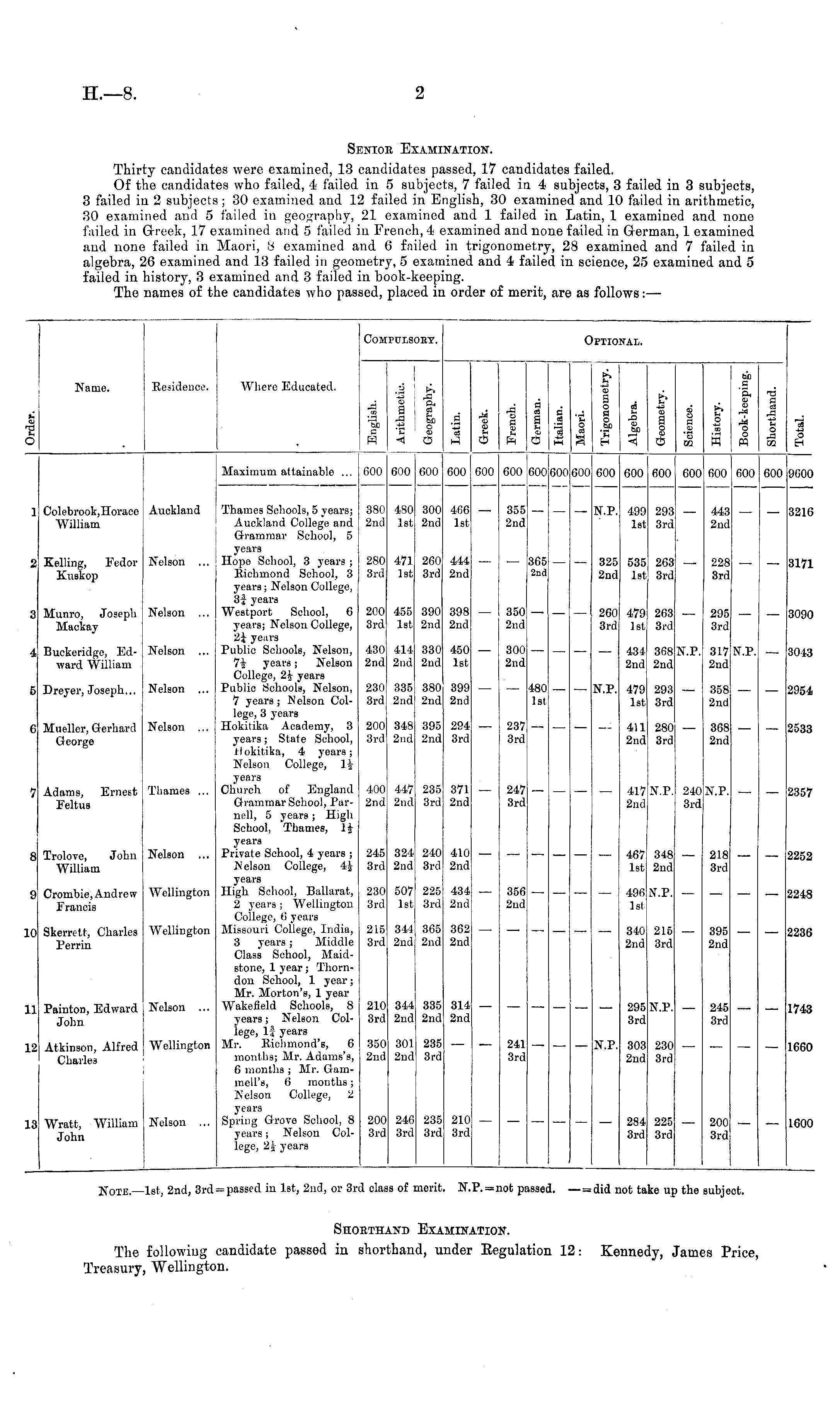 Senior Examination. Thirty candidates were examined, 13 candidates passed, 17 candidates failed. Of the candidates who failed, 4 failed in 5 subjects, 7 failed in 4 subjects, 3 failed in 3 subjects, 3 failed in 2 subjects; 30 examined and 12 failed in English, 30 examined and 10 failed in arithmetic, 30 examined and 5 failed in geography, 21 examined and 1 failed in Latin, 1 examined and none failed in Greek, 17 examined and 5 failed in French, 4 examined and none failed in German, 1 examined and none failed in Maori, 8 examined and 6 failed in trigonometry, 28 examined and 7 failed in algebra, 20 examined and 13 failed in geometry, 5 examined and 4 failed in science, 25 examined and 5 failed in history, 3 examined and 3 failed in book-keeping.