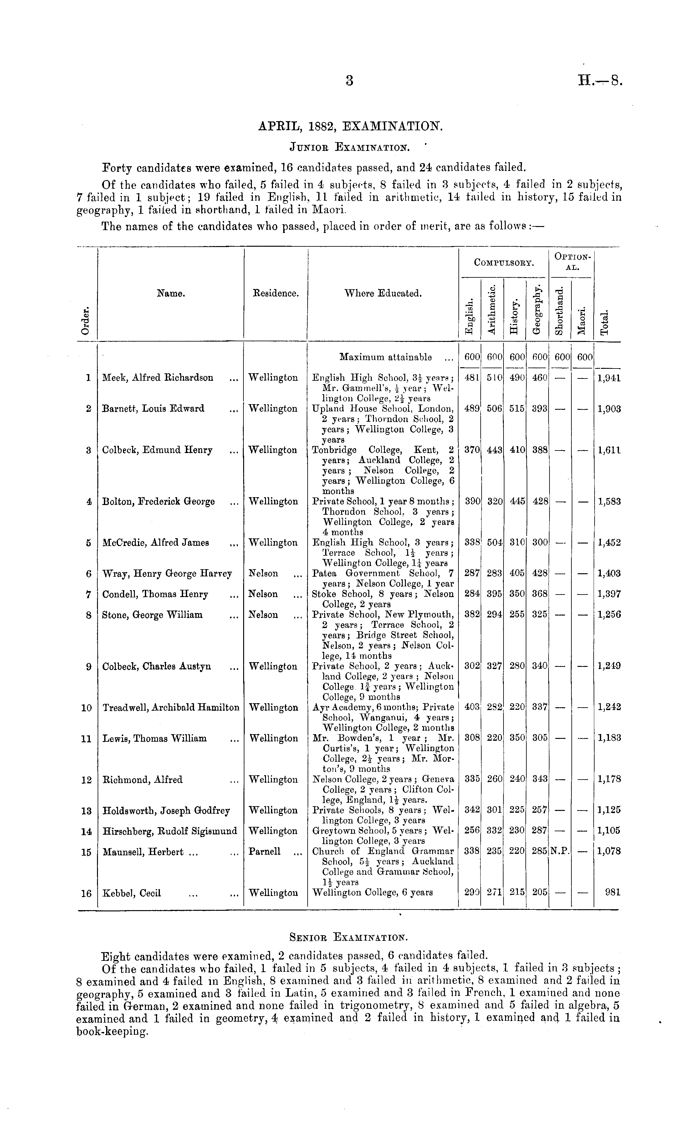 APRIL, 1882, EXAMINATION". Junior Examination. Forty candidates were examined, 16 candidates passed, and 24 candidates failed. Of the candidates who failed, 5 failed in 4 subjects, 8 failed in 3 subjects, 4 failed in 2 subjects, 7 failed in 1 subject; 19 failed in English, 11 failed in arithmetic, 14 failed in history, 15 failed in geography, 1 failed in shorthand, 1 tailed in Maori.