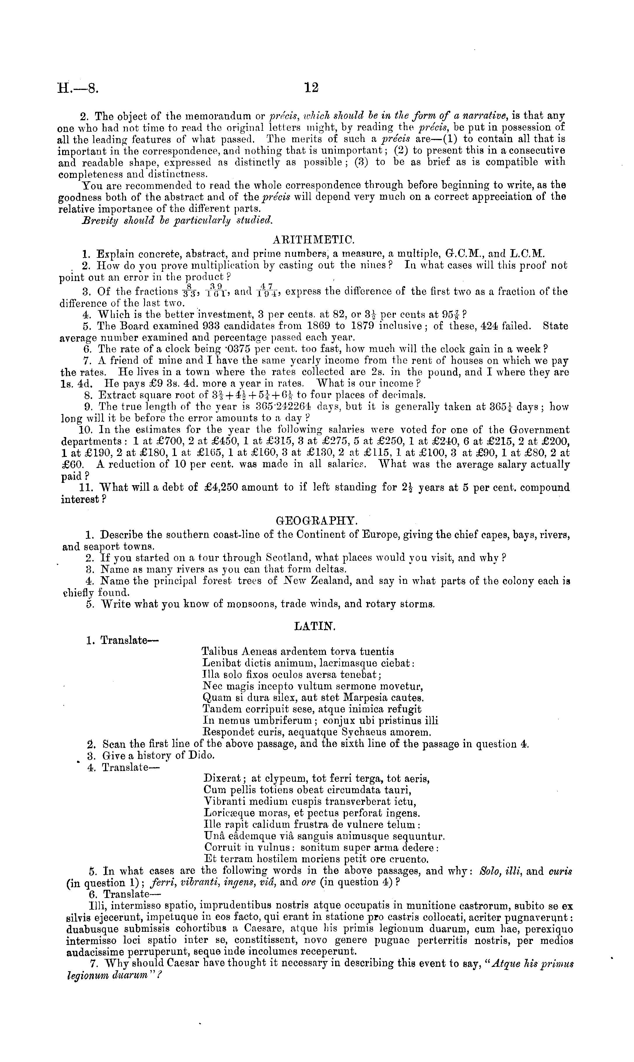 2. The object of the memorandum or precis, which should be in the form of a narrative, is that any one who had not time to read the original letters might, by reading the precis, be put in possession of all the leading features of what passed. The merits of such a precis arc —(1) to contain all that is important in the correspondence, and nothing that is unimportant; (2) to present this in a consecutive and readable shape, expressed as distinctly as possible ; (3) to be as brief as is compatible with completeness and distinctness. You are recommended to read the whole correspondence through before beginning to write, as the goodness both of the abstract and of the precis will depend very much on a correct appreciation of the relative importance of the different parts. Brevity should be particularly studied. ARITHMETIC. 1. Explain concrete, abstract, and prime numbers, a measure, a multiple, G.C.M., and L.C.M. 2. How do you prove multiplication by casting out the nines? In what cases will this proof not point out an error in the product ? 3. Of the fractions -gs, j'o'r, and 194, express the difference of the first two as a fraction of the difference of the last two. 4. Which is the better investment, 3 per cents, at 82, or 31 per cents at 95|- ? 5. The Board examined 933 candidates from 1869 to 1879 inclusive; of these, 424 failed. State average number examined and percentage passed each year. 6. The rate of a clock being '0375 per cent, too fast, how much will the clock gain in a week ? 7. A friend of mine and I have the same yearly income from the rent of houses on which we pay the rates. He lives in a town where the rates collected are 2s. in the pound, and I where they are Is. 4d, He pays £9 3s. 4d. more a year in rates. What is our income ? 8. Extract square root of 3-| + 4_+sl + 6J- to four places of decimals. 9. The true length of the year is 365*242264 days, but it is generally taken at 3C5j days; how long will it be before the error amounts to a day ? 10. In the estimates for the year the following salaries were voted for one of the Government departments : 1 at £700, 2 at £450, 1 at £315, 3 at £275, 5 at £250, 1 at £240, 6 at £215, 2 at £200, 1 at £190, 2 at £180, 1 at £105, 1 at £160, 3 at £130, 2 at £115, 1 at £100, 3 at £90, 1 at £80, 2 at £60. A reduction of 10 per cent, was made in all salaries. What was the average salai'y actually paid ? 11. What will a debt of £4,250 amount to if left standing for 2-_ years at 5 per cent, compound interest ? GEOGRAPHY. 1. Describe the southern coast-line of the Continent of Europe, giving the chief capes, bays, rivers, and seaport towns. 2. If you started on a tour through Scotland, what places would you visit, and why ? 8. Name as many rivers as you can that form deltas. 4. Name the principal forest trees of New Zealand, and say in what parts of the colony each is chiefly found. 5. Write what you know of monsoons, trade winds, and rotary storms. LATIN. 1. Translate— Talibus Aeneas ardentem torva tuentis Lenibat dictis animum, lacrimasque ciebat: Ilia solo fixos oculos aversa tcnebat; Nee magis incepto vultum sermone movetur, Quam si dura silex, aut stet Marpesia cautes. Tandem corripuit sese, atque inimica refugit In nemus umbriferum ; conjux übi pristinus illi Respondet curis, aequatque Sychaeus amorem. 2. Scan the first line of the above passage, and the sixth line of the passage in question 4. 3. Give a history of Dido. 4. Translate — Dixerat; at clypeum, tot ferri terga, tot aeris, Cum pellis totiens obeat circumdata tauri, Vibranti medium cuspis transverberat ictu, Loricajque moras, et pectus perforat ingens. Ille rapit calidum frustra de vulncre telum: Una, eademque via sanguis animusquc sequuntur. Corruit in vulnus: sonitum super anna dedere : Et terrain hostilem moriens petit ore cruento. 5. In what cases are the following words in the above passages, and why: Solo, illi, and curis (in question 1); ferri, vibranti, ingens, via, and ore (in question 4) ? 6. Translate — Illi, intermisso spatio, imprudentibus nostris atque occupatis in munitione castrorum, subito se ex silvis ejecerunt, impetuque in eos facto, gui erant in statione pro castris collocati, acriter pugnaverunt: duabusque submissis cohortibus a Caesare, atque his primis legionum duarum, cum hae, perexiquo intermisso loci spatio inter se, constitissent, novo genero puguao perterritis nostris, per medios audacissime perruperunt, sequo iude incolumes receperunt. 7. Why should Caesar have thought it necessary in describing this event to say, "Atque his primus legionum duarum " ?