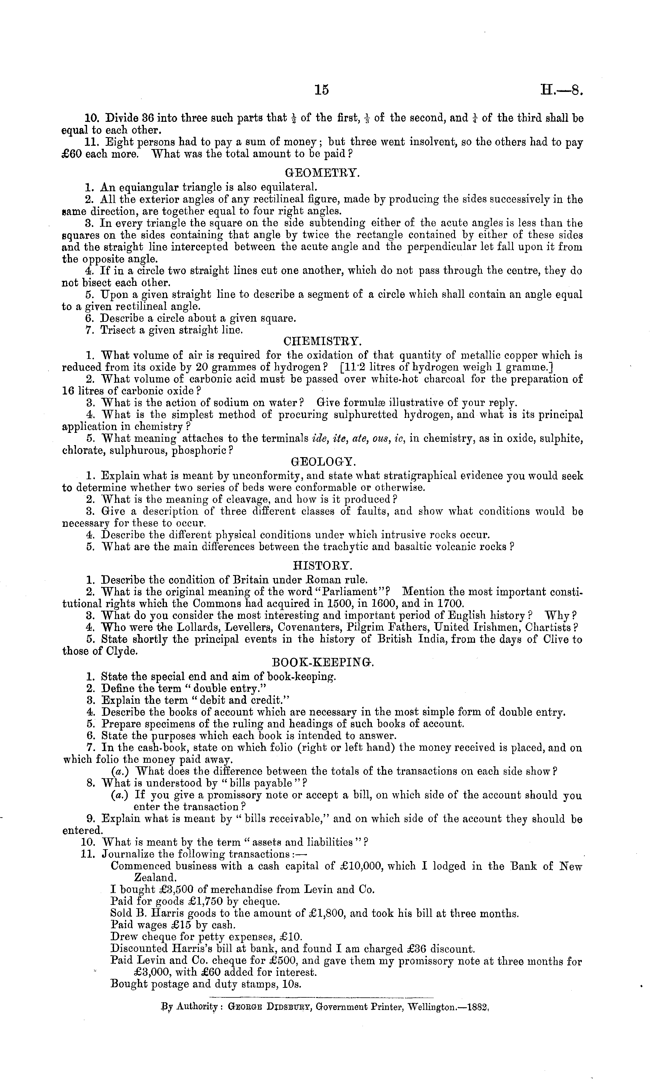 10. Divide 36 into three such parts that _ of the first, 1 of the second, and i of the third shall be equal to each other. 11. Eight persons had to pay a sum of money; but three went insolvent, so the others had to pay £60 each more. What was the total amount to be paid ? GEOMETRY. 1. An equiangular triangle is also equilateral. 2. All the exterior angles of any rectilineal figure, made by producing the sides successively in the same direction, are together equal to four right angles. 3. In every triangle the square on the side subtending either of the acute angles is less than the squares on the sides containing that angle by twice the rectangle contained by either of these sides and the straight line intercepted between the acute angle and the perpendicular let fall upon it from the opposite angle. 4. If in a circle two straight lines cut one another, which do not pass through the centre, they do not bisect each other. 5. Upon a given straight line to describe a segment of a circle which shall contain an angle equal to a given rectilineal angle. 6. Describe a circle about a given square. 7. Trisect a given straight line. CHEMISTRY. 1. What volume of air is required for the oxidation of that quantity of metallic copper which is reduced from its oxide by 20 grammes of hydrogen? [112 litres of hydrogen weigh 1 gramme.] 2. What volume of carbonic acid must be passed over white-hot charcoal for the preparation of 16 litres of carbonic oxide ? 3. What is the action of sodium on water ? Give formula? illustrative of your reply. 4. What is the simplest method of procuring sulphuretted hydrogen, and what is its principal application in chemistry ? 5. What meaning attaches to the terminals ide, ite, ate, ous, ie, in chemistry, as in oxide, sulphite, chlorate, sulphurous, phosphoric ? GEOLOGY. 1. Explain what is meant by unconformity, and state what strati graphical evidence you would seek to determine whether two series of beds were conformable or otherwise. 2. What is the meaning of cleavage, and how is it produced ? 3. Give a description of three different classes of faults, and show what conditions would be necessary for these to occur. 4. Describe the different physical conditions under which intrusive rocks occur. 5. What are the main differences between the trachytic and basaltic volcanic rocks ? HISTORY. 1. Describe the condition of Britain under Roman rule. 2. What is the original meaning of the word "Parliament"? Mention the most important constitutional rights which the Commons had acquired in 1500, in 1600, and in 1700. 3. What do you consider the most interesting and important period of English history ? Why ? 4. Who were the Lollards, Levellers, Covenanters, Pilgrim Fathers, United Irishmen, Chartists ? 5. State shortly the principal events in the history of British India, from the days of Clive to those of Clyde. BOOK-KEEPING. 1. State the special end and aim of book-keeping. 2. Define the term " double entry." 3. Explain the term " debit and credit." 4. Describe the books of account which are necessary in the most simple form of double entry. 5. Prepare specimens of the ruling and headings of such books of account. 6. State the purposes which each book is intended to answer. 7. In the cash-book, state on which folio (right or left hand) the money received is placed, and on which folio the money paid away. (a.) What does the difference between the totals of the transactions on each side show ? 8. What is understood by " bills payable " ? (a.) If you give a promissory note or accept a bill, on which side of the account should you enter the transaction ? 9. Explain what is meant by " bills receivable," and on which side of the account they should be entered. 10. What is meant by the term " assets and liabilities " ? 11. Journalize the following transactions : — Commenced business with a cash capital of £10,000, which I lodged in the Bank of New Zealand. I bought £3,500 of merchandise from Levin and Co. Paid for goods £1,750 by cheque. Sold B. Harris goods to the amount of £1,800, and took his bill at three months. Paid wages £15 by cash. Drew cheque for petty expenses, £10. Discounted Harris's bill at bank, and found I am charged £36 discount. Paid Levin and Co. cheque for £500, and gave them my promissory note at three months for £3,000, with £60 added for interest. Bought postage and duty stamps, 10s.