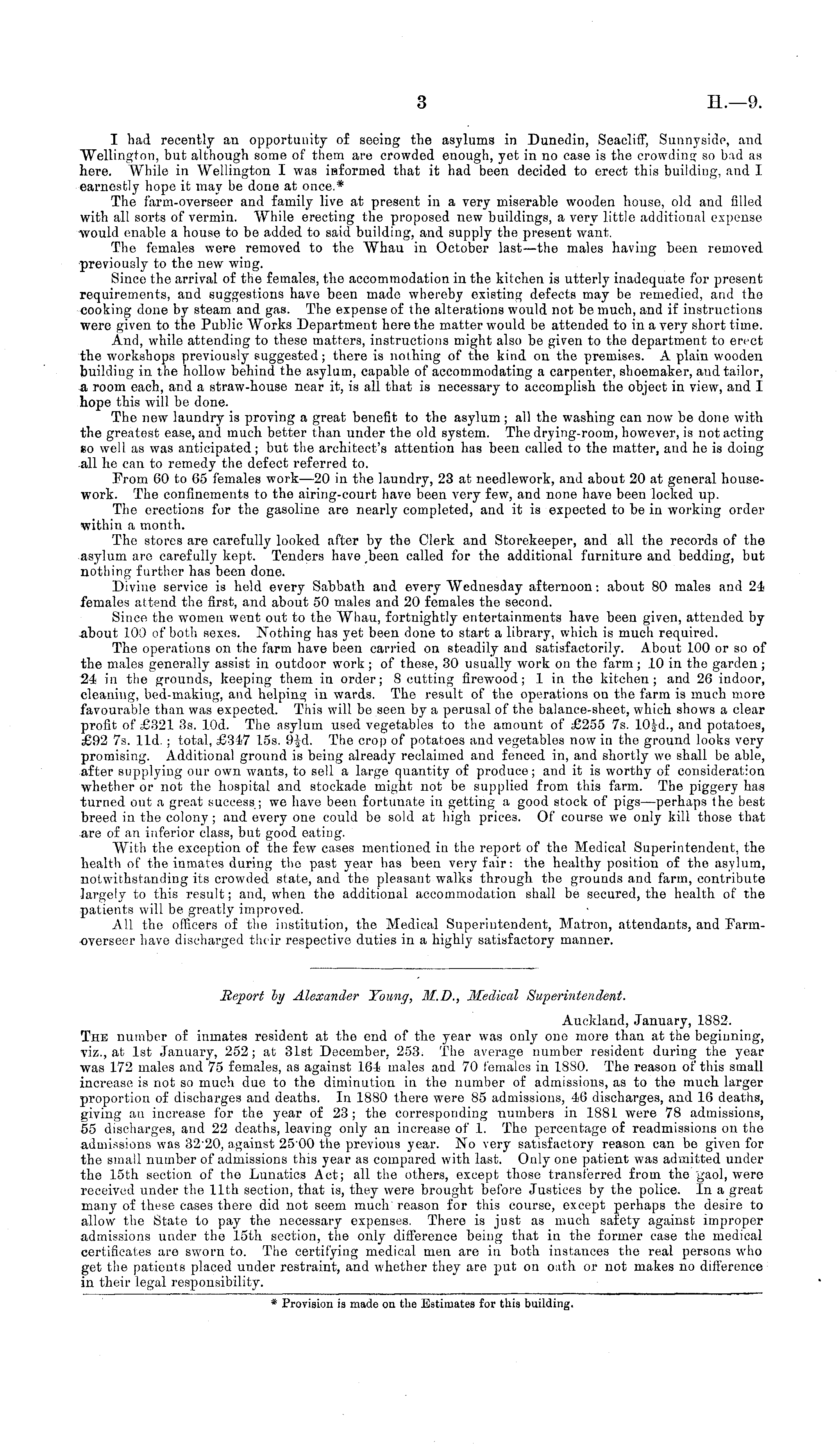 Beport by Alexander Young, M.D., Medical Superintendent. Auckland, January, 1882. The number of inmates resident at the end of the year was only one more than at the beginning, viz., at Ist January, 252; at 31st December. 253. The average number resident during the year was 172 males and 75 females, as against 164 males and 70 females in 1880. The reason of this small increase is not so much due to the diminution in the number of admissions, as to the much larger proportion of discharges and deaths. In 1880 there were 85 admissions, 46 discharges, and 16 deaths, giving an increase for the year of 23; the corresponding numbers in 1881 were 78 admissions, 55 discharges, and 22 deaths, leaving only an increase of 1. The percentage of readmissions on the admissions was 32'20, against 2500 the previous year. No very satisfactory reason can be given for the small number of admissions this year as compared with last. Only one patient was admitted under the 15th section of the Lunatics Act; all the others, except those transferred from the "gaol, were received under the 11th section, that is, they were brought before Justices by the police. In a great many of these cases there did not seem much reason for this course, except perhaps the desire to allow the State to pay the necessary expenses. There is just as much safety against improper admissions under the 15th section, the only difference being that in the former case the medical certificates are sworn to. The certifying medical men are in both instances the real persons who get the patients placed under restraint, and whether they are put on oath or not makes no difference in their legal responsibility.