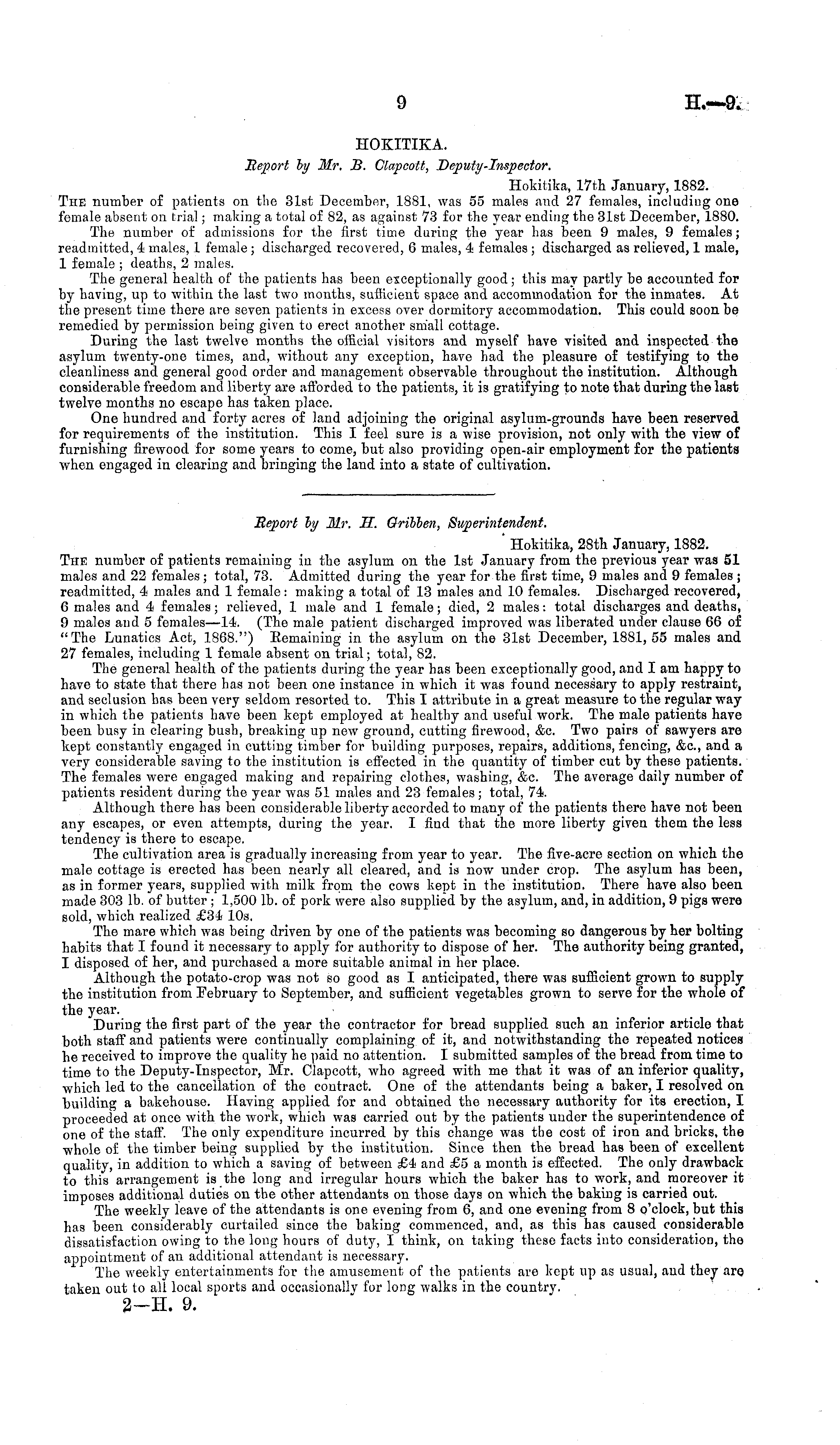 Beport by Mr. H. Gribben, Superintendent. ' Hokitika, 28th January, 1882. The number of patients remaining in the asylum on the Ist January from the previous year was 51 males and 22 females; total, 73. Admitted during the year for the first time, 9 males and 9 females ; readmitted, 4 males and 1 female: making a total of 13 males and 10 females. Discharged recovered, 6 males and 4 females; relieved, 1 male and 1 female; died, 2 males: total discharges and deaths, 9 males and 5 females—l4. (The male patient discharged improved was liberated under clause 66 of "The Lunatics Act, 1868.") Remaining in the asylum on the 31st December, 1881,55 males and 27 females, including 1 female absent on trial; total, 82. The general health of the patients during the year has been exceptionally good, and I am happy to have to state that there has not been one instance in which it was found necessary to apply restraint, and seclusion has been very seldom resorted to. This I attribute in a great measure to the regular way in which the patients have been kept employed at healthy and useful work. The male patients have been busy in clearing bush, breaking up new ground, cutting firewood, &c. Two pairs of sawyers are kept constantly engaged in cutting timber for building purposes, repairs, additions, fencing, &c, and a very considerable saving to the institution is effected in the quantity of timber cut by these patients. The females were engaged making and repairing clothes, washing, &c. The average daily number of patients resident during the year was 51 males and 23 females; total, 74. Although there has been considerable liberty accorded to many of the patients there have not been any escapes, or even attempts, during the year. I find that the more liberty given them the less tendency is there to escape. The cultivation area is gradually increasing from year to year. The five-acre section on which the male cottage is erected has been nearly all cleared, and is now under crop. The asylum has been, as in former years, supplied with milk from the cows kept in the institution. There have also been made 303 lb. of butter ; 1,500 lb. of pork were also supplied by the asylum, and, in addition, 9 pigs were sold, which realized £34 10s. The mare which was being driven by one of the patients was becoming so dangerous by her bolting habits that I found it necessary to apply for authority to dispose of her. The authority being granted, I disposed of her, and purchased a more suitable animal in her place. Although the potato-crop was not so good as I anticipated, there was sufficient grown to supply the institution from Pebruary to September, and sufficient vegetables grown to serve for the whole of the year. During the first part of the year the contractor for bread supplied such an inferior article that both staff and patients were continually complaining of it, and notwithstanding the repeated notices he received to improve the quality he paid no attention. I submitted samples of the bread from time to time to the Deputy-Inspector, Mr. Clapcott, who agreed with me that it was of an inferior quality, which led to the cancellation of the contract. One of the attendants being a baker, I resolved on building a bakehouse. Having applied for and obtained the necessary authority for its erection, I proceeded at once with the work, which was carried out by the patients under the superintendence of one of the staff. The only expenditure incurred by this change was the cost of iron and bricks, the whole of the timber being supplied by the institution. Since then the bread has been of excellent quality, in addition to which a saving of between £4 and £5 a month is effected. The only drawback to this arrangement is the long and irregular hours which the baker has to work, and moreover it imposes additional duties on the other attendants on those days on which the baking is carried out. The weekly leave of the attendants is one evening from 6, and one evening from 8 o'clock, but this has been considerably curtailed since the baking commenced, and, as this has caused considerable dissatisfaction owing to the long hours of duty, I think, on taking these facts into consideration, the appointment of an additional attendant is necessary. The weekly entertainments for the amusement of the patients are kept up as usual, and they are taken out to all local sports and occasionally for long walks in the country. 2-H. 9.