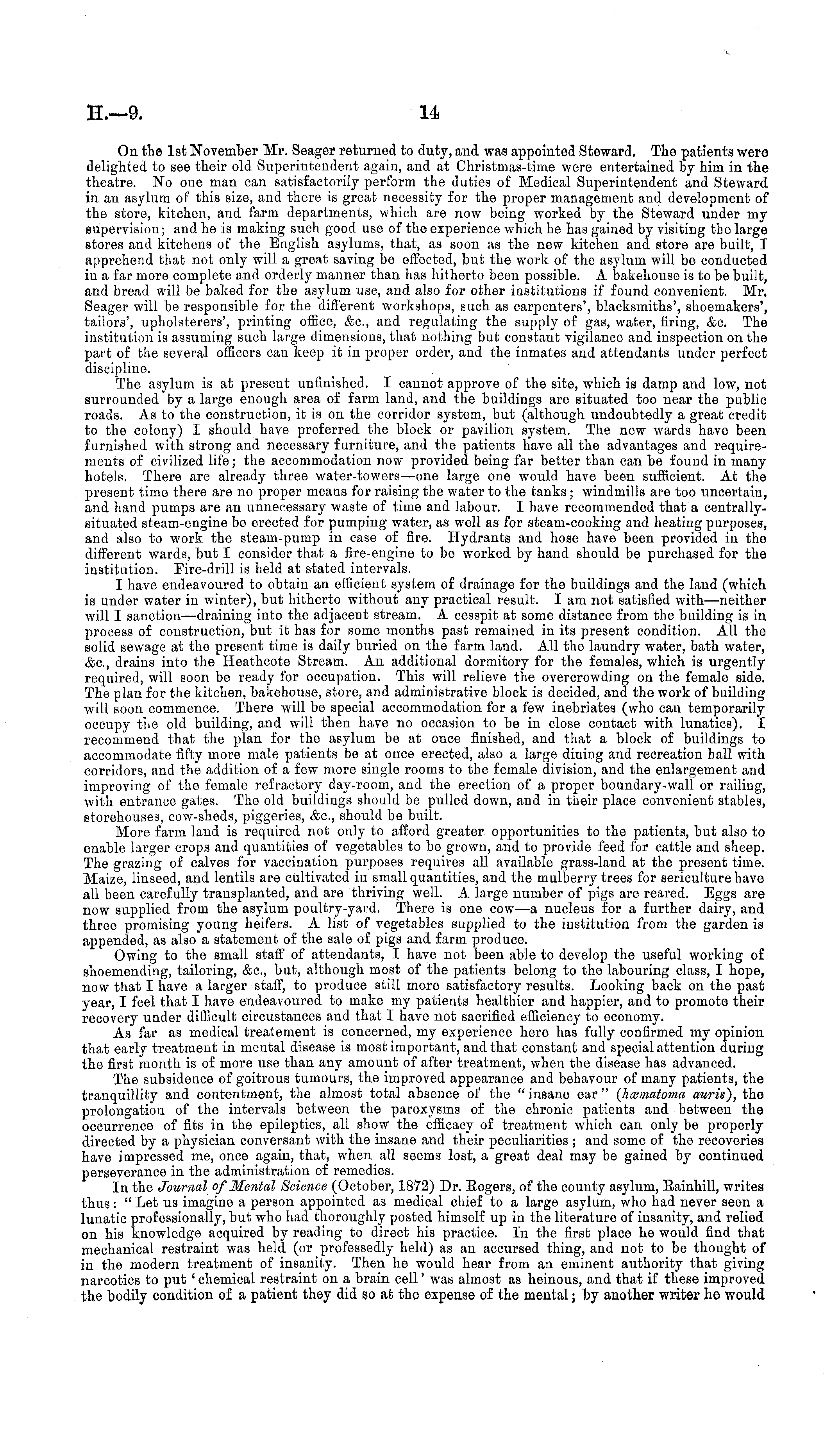 On the Ist November Mr. Seager returned to duty, and was appointed Steward. The patients were delighted to see their old Superintendent again, and at Christmas-time were entertained by him in the theatre. No one man can satisfactorily perform the duties of Medical Superintendent and Steward in an asylum of this size, and there is great necessity for the proper management and development of the store, kitchen, and farm departments, which are now being worked by the Steward under my supervision; and he is making such good use of the experience which he has gained by visiting the large stores and kitchens of the English asylums, that, as soon as the new kitchen and store are built, I apprehend that not only will a great saving be effected, but the work of the asylum will be conducted in a far more complete and orderly manner than has hitherto been possible. A bakehouse is to be built, and bread will be baked for the asylum use, and also for other institutions if found convenient. Mr. Seager will be responsible for the different workshops, such as carpenters', blacksmiths', shoemakers', tailors', upholsterers', printing office, &c, and regulating the supply of gas, water, firing, &c. The institution is assuming such large dimensions, that nothing but constant vigilance and inspection on the part of the several officers can keep it in proper order, and the inmates and attendants under perfect discipline. The asylum is at present unfinished. I cannot approve of the site, which is damp and low, not surrounded by a large enough area of farm land, and the buildings are situated too near the public roads. As to the construction, it is on the corridor system, but (although undoubtedly a great credit to the colony) I should have preferred the block or pavilion system. The new wards have been furnished with strong and necessary furniture, and the patients have all the advantages and requirements of civilized life; the accommodation now provided being far better than can be found in many hotels. There are already three water-towers —one large one would have been sufficient. At the present time there are no proper means for raising the water to the tanks ; windmills are too uncertain, and hand pumps are an unnecessary waste of time and labour. I have recommended that a centrallysituated steam-engine be erected for pumping water, as well as for steam-cooking and heating purposes, and also to work the steam-pump in case of fire. Hydrants and hose have been provided in the different wards, but I consider that a fire-engine to be worked by hand should be purchased for the institution. Pire-drill is held at stated intervals. I have endeavoured to obtain an efficient system of drainage for the buildings and the land (which is under water in winter), but hitherto without any practical result. lam not satisfied with —neither will I sanction —draining into the adjacent stream. A cesspit at some distance from the building is in process of construction, but it has for some months past remained in its present condition. All the solid sewage at the present time is daily buried on the farm land. All the laundry water, bath water, &c., drains into the Heathcote Stream. An additional dormitory for the females, which is urgently required, will soon be ready for occupation. This will relieve the overcrowding on the female side. The plan for the kitchen, bakehouse, store, and administrative block is decided, and the work of building will soon commence. There will be special accommodation for a few inebriates (who can temporarily occupy the old building, and will then have no occasion to be in close contact with lunatics). I recommend that the plan for the asylum be at once finished, and that a block of buildings to accommodate fifty more male patients be at once erected, also a large dining and recreation hall with corridors, and the addition of a few more single rooms to the female division, and the enlargement and improving of the female refractory day-room, and the erection of a proper boundary-wall or railing, with entrance gates. The old buildings should be pulled down, and in their place convenient stables, storehouses, cow-sheds, piggeries, &c, should be built. More farm land is required not only to afford greater opportunities to the patients, but also to enable larger crops and quantities of vegetables to be grown, and to provide feed for cattle and sheep. The grazing of calves for vaccination purposes requires all available grass-land at the present time. Maize, linseed, and lentils are cultivated in small quantities, and the mulberry trees for sericulture have all been carefully transplanted, and are thriving well. A large number of pigs are reared. Eggs are now supplied from the asylum poultry-yard. There is one cow —a nucleus for a further dairy, and three promising young heifers. A list of vegetables supplied to the institution from the garden is appended, as also a statement of the sale of pigs and farm produce. Owing to the small staff of attendants, I have not been able to develop the useful working of shoemending, tailoring, &c, but, although most of the patients belong to the labouring class, I hope, now that I have a larger staff, to produce still more satisfactory results. Looking back on the past year, I feel that I have endeavoured to make my patients healthier and happier, and to promote their recovery under difficult circustances and that I have not sacrified efficiency to economy. As far as medical treatement is concerned, my experience here has fully confirmed my opinion that early treatment in mental disease is most important, and that constant and special attention during the first month is of more use than any amount of after treatment, when the disease has advanced. The subsidence of goitrous tumours, the improved appearance and behavour of many patients, the tranquillity and contentment, the almost total absence of the "insane ear" (hamatoma auris), the prolongation of the interval