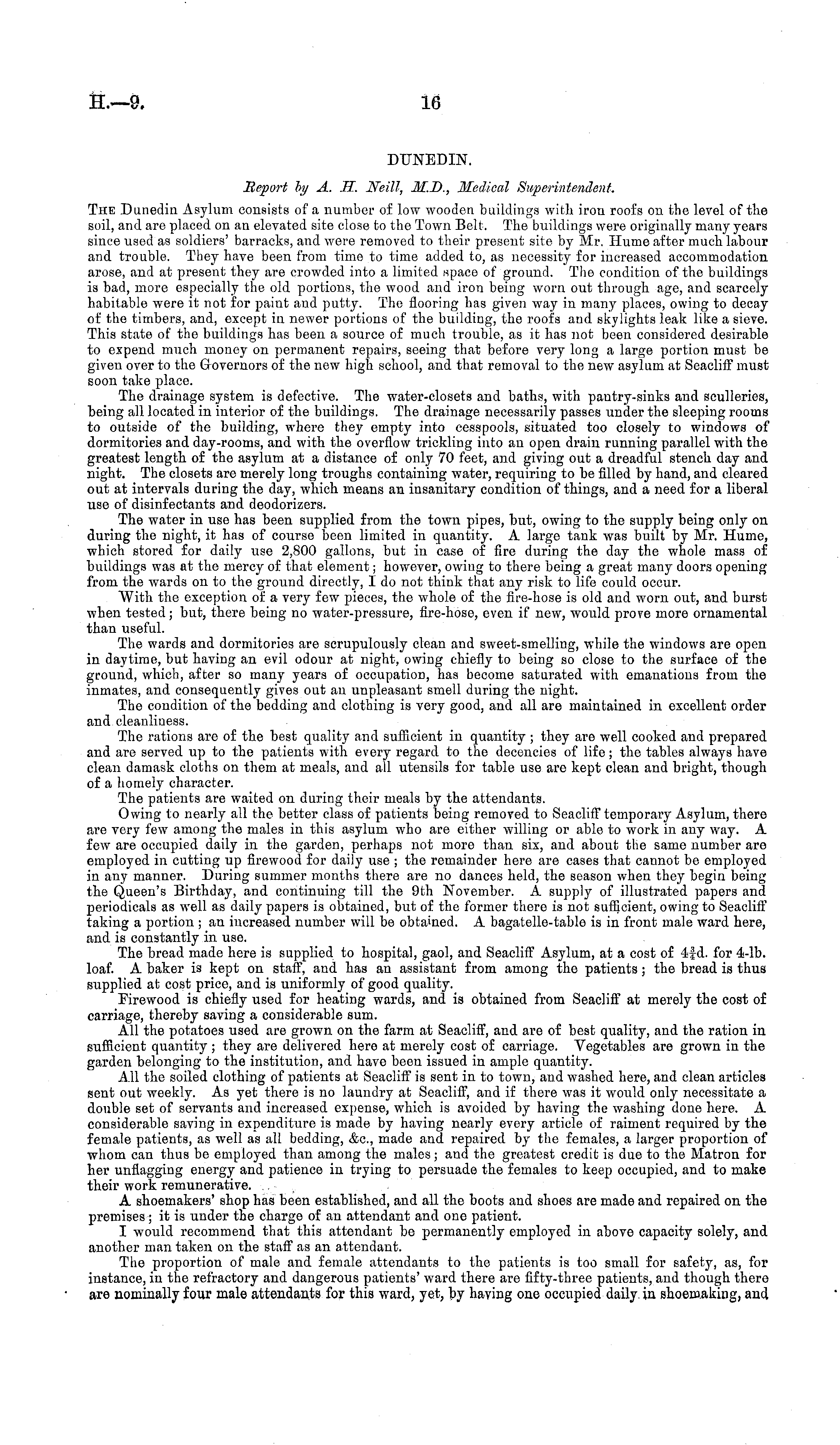 DUNEDIN. Beport by A. H. Neill, M.D., Medical Superintendent. The Dunedin Asylum consists of a number of low wooden buildings with iron roofs on the level of the soil, and are placed on an elevated site close to the Town Belt. The buildings were originally many years since used as soldiers' barracks, and were removed to their present site by Mr. Hume after much labour and trouble. They have been from time to time added to, as necessity for increased accommodation arose, and at present they are crowded into a limited space of ground. The condition of the buildings is bad, more especially the old portions, the wood and iron being worn out through age, and scarcely habitable were it not for paint and putty. The flooring has given way in many places, owing to decay of the timbers, and, except in newer portions of the building, the roofs and skylights leak like a sieve. This state of the buildings has been a source of much trouble, as it has not been considered desirable to expend much money on permanent repairs, seeing that before very long a large portion must be given over to the Governors of the new high school, and that removal to the new asylum at Seacliff must soon take place. The drainage system is defective. The water-closets and baths, with pantry-sinks and sculleries, being all located in interior of the buildings. The drainage necessarily passes under the sleeping rooms to outside of the building, where they empty into cesspools, situated too closely to windows of dormitories and day-rooms, and with the overflow trickling into an open drain running parallel with the greatest length of the asylum at a distance of only 70 feet, and giving out a dreadful stench day and night. The closets are merely long troughs containing water, requiring to be filled by hand, and cleared out at intervals during the day, which means an insanitary condition of things, and a need for a liberal use of disinfectants and deodorizers. The water in use has been supplied from the town pipes, but, owing to the supply being only on during the night, it has of course been limited in quantity. A large tank was built by Mr. Hume, which stored for daily use 2,800 gallons, but in case of fire during the day the whole mass of buildings was at the mercy of that element; however, owing to there being a great many doors opening from the wards on to the ground directly, I do not think that any risk to life could occur. With the exception of a very few pieces, the whole of the fire-hose is old and worn out, and burst when tested ; but, there being no water-pressure, fire-hose, even if new, would prove more ornamental than useful. The wards and dormitories are scrupulously clean and sweet-smelling, while the windows are open in daytime, but having an evil odour at night, owing chiefly to being so close to the surface of the ground, which, after so many years of occupation, has become saturated with emanations from the inmates, and consequently gives out an unpleasant smell during the night. The condition of the bedding and clothing is very good, and all are maintained in excellent order and cleanliness. The rations are of the best quality and sufficient in quantity ; they are well cooked and prepared and are served up to the patients with every regard to the decencies of life; the tables always have clean damask cloths on them at meals, and all utensils for table use are kept clean and bright, though of a homely character. The patients are waited on during their meals by the attendants. Owing to nearly all the better class of patients being removed to Seacliff temporary Asylum, there are very few among the males in this asylum who are either willing or able to work in any way. A few are occupied daily in the garden, perhaps not more than six, and about the same number are employed in cutting up firewood for daily use ; the remainder here are cases that cannot be employed in any manner. During summer months there are no dances held, the season when they begin being the Queen's Birthday, and continuing till the 9th November. A supply of illustrated papers and periodicals as well as daily papers is obtained, but of the former there is not sufficient, owing to Seacliff taking a portion ; an increased number will be obtained. A bagatelle-table is in front male ward here, and is constantly in use. The bread made here is supplied to hospital, gaol, and Seacliff Asylum, at a cost of 4fd. for 4-lb. loaf. A baker is kept on staff, and has an assistant from among the patients; the bread is thus supplied at cost price, and is uniformly of good quality. Pirewood is chiefly used for heating wards, and is obtained from Seacliff at merely the cost of carriage, thereby saving a considerable sum. All the potatoes used are grown on the farm at Seacliff, and are of best quality, and the ration in sufficient quantity ; they are delivered here at merely cost of carriage. Vegetables are grown in the garden belonging to the institution, and have been issued in ample quantity. All the soiled clothing of patients at Seacliff is sent in to town, and washed here, and clean articles gent out weekly. As yet there is no laundry at Seacliff, and if there was it would only necessitate a double set of servants and increased expense, which is avoided by having the washing done here. A considerable saving in expenditure is made by having nearly every article of raiment required by the female patients, as well as all bedding, &c, made and repaired by the females, a larger proportion of whom can thus be employed than among the males; and the greatest credit is due to the Matron for her unflagging energy and patience in trying to persuade the females to keep occupied, and to make their work remunerative. ~».., A shoemakers' shop has been established, and all the boots and shoes are made and repaired on the premises; it is under the charge of an attendant and one patient. I would recommend that this attendant be permanently employed in above capacity solely, a